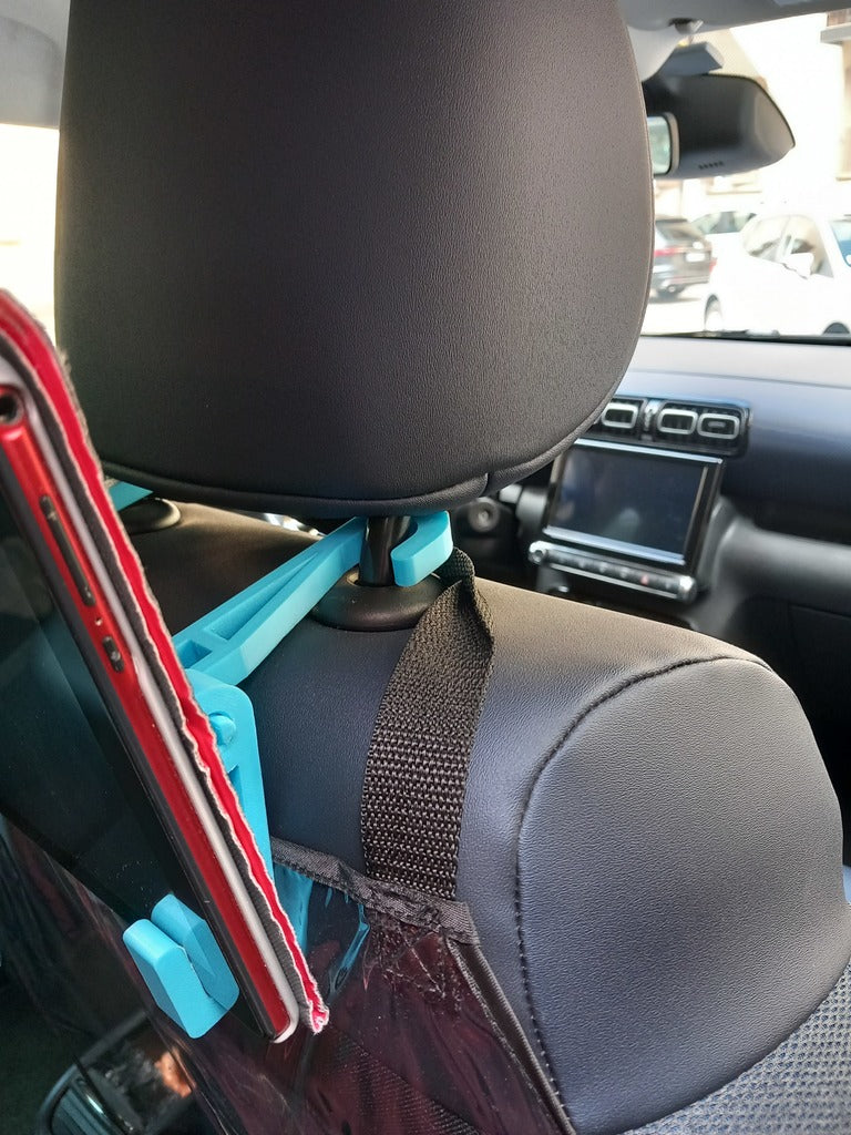 This tablet holder is designed to provide entertainment for rear-seat passengers during car journeys. It easily mounts to the headrest of the car's front seat and securely holds a tablet in place. The holder is compatible with tablets that have a cover on and can accommodate a width of up to 14 mm. It ensures that your tablet remains stably attached, even while driving, offering a convenient viewing experience for movies, games, or other digital activities. An ideal solution for making long trips more comfortable for passengers.
