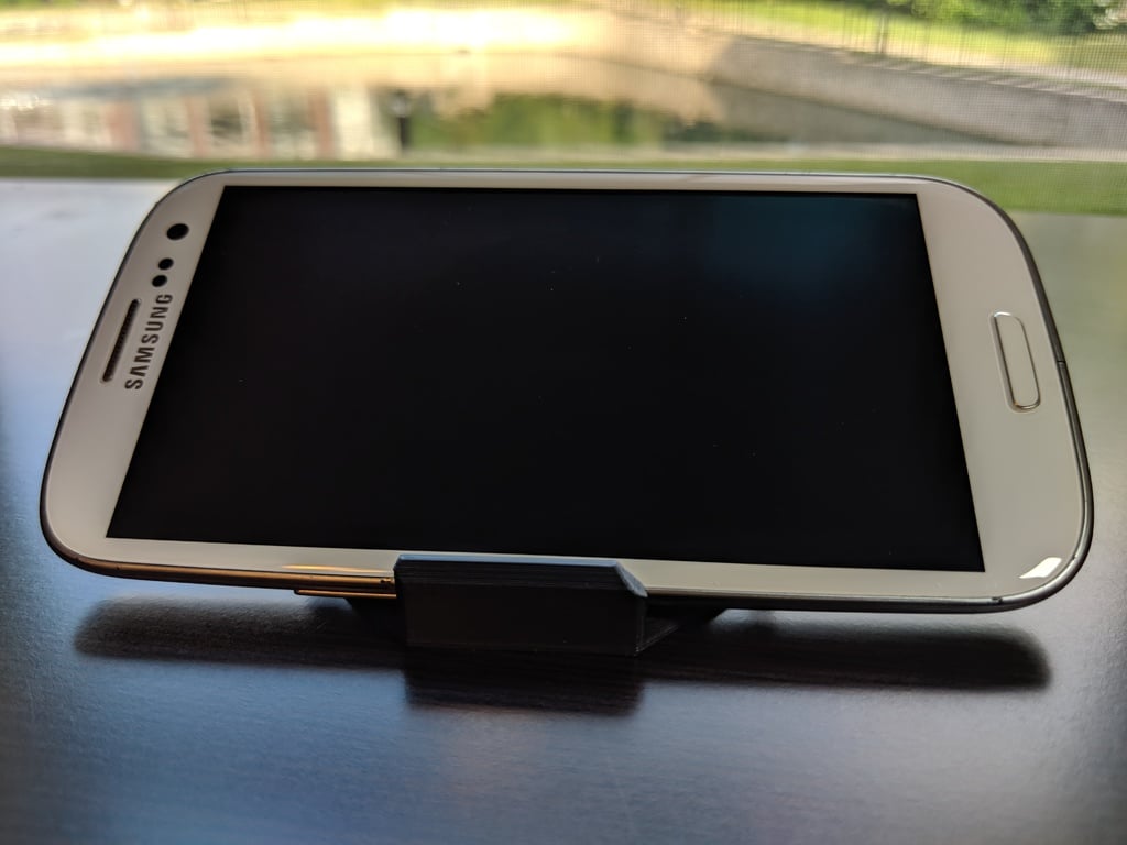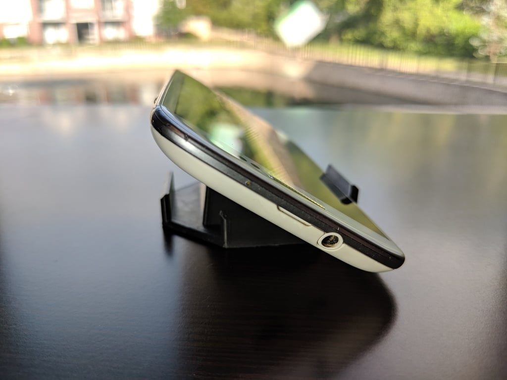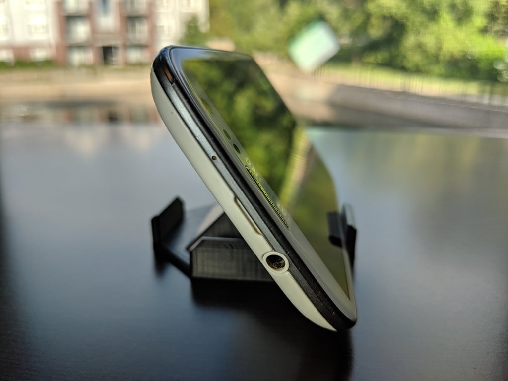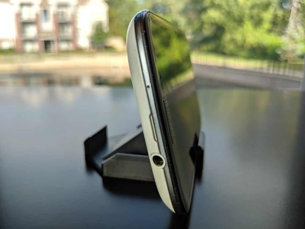 A portable phone holder with 4 adjustable angles: 34°, 45°, 57°, and 80°. This small, robust, and lightweight stand fits 99% of phones, including non-bulky cases (the total allowed thickness is 10mm or .4in).