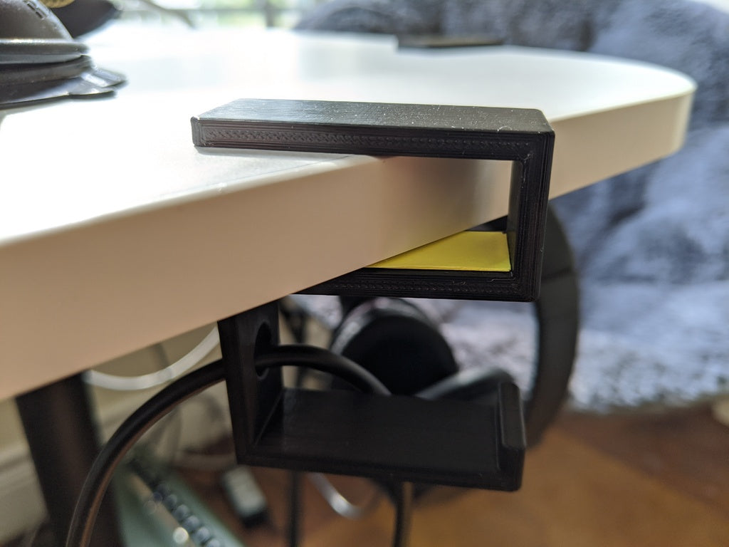 This is a remixed version of a hook designed for the IKEA BEKANT desk. The original hook was too small, so this version has a wider top hook. It fits perfectly using a couple of post-it notes to tighten it up.