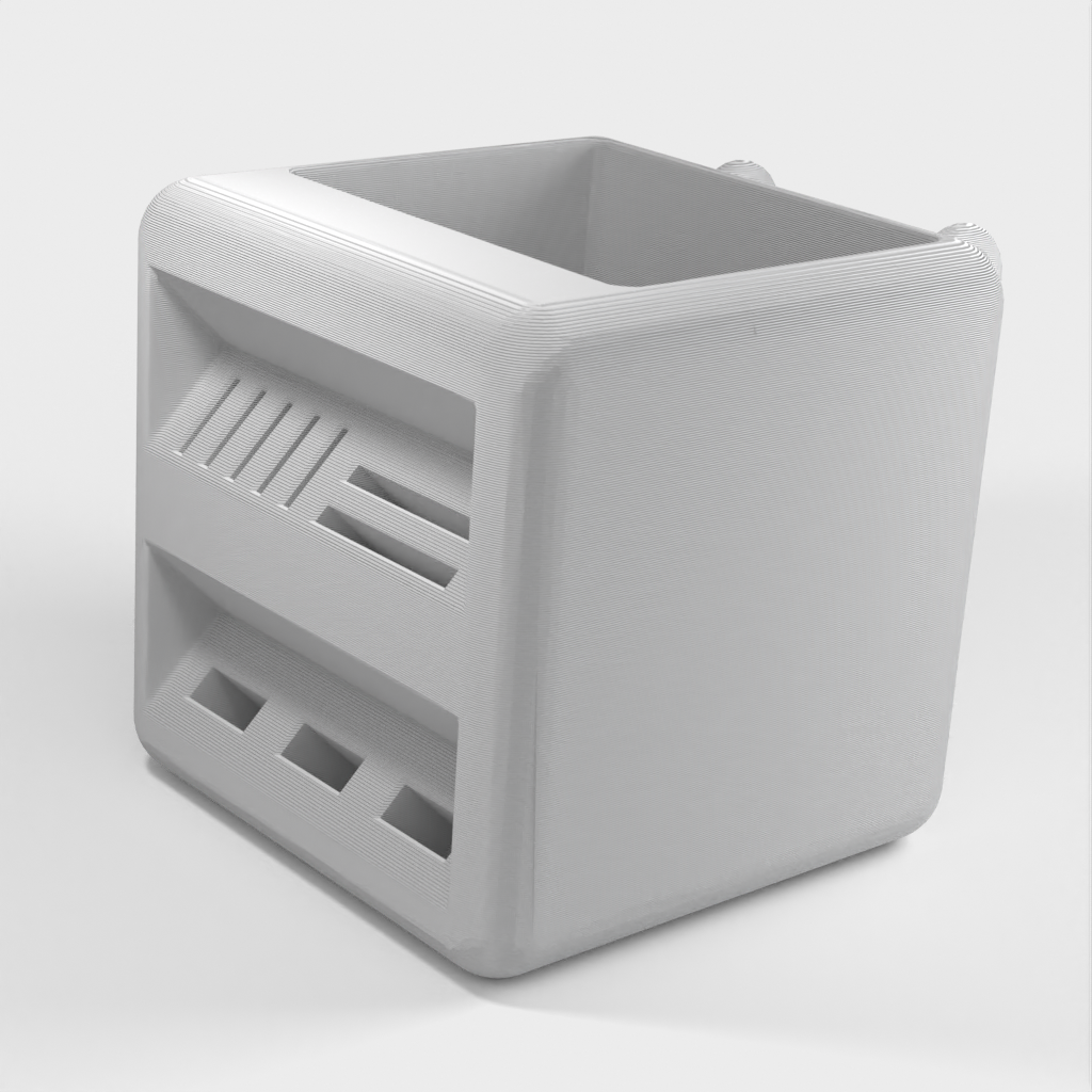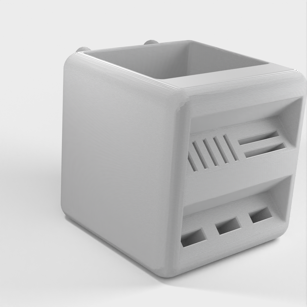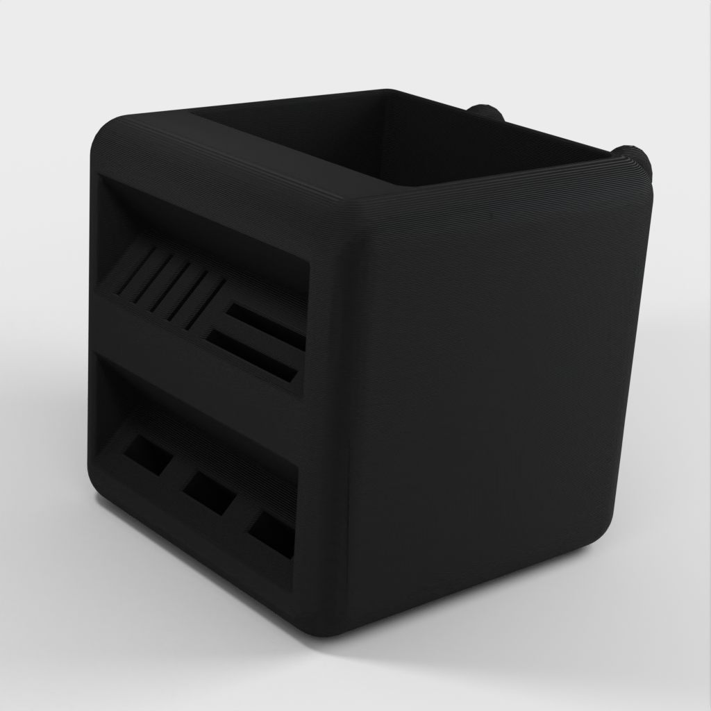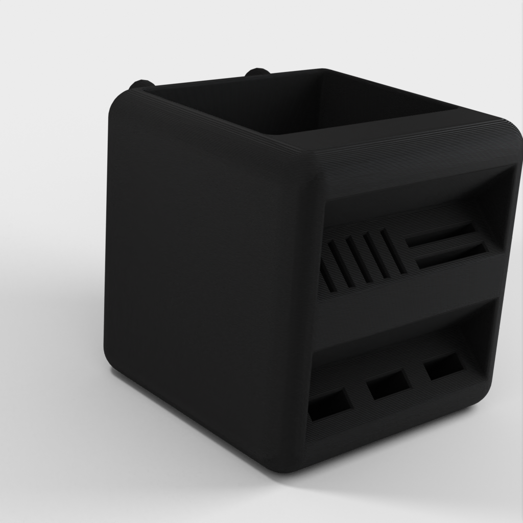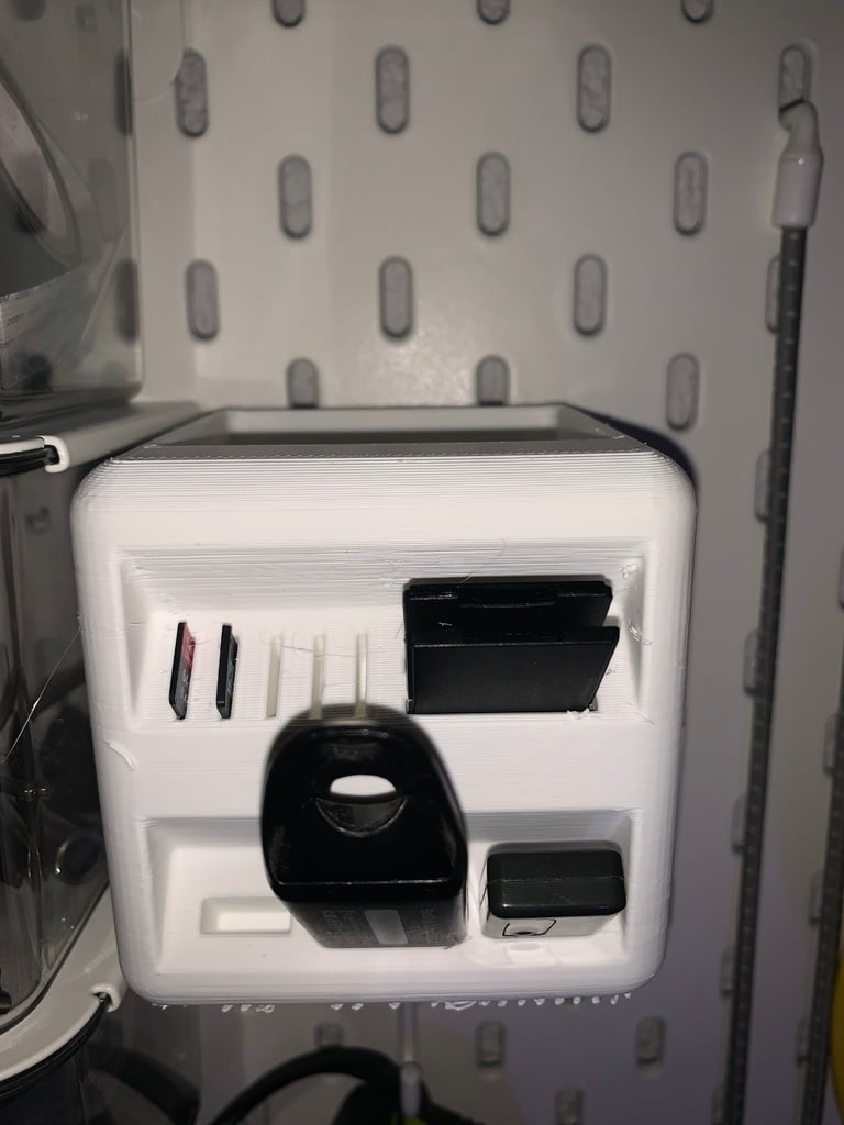 Pen holder designed to fit the Ikea Skadis pegboards. This holder offers a practical and spacious solution for organizing your pens and SD cards. By providing a neat and organized storage solution, this holder helps keep your desk tidy.