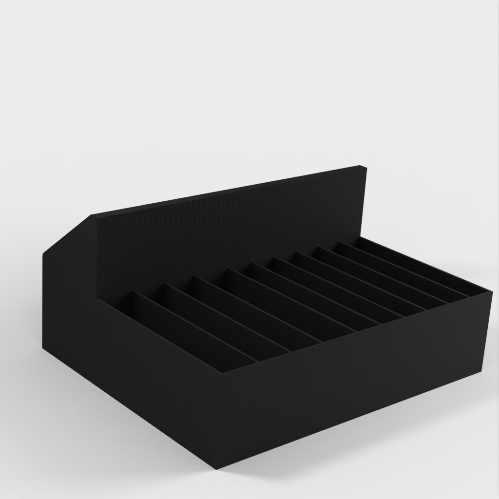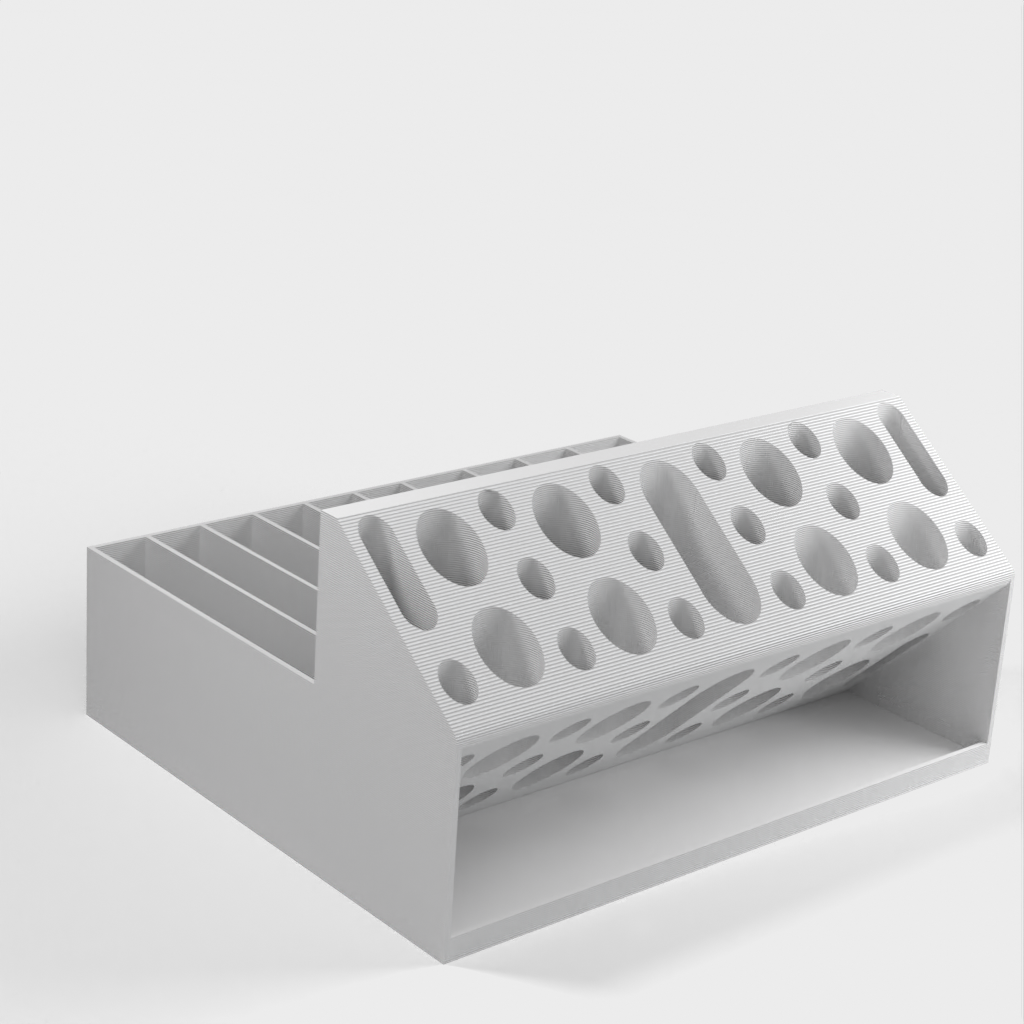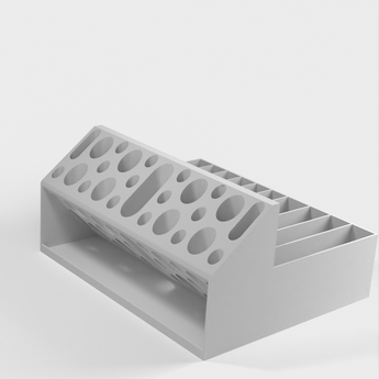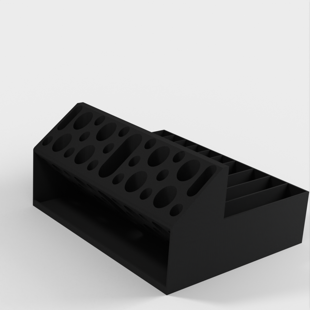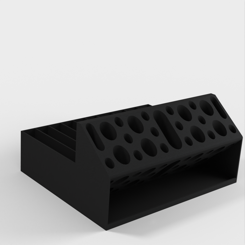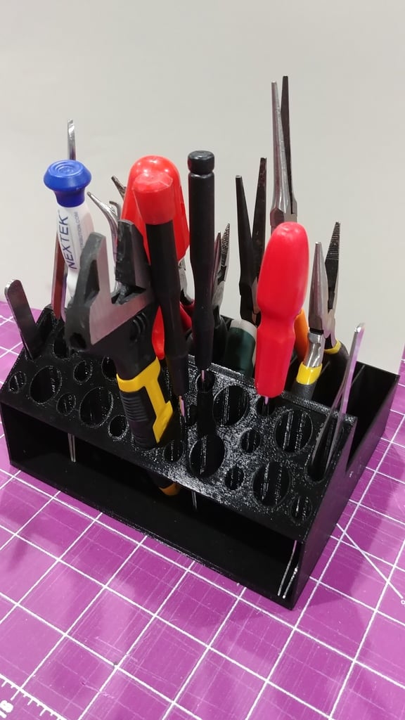 This Pliers Holder Remix is designed to organize your tool collection more easily. It features larger oval holes to fit a crescent wrench and wider slots for thicker plier handles. A lip has been added to the bottom of the round hole section to prevent smaller items from sliding off/through. Perfect for 3D printers, hobbyists, desk organization, and workshop storage.