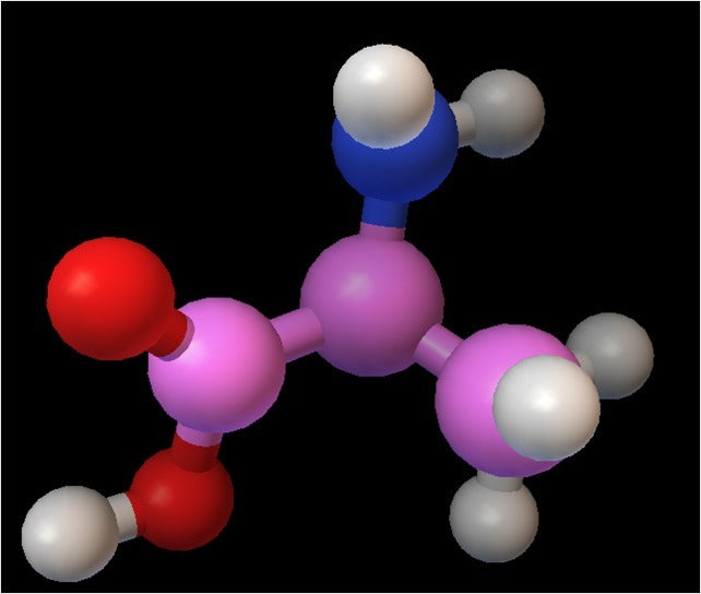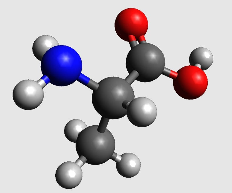 A highly detailed 3D molecule model of Alanine. Alanine is part of many proteins and is essential for understanding the difference between glucose and carbohydrates like lactose, illustrating why we need different types of food to provide the body with the necessary nutrients.