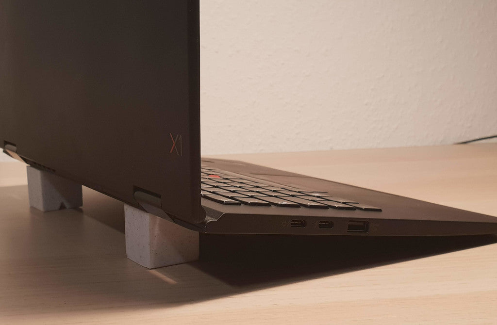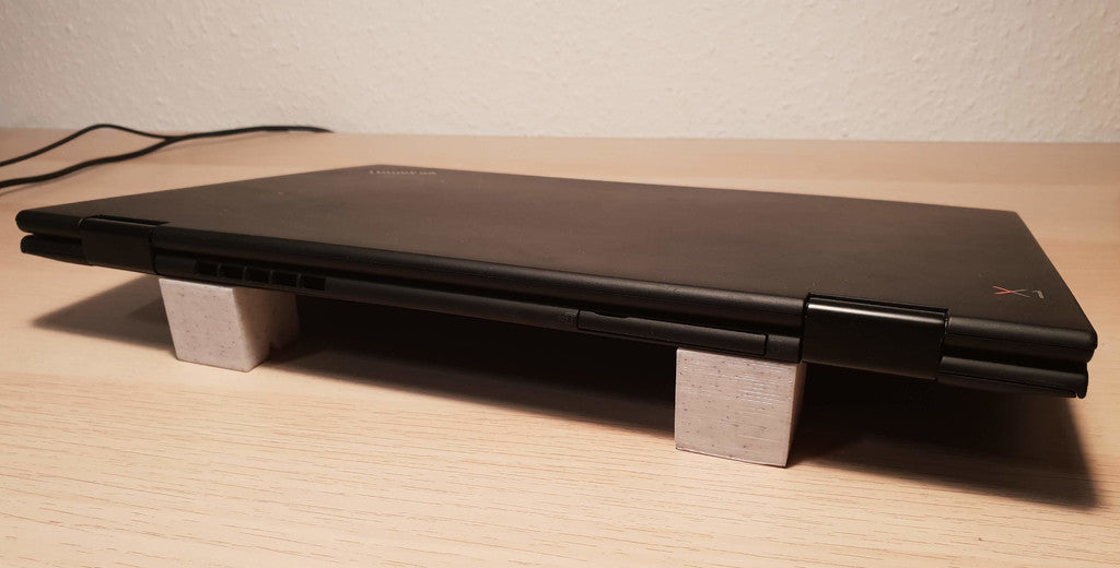This is a simple universal laptop stand that provides a 10-degree angle for your laptop. For most laptops, two of these should be enough to provide good support. The size is a cube with a 30 mm side length, and the height is sufficient to be about 20 cm away from the beginning of your laptop.