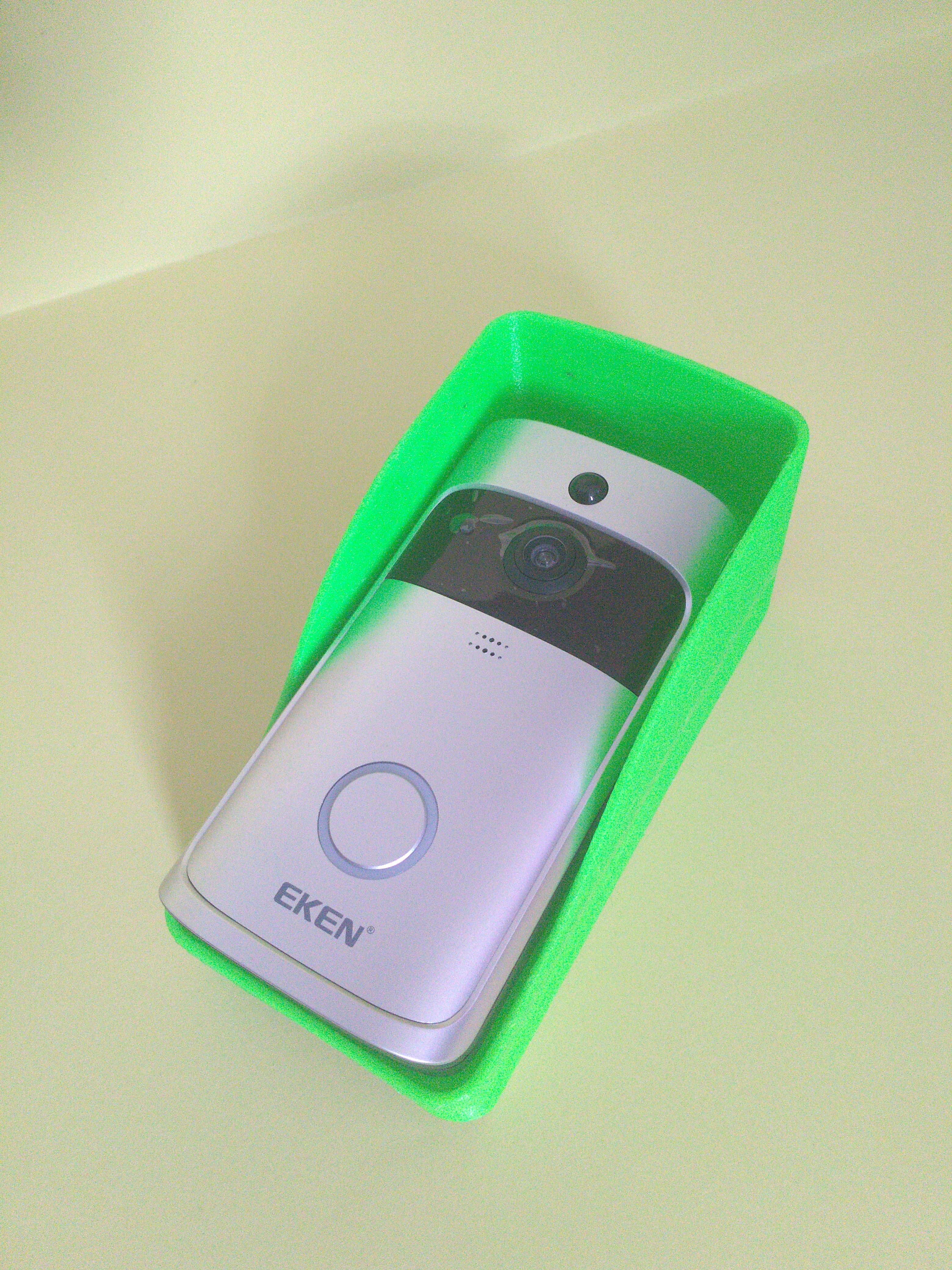 Simple and robust wall mount for a Ring Doorbell Eken V5. The compact size (78 x 161 mm) makes it easy to mount on a wall or fence, and the holder is designed with about 3 mm of space between the doorbell and the surface, making it easy to remove the doorbell by sliding it upwards.