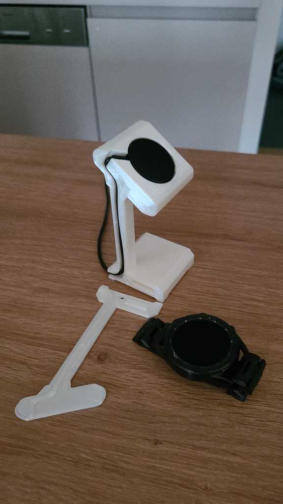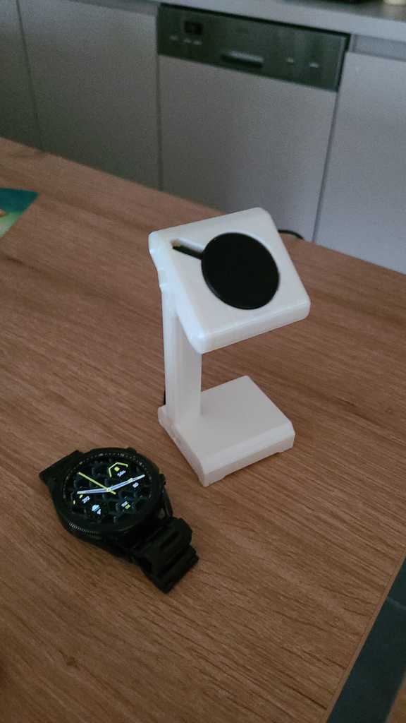 This charging stand is designed for the Samsung Gear S3 smartwatch and offers a convenient solution for keeping your watch organized while charging. It holds the watch stably, whether placed on a desk, nightstand, or any other surface. The stand integrates a discreet cable channel with an accompanying cover that effectively conceals the charging cable. This helps maintain a tidy and organized area, free from tangled wires, while elegantly presenting your Samsung Gear S3 smartwatch.