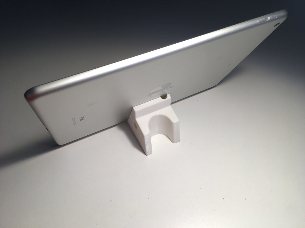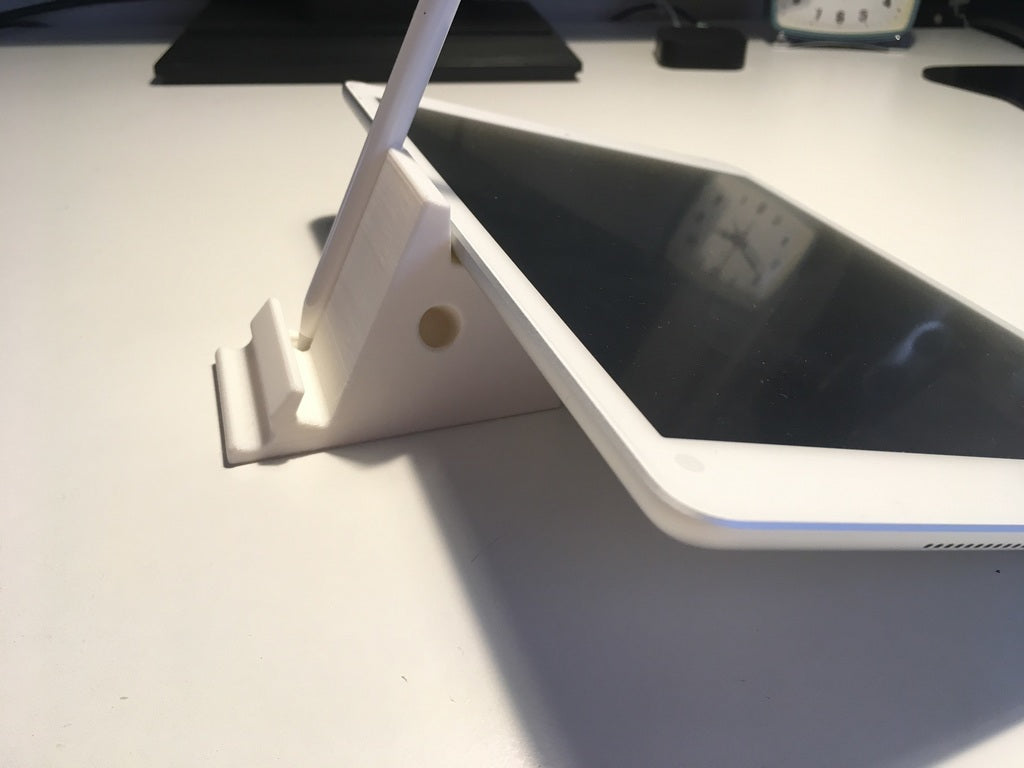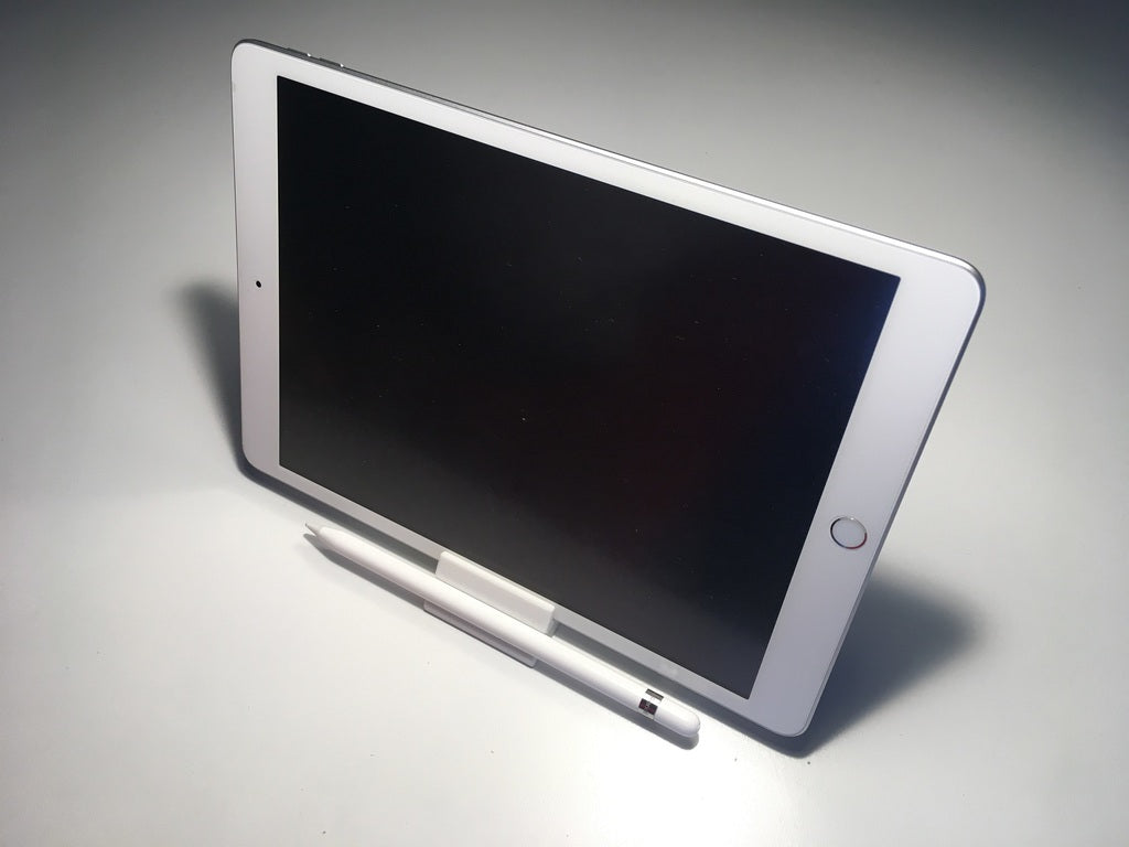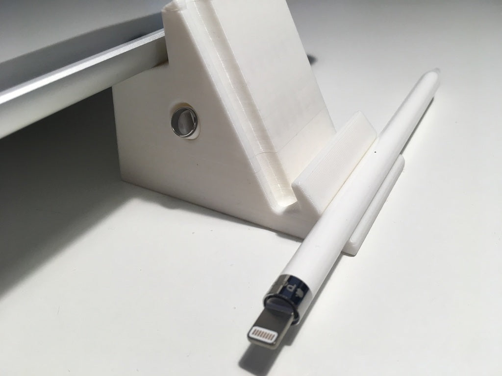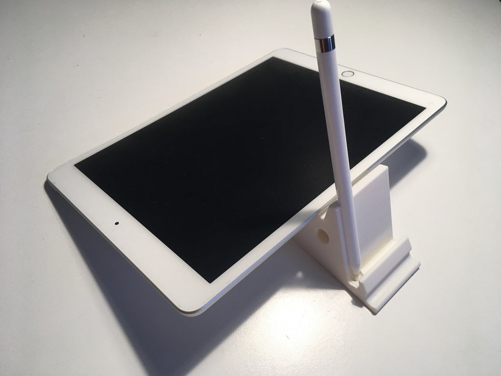2-way iPad stand with holder for Apple Pencil and its cap. The stand can hold your iPad in a comfortable position for watching videos, while the Apple Pencil holder keeps your pencil and cap organized and within reach.