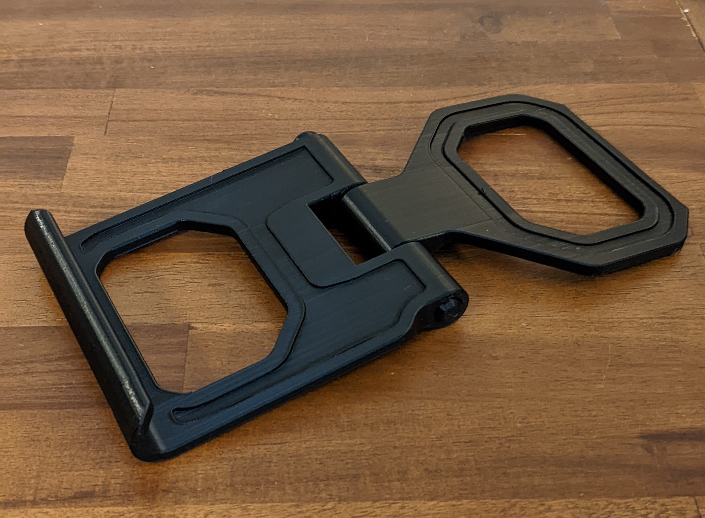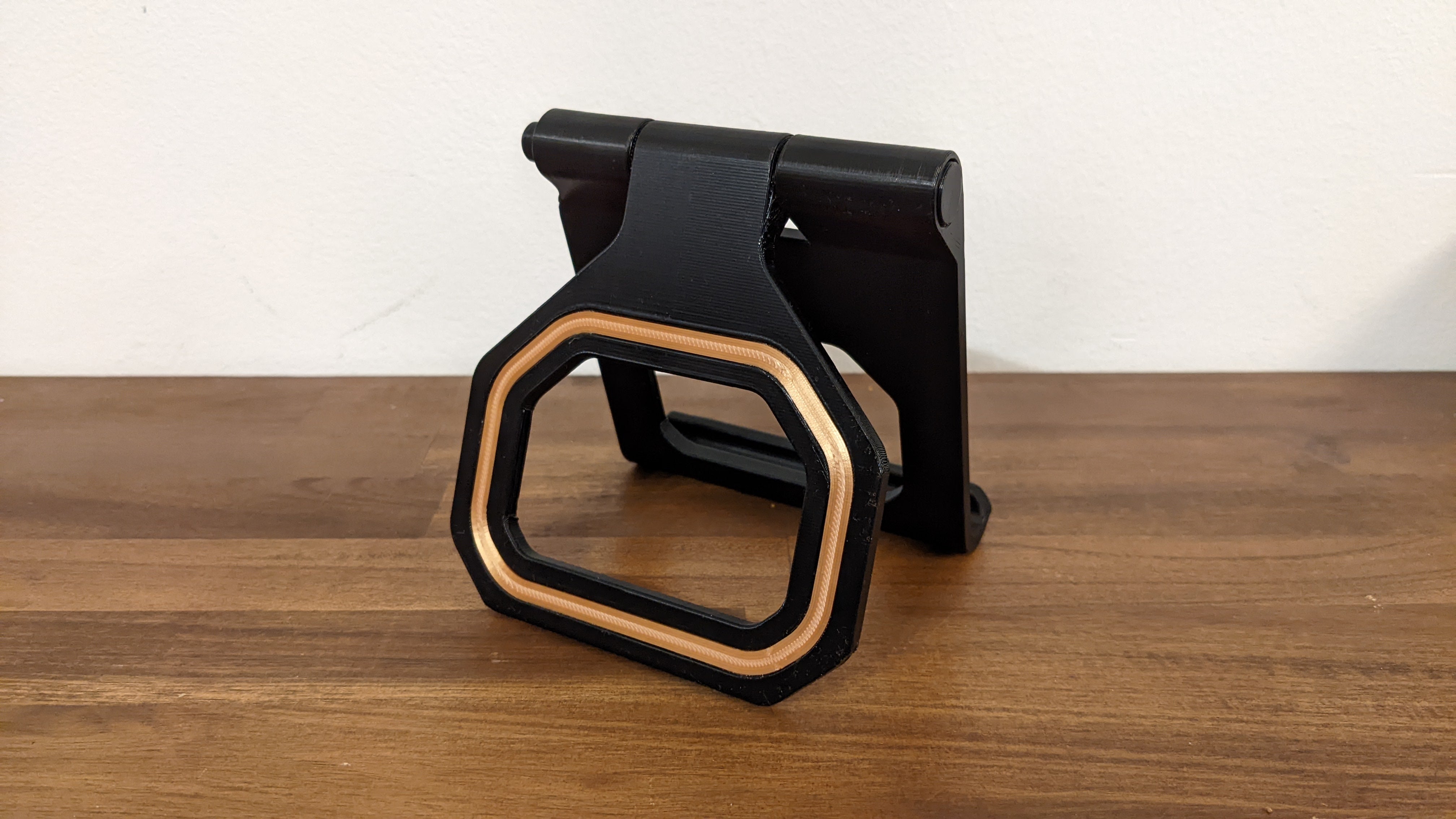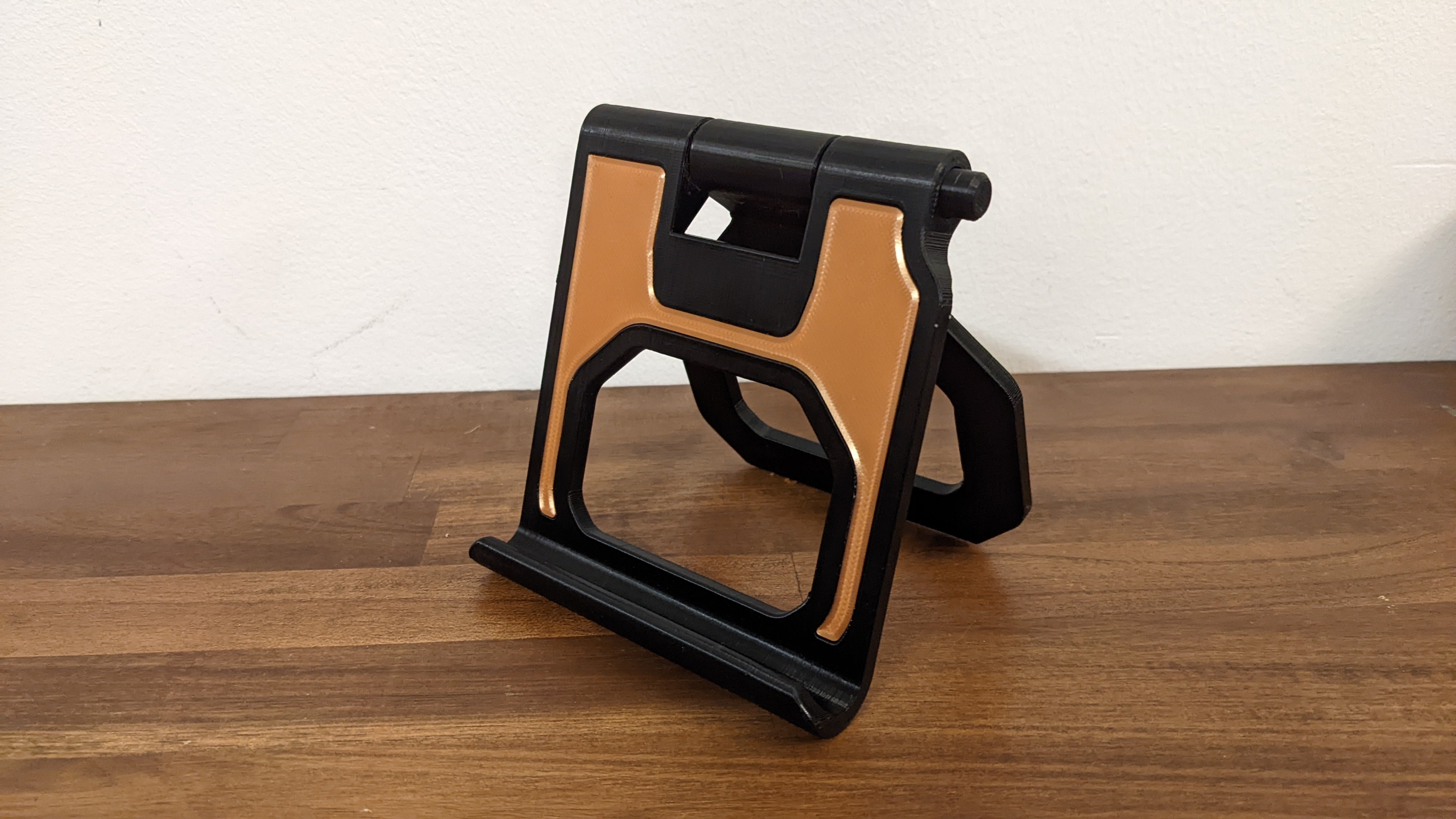 Adjustable tablet/phone stand with push-button setting. This stand can be printed and is perfect for holding your iPad, iPhone, or any other tablet or mobile phone. The stand has a built-in push-button adjustment feature that makes it easy to adjust the angle of your device, creating a comfortable viewing experience. Whether you are watching videos, reading, or browsing on your device, this product makes it easy and convenient to do so.