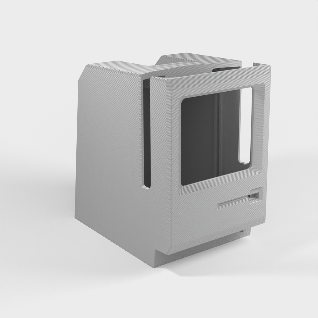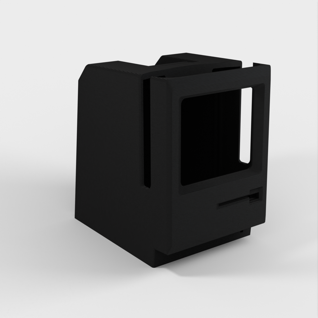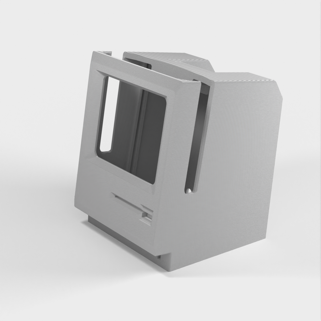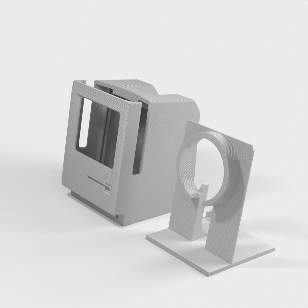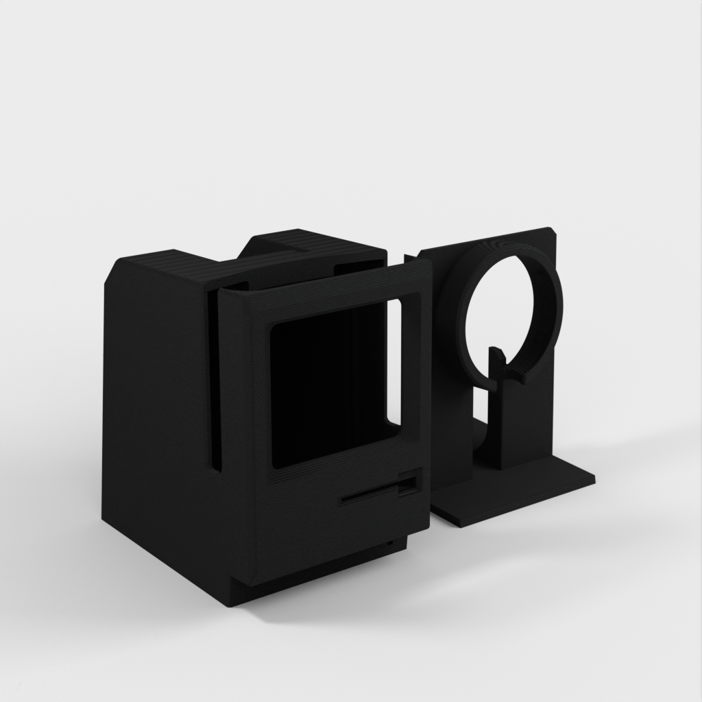 Apple Watch charging dock in classic Mac style. This is a two-part charging stand for Apple Watch, where part 1 holds the wireless charging mechanism in place, and part 2 slides over the top, providing a space to set your Apple Watch. On the sides of the shell there are slots that securely hold the watch by its band, while the magnetic charger holds it in place for charging. The screen aligns with the Mac's screen, allowing you to see the display while the watch is in nightstand mode.