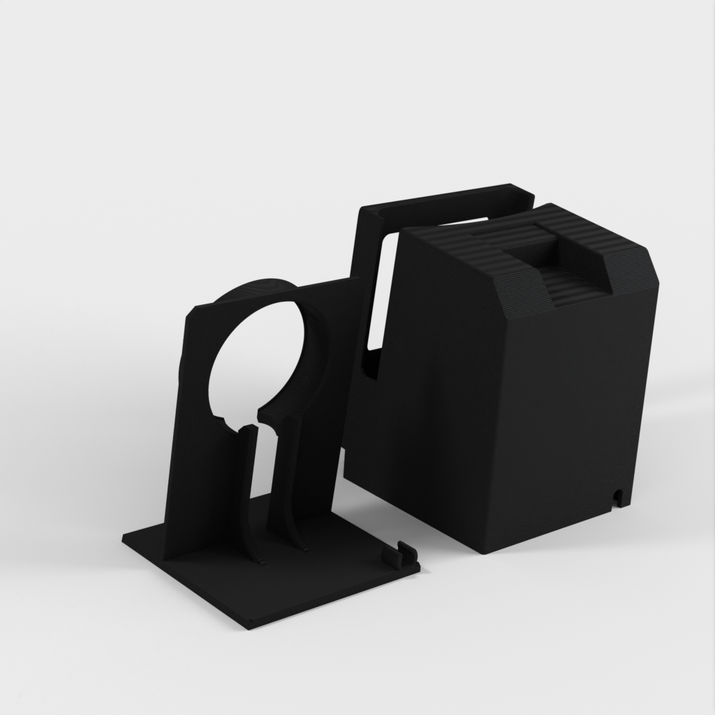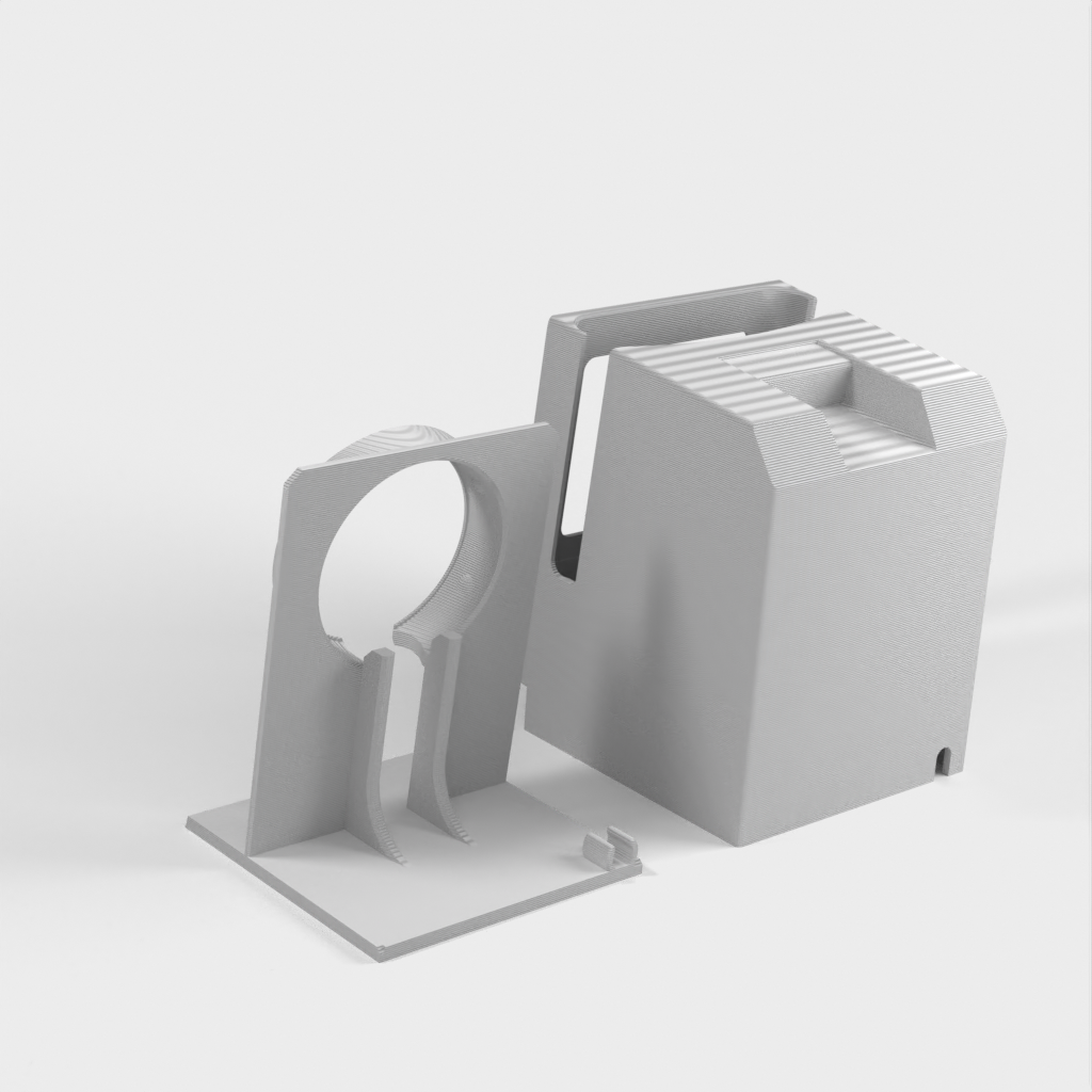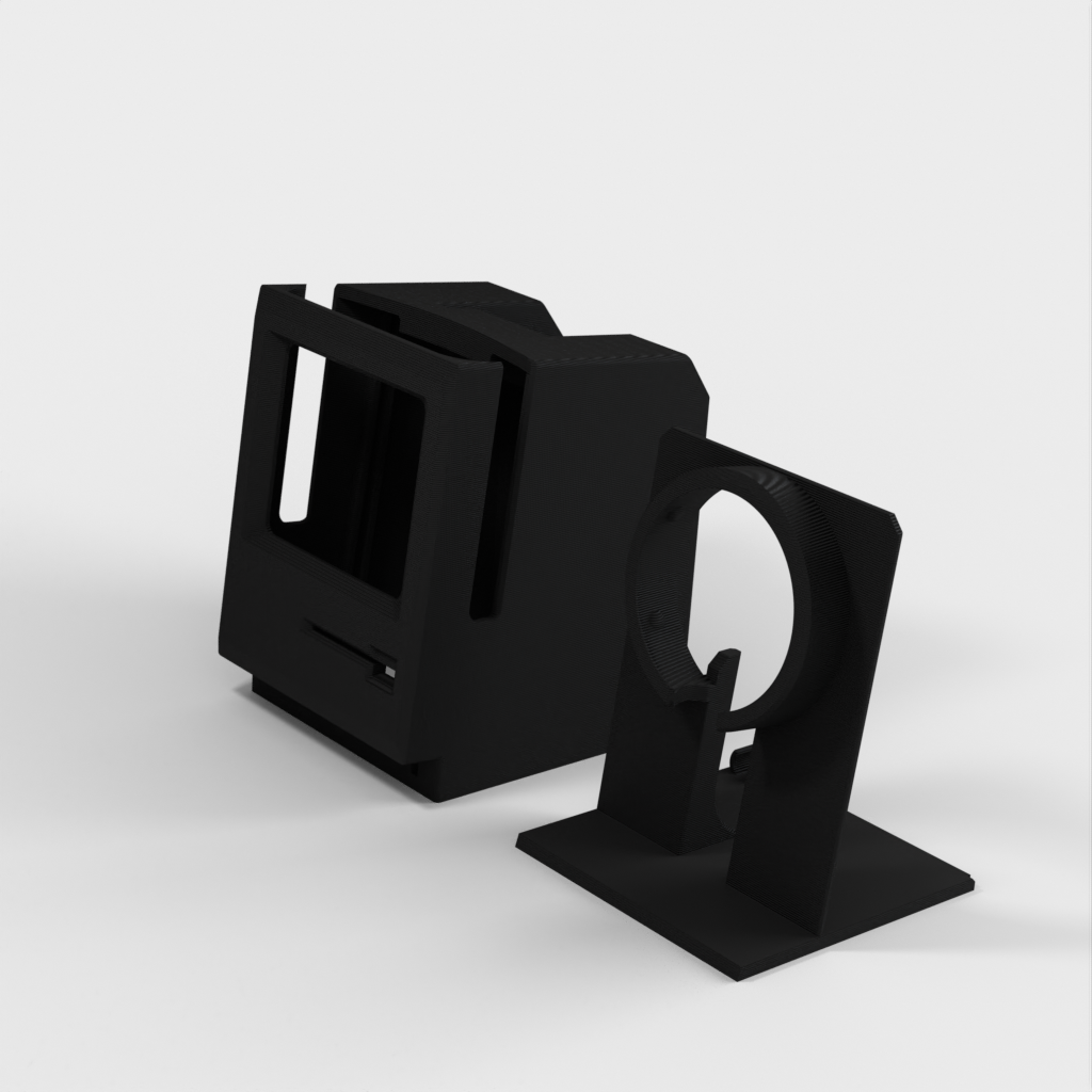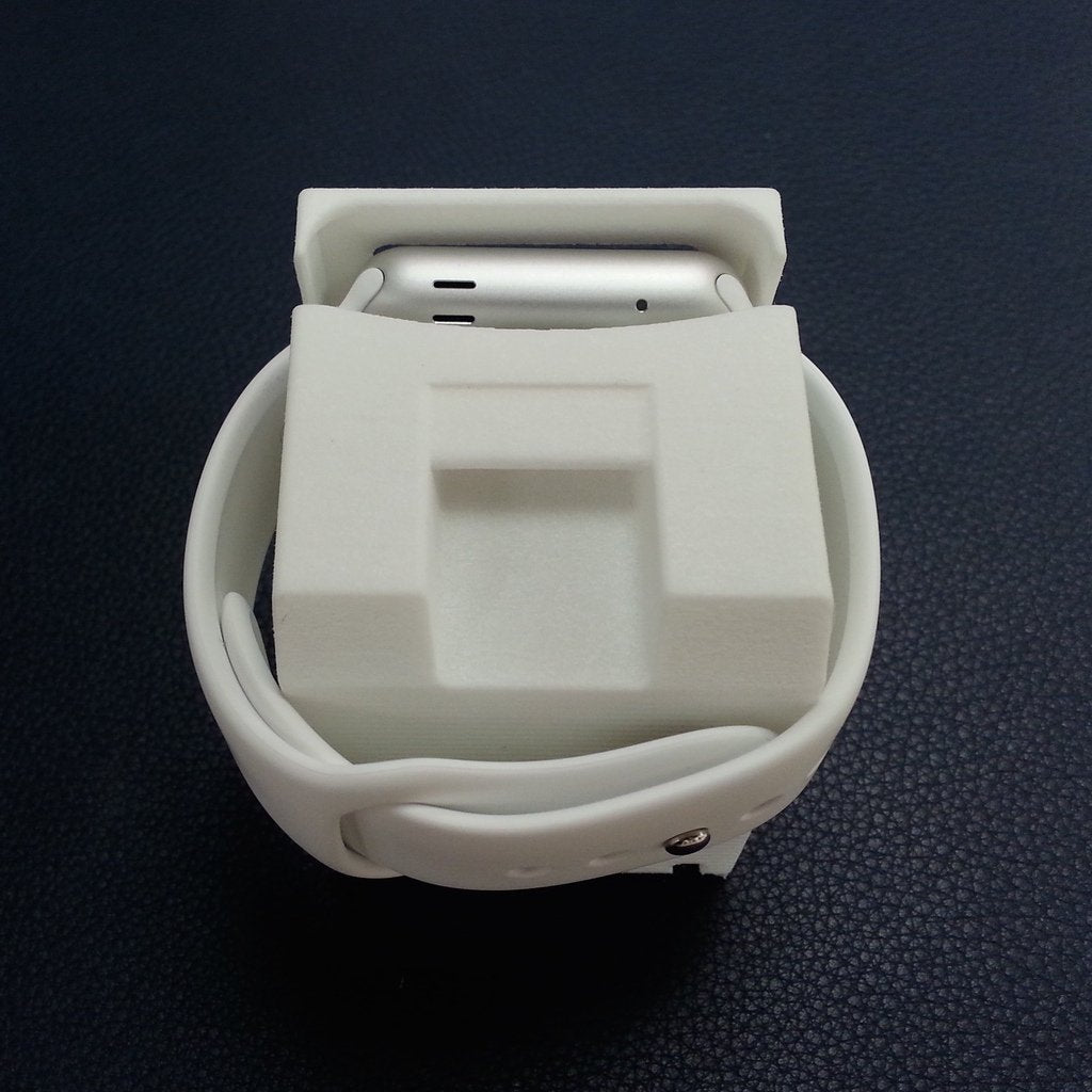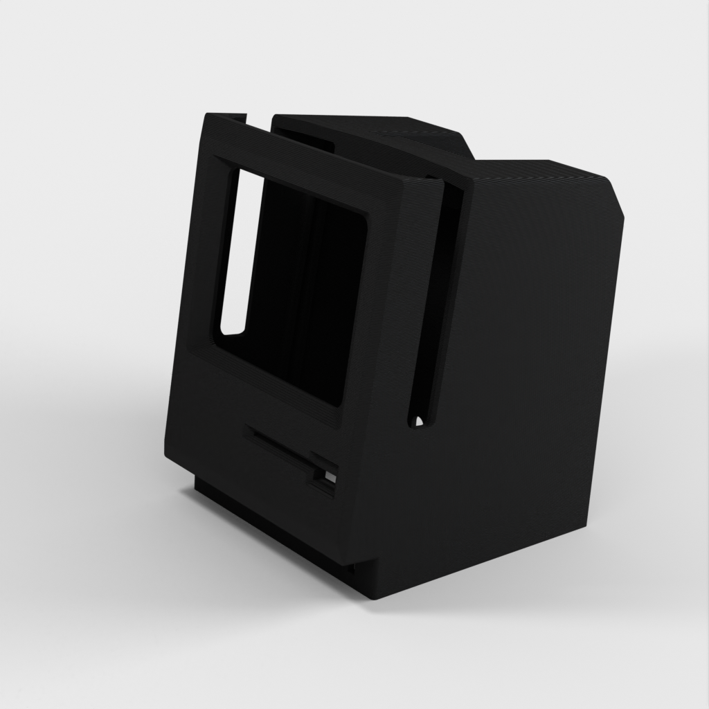 Apple Watch charging dock in classic Mac style. This is a two-part charging stand for Apple Watch, where part 1 holds the wireless charging mechanism in place, and part 2 slides over the top, providing a space to set your Apple Watch. On the sides of the shell there are slots that securely hold the watch by its band, while the magnetic charger holds it in place for charging. The screen aligns with the Mac's screen, allowing you to see the display while the watch is in nightstand mode.