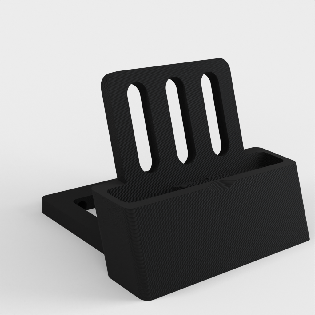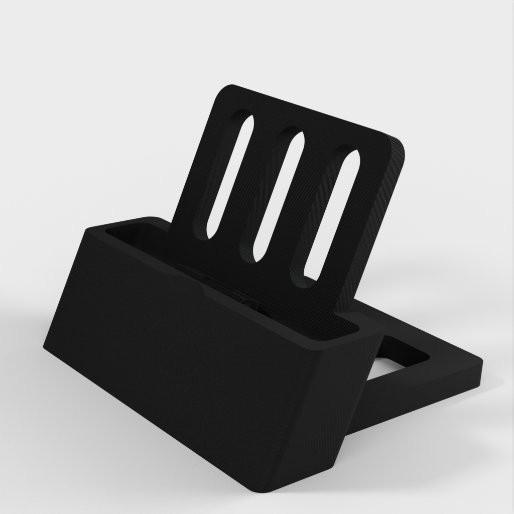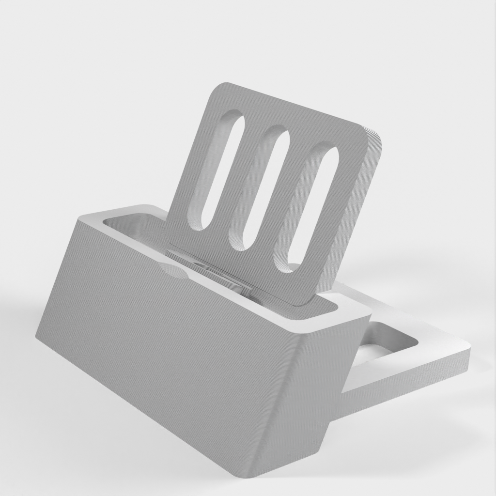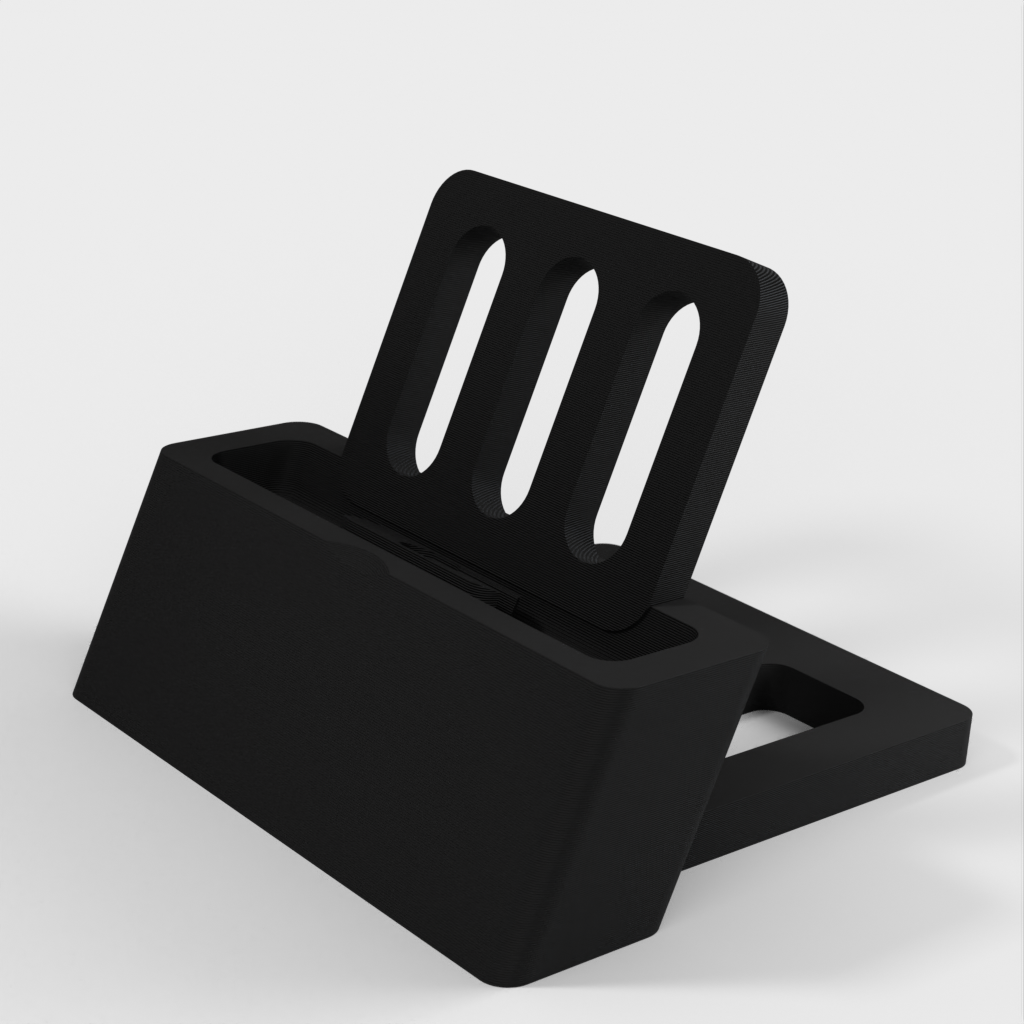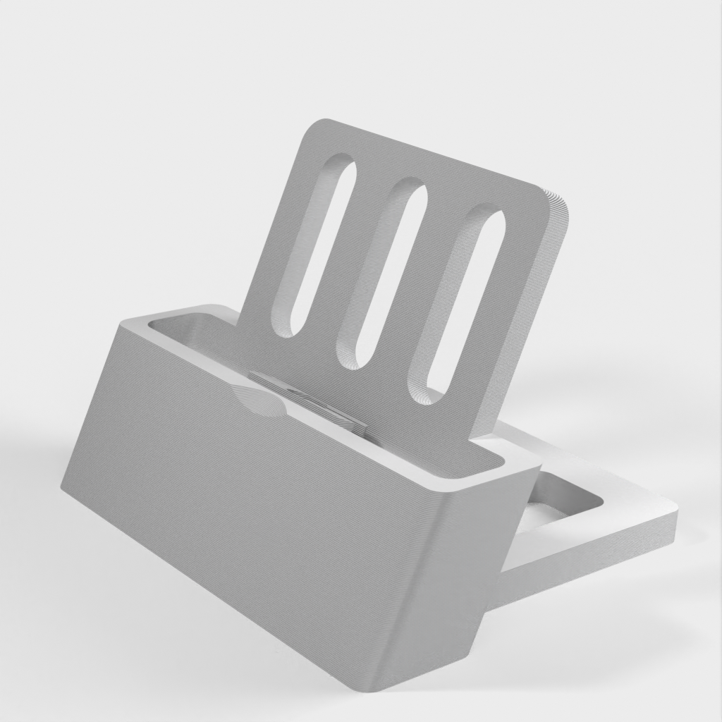 iPhone 5/6 Dock v3 is a stand for your iPhone, even when it is in a case. The stand also supports the back of the case. This version remains compatible with iPhone 5 and has now added support for iPhone 6.