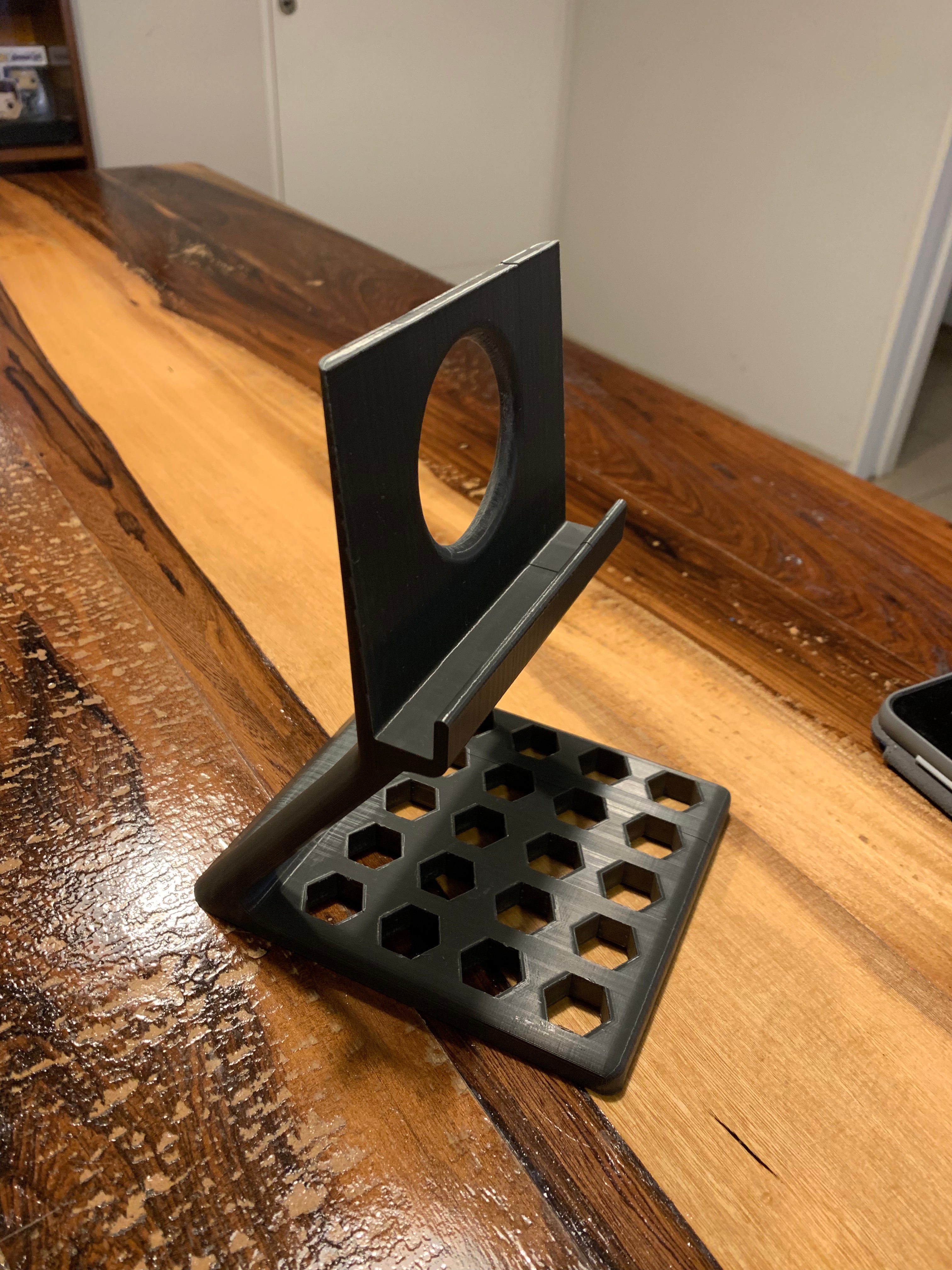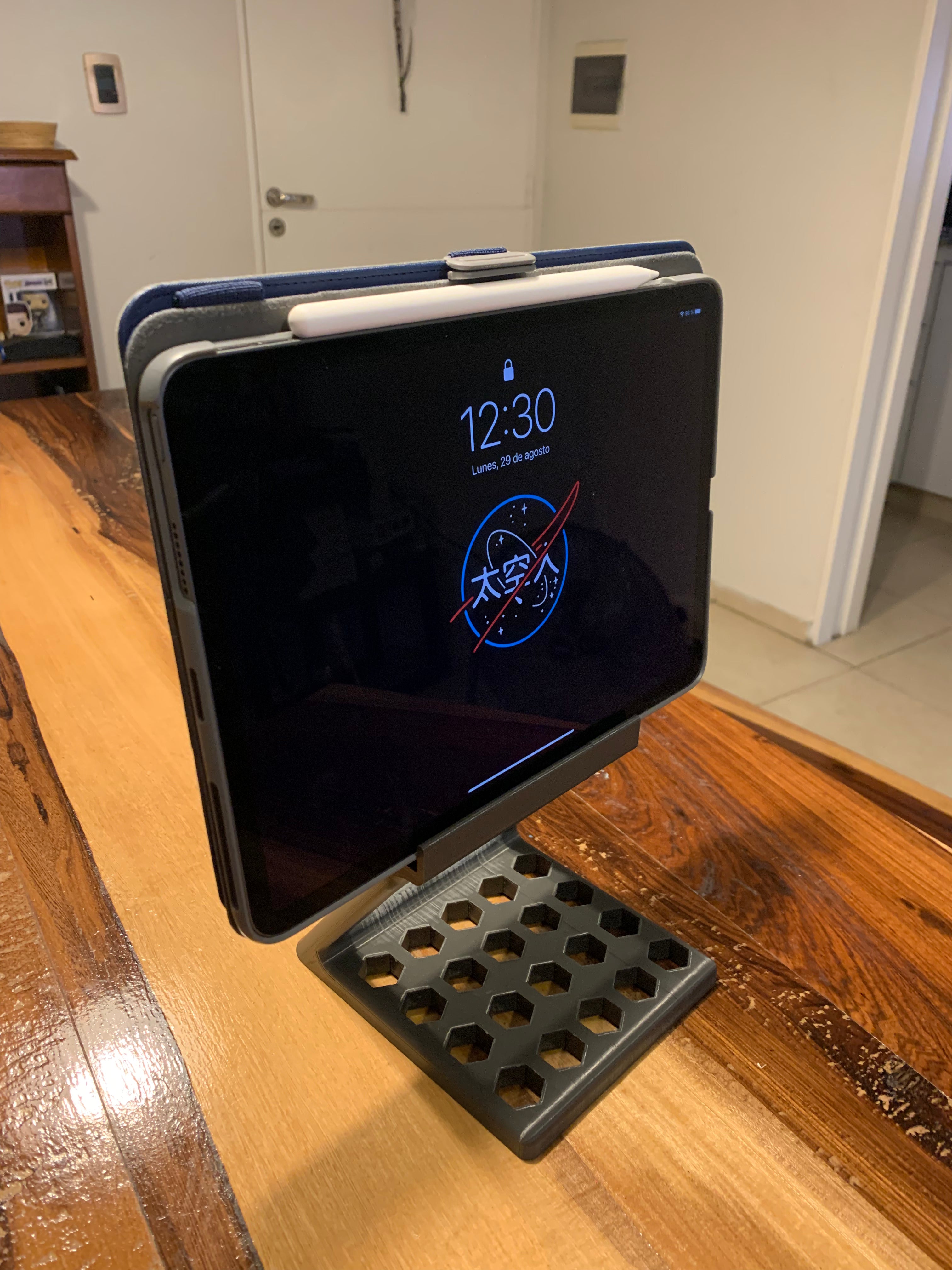 An iPad holder crafted with precision. It can be adjusted to the perfect viewing angle for easy reading, browsing, or video calls. Its design is simple and follows the minimalist aesthetic of the iPad.