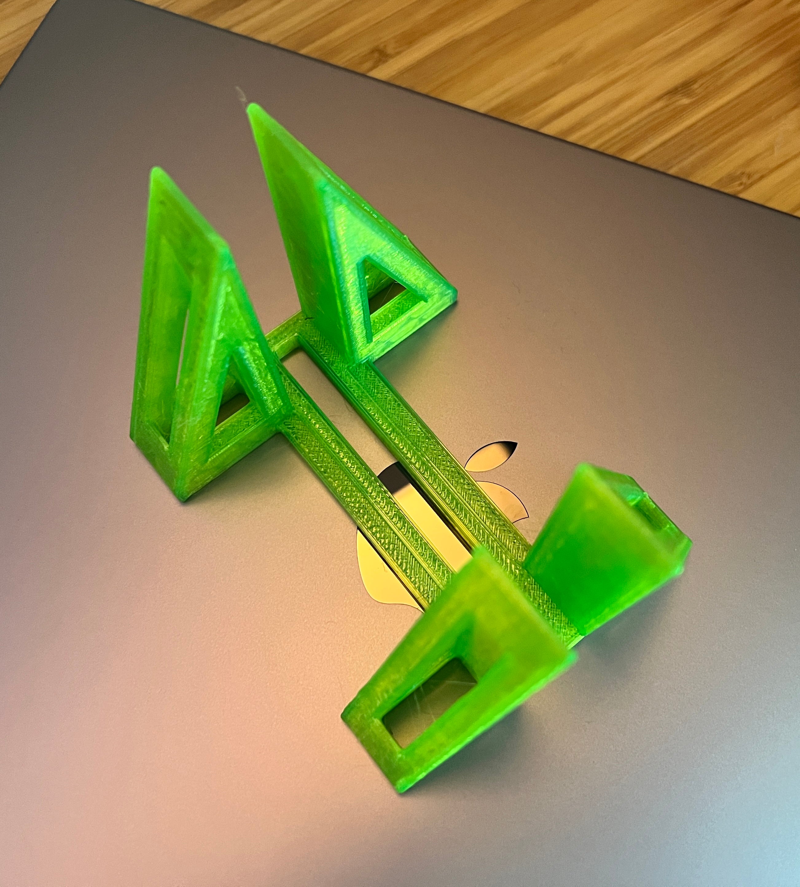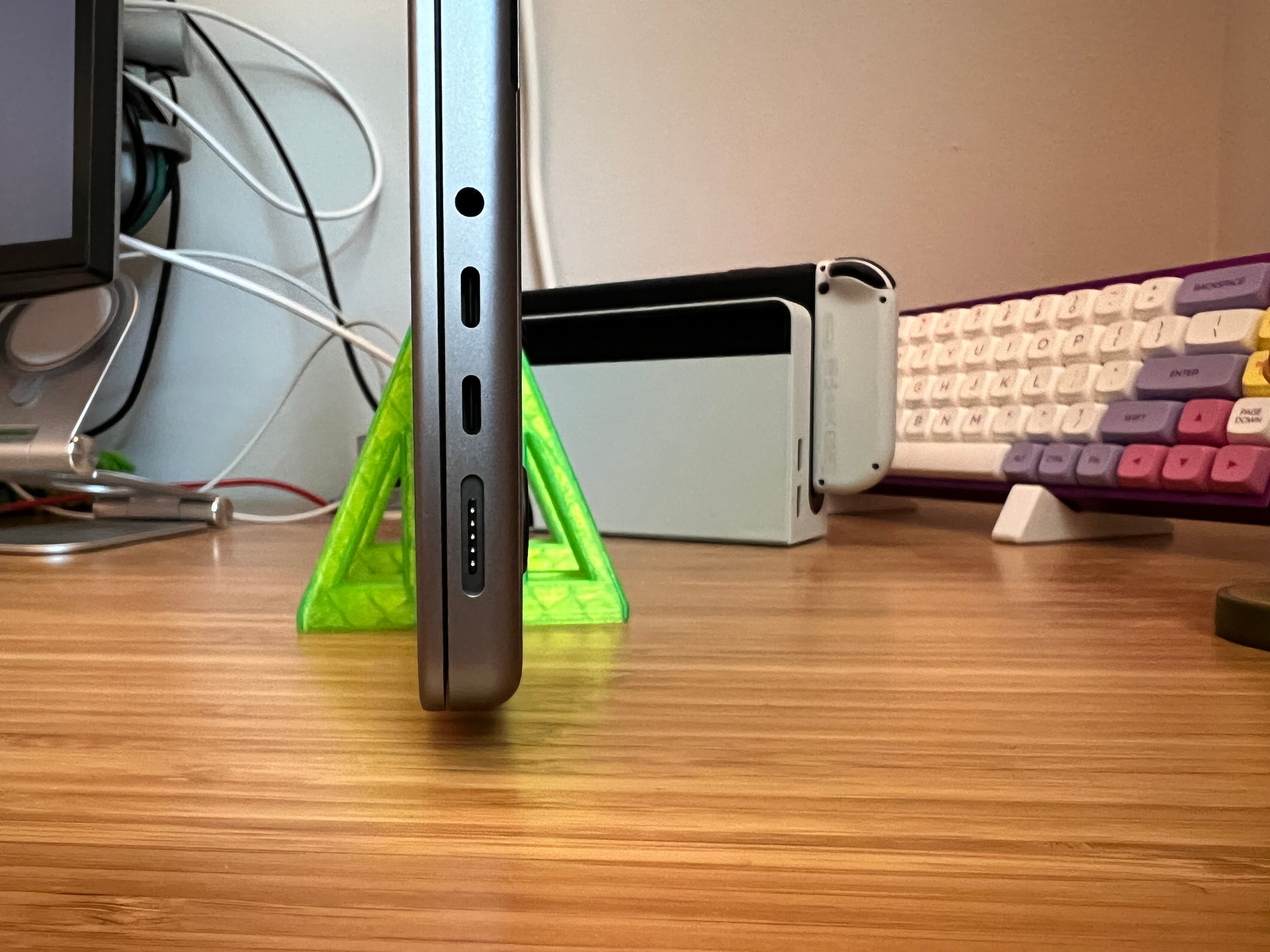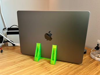 This is a vertical stand for a 14" Macbook Pro. Its slim design allows you to place your Macbook vertically, which can save space on your desk. It is made with filament in Prusament Petg clear green, adding a nice visual touch to your setup.