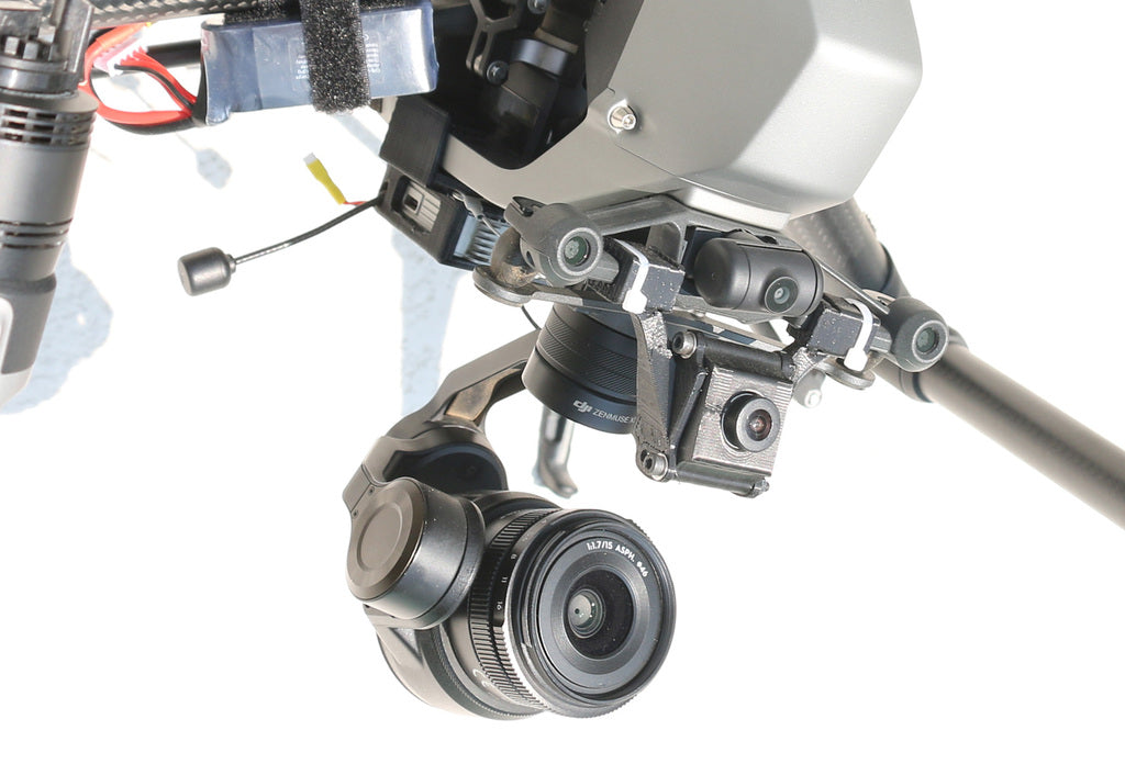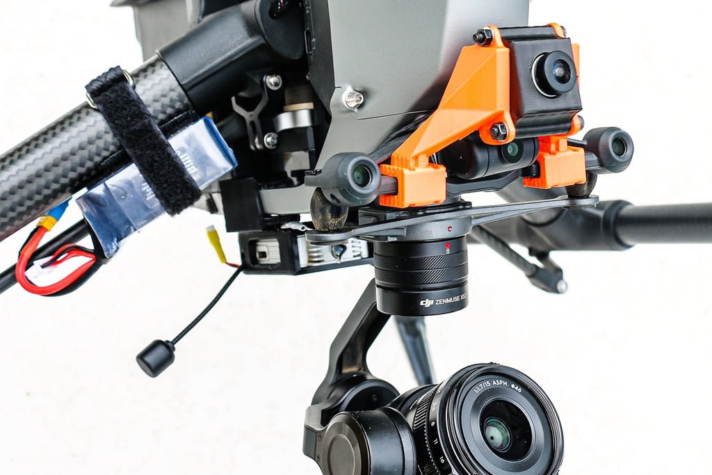 Improved safety is integrated via bolts that secure the gimbal, as well as gripping arms that wrap around the Inspire body. A surface adds the option for extra velcro fastening if desired, and a practical battery strap is included for further securing components. There is also a version of the camera arms that lifts the camera higher, away from the gimbal, if you are using a longer cable (20 cm).