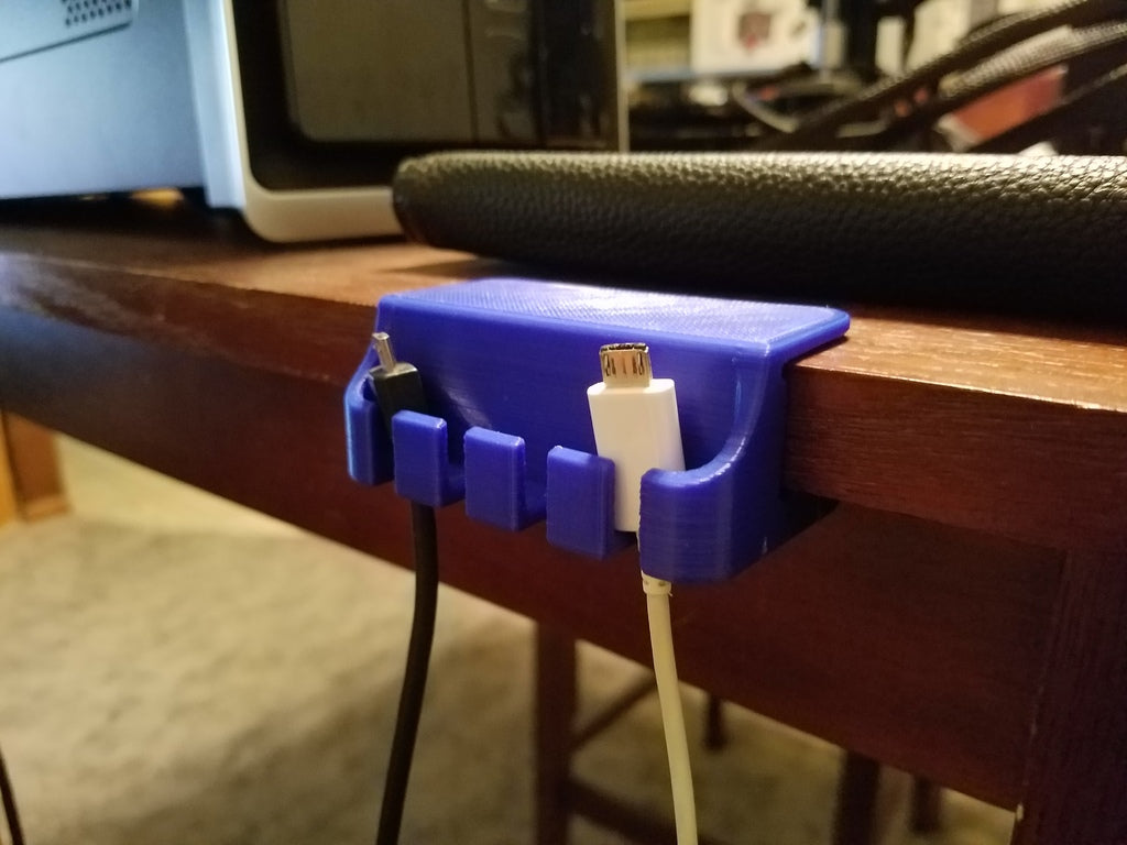 Are you tired of clutter with your charging cables on the desk? This practical **USB micro cable holder** is designed to keep your **USB cables** organized and within reach. It easily mounts by clipping onto the edge of your desk and stays secure thanks to sufficient friction. The cable holder fits tabletops with a thickness of up to 17.8 mm (0.700 inches), ensuring a stable solution for keeping your cables in place. With this solution, you avoid your cables falling behind the desk or tangling up, allowing you to maintain a tidy and functional workspace.