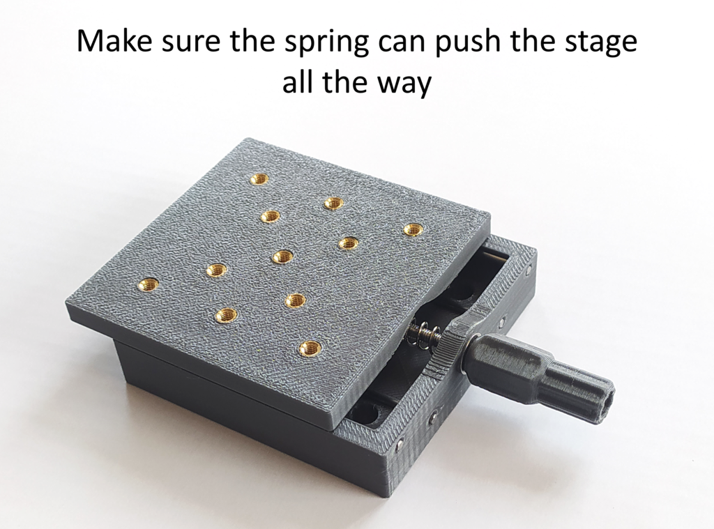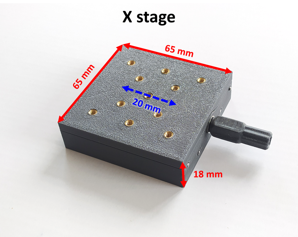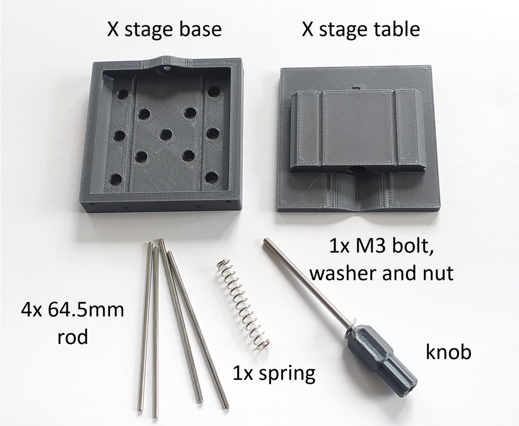 The printed linear stage is a practical solution for precision positioning with an accuracy of up to 10 microns. The design is ideal for projects where precise movements are crucial. It utilizes 3D printed parts along with 2mm metal rods, a 40mm spring, and a 55mm M3 bolt with a nut and washer to ensure stability and functionality.