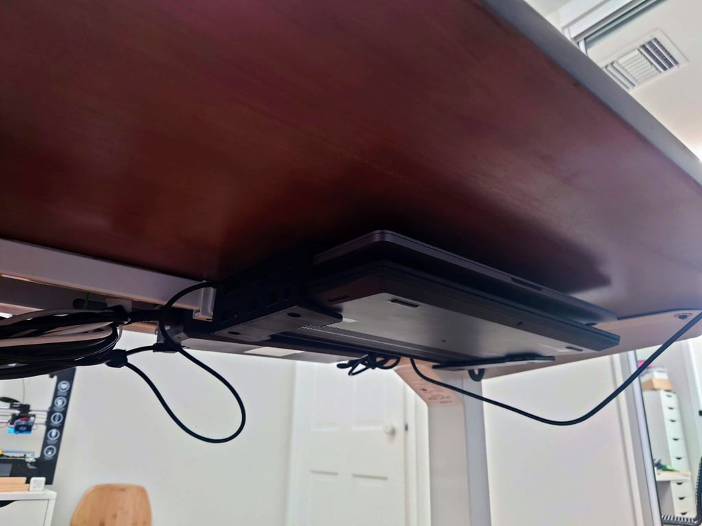 Optimize your workspace with this practical dual laptop under-desk mount, designed to create a more organized and space-saving environment. This solution is ideal for users working with multiple laptops who wish to free up valuable desk space.