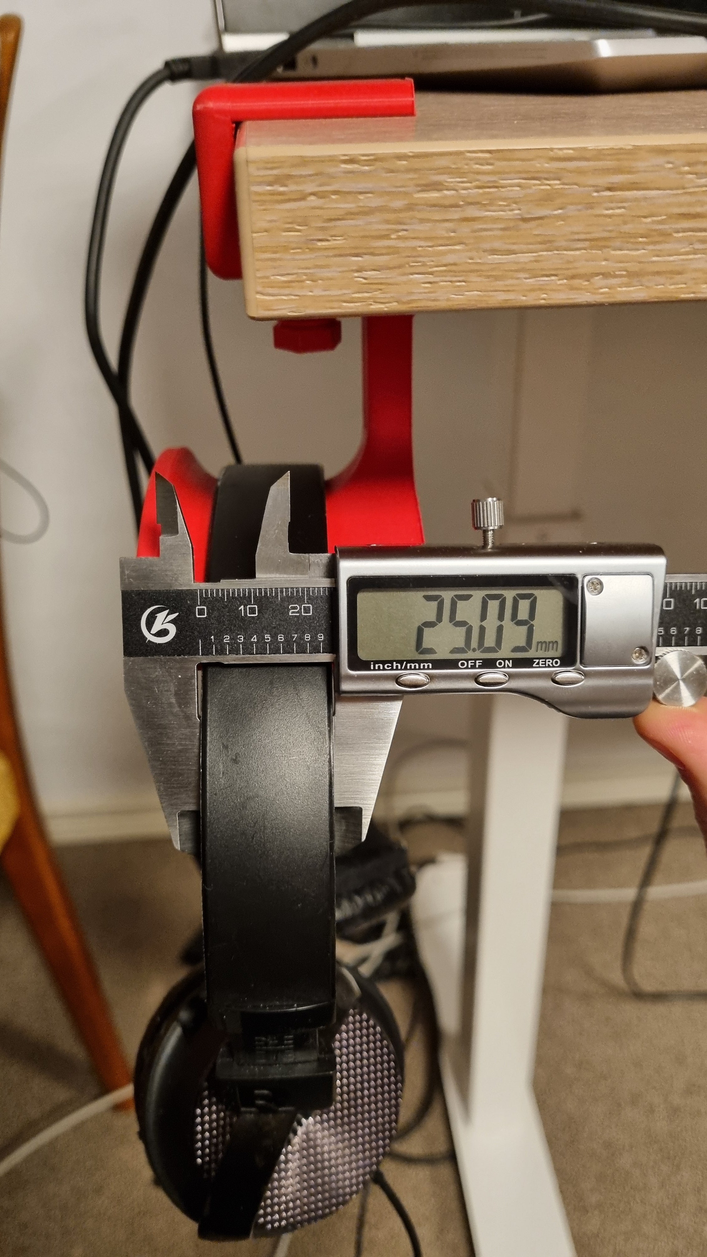 In addition to the primary function as a headphone holder, this practical accessory is equipped with an extra hook at the bottom. This hook allows you to hang additional small items, such as cables, keys, or other personal gadgets, further contributing to a tidy and efficient setup. The design is suitable for desks with a thickness of up to 25 mm and fits most standard headphones around 150 mm in diameter and 25 mm wide.