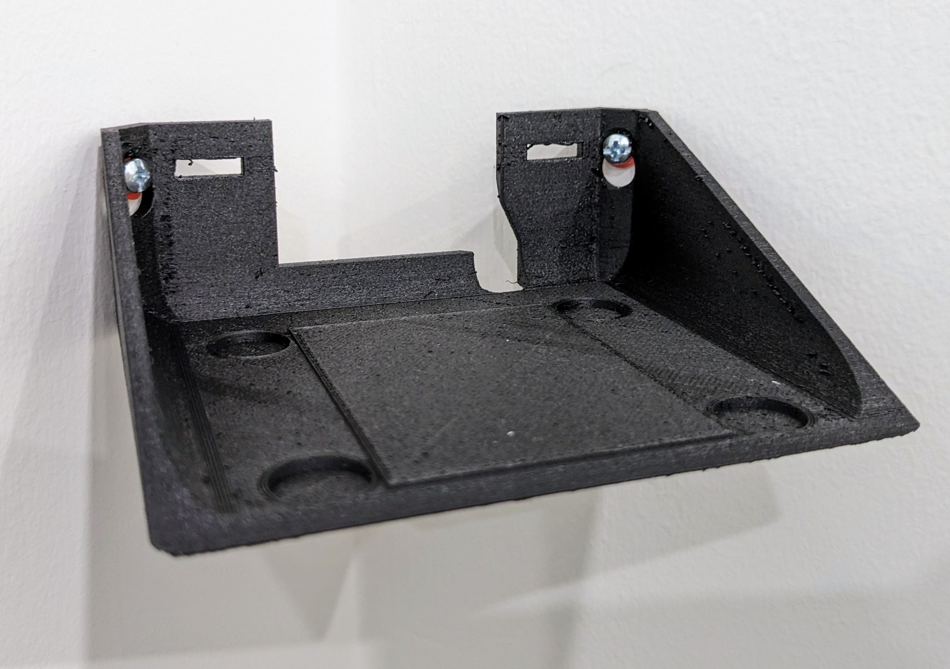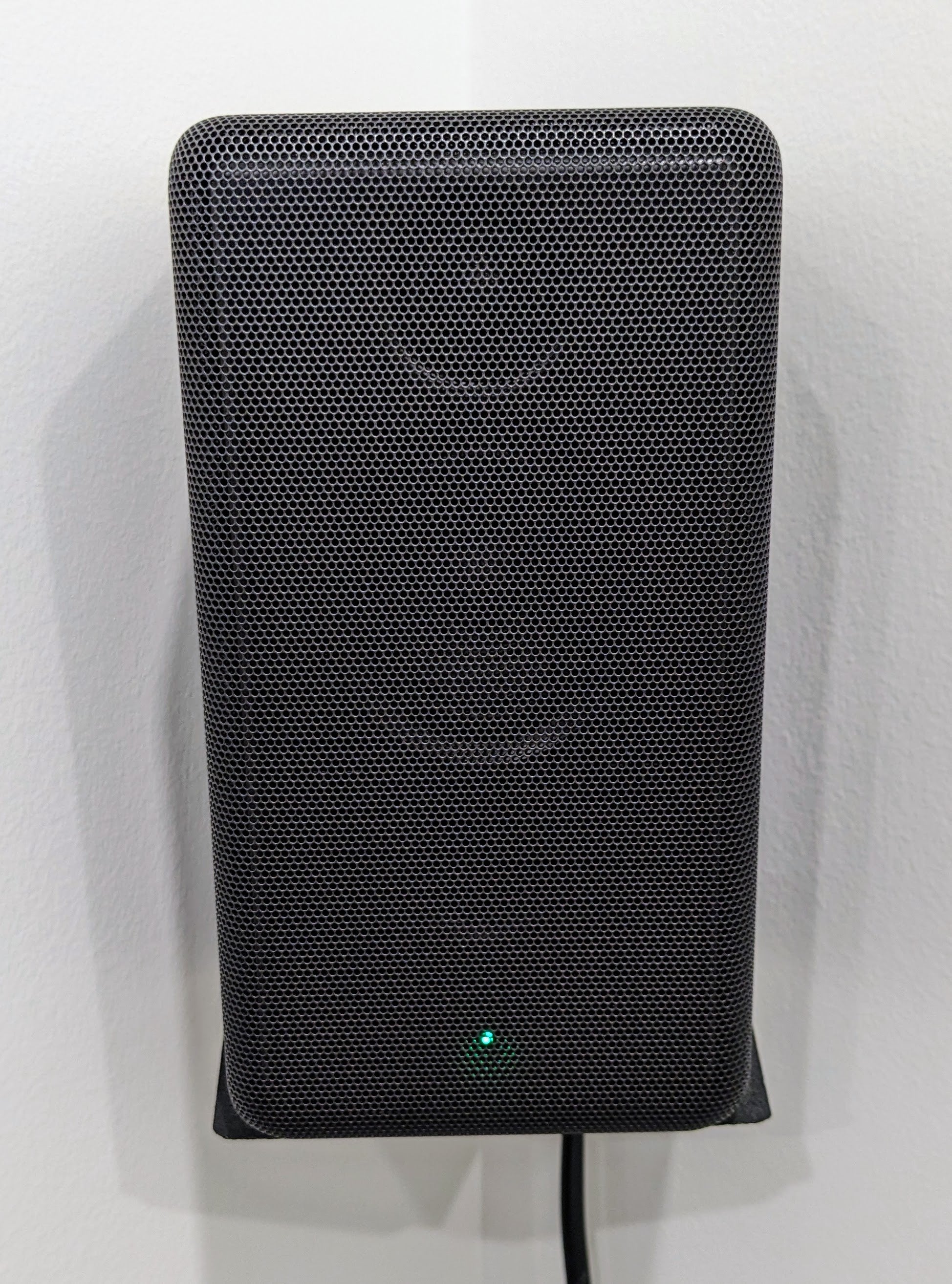 The bracket is securely mounted to the wall with two screws, and the use of wall anchors is recommended for additional stability. The speaker sits snugly and securely in the bracket thanks to specific cutouts for the speaker's feet and a locking mechanism that prevents it from tipping forward, even with an accidental nudge.