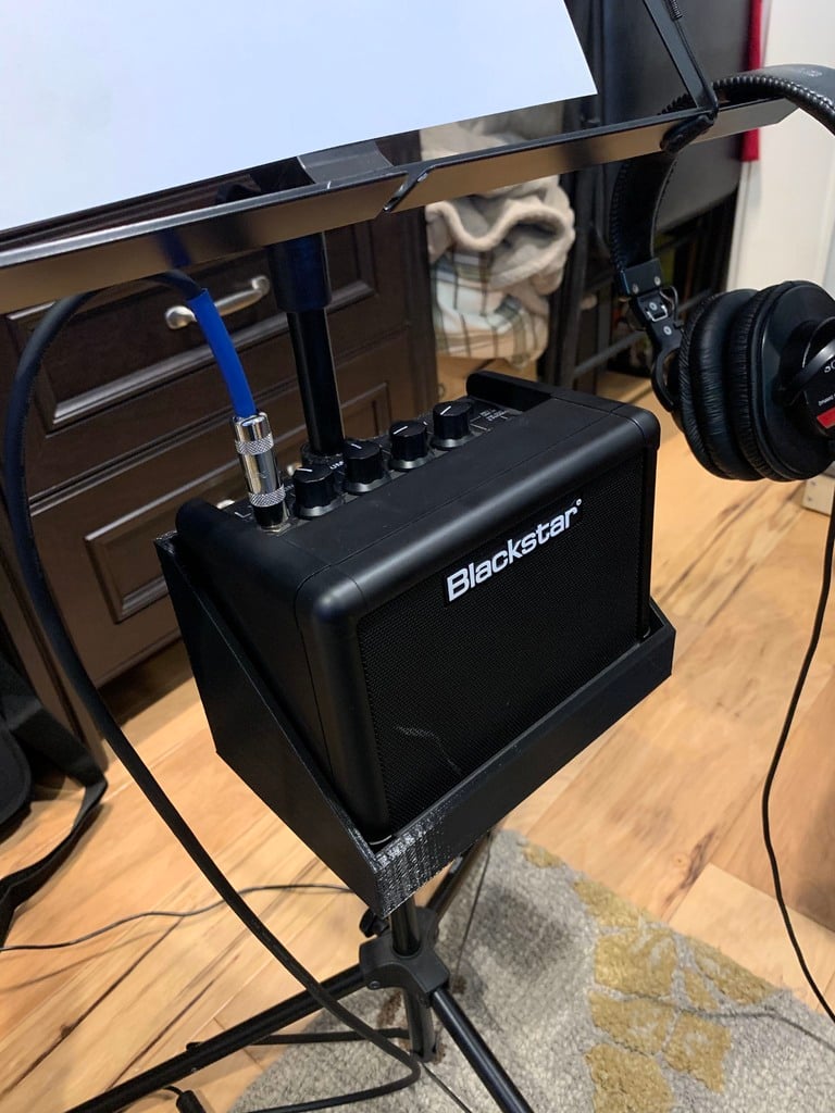 This bracket is designed to optimize your practice experience by securely holding your Blackstar Fly 3W guitar amplifier to your music stand. By positioning the amplifier at a convenient height and within reach, you can focus on your music undisturbed. This creates a more organized and functional practice area where you can easily adjust your amplifier's settings without having to bend down or move equipment around.