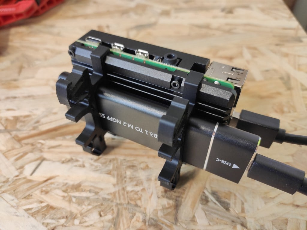 Beslaget er konstrueret, så Raspberry Pi'ens Armor Cases effektive køleløsning bevares, hvilket er essentielt for at opretholde en stabil og optimal ydeevne under drift. Installationen er ligetil; beslaget klikkes nemt på bagsiden af Armor Caset uden behov for skruer, hvilket sikrer en hurtig og sikker fastgørelse. Derudover er der indbygget et praktisk rum til en ekstern USB3 M.2-disk, hvilket giver mulighed for udvidet lagerkapacitet direkte ved siden af din Raspberry Pi.