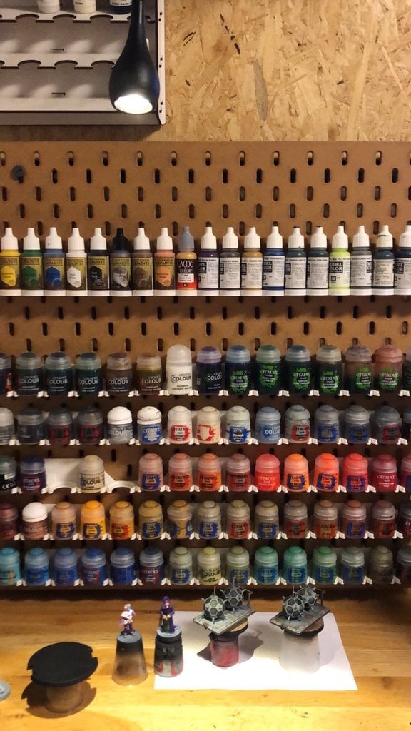 Citadel malingrack til IKEA SKÅDIS peg board. Producktet har plads til 5 Citadel malingflasker fra Games Workshop.