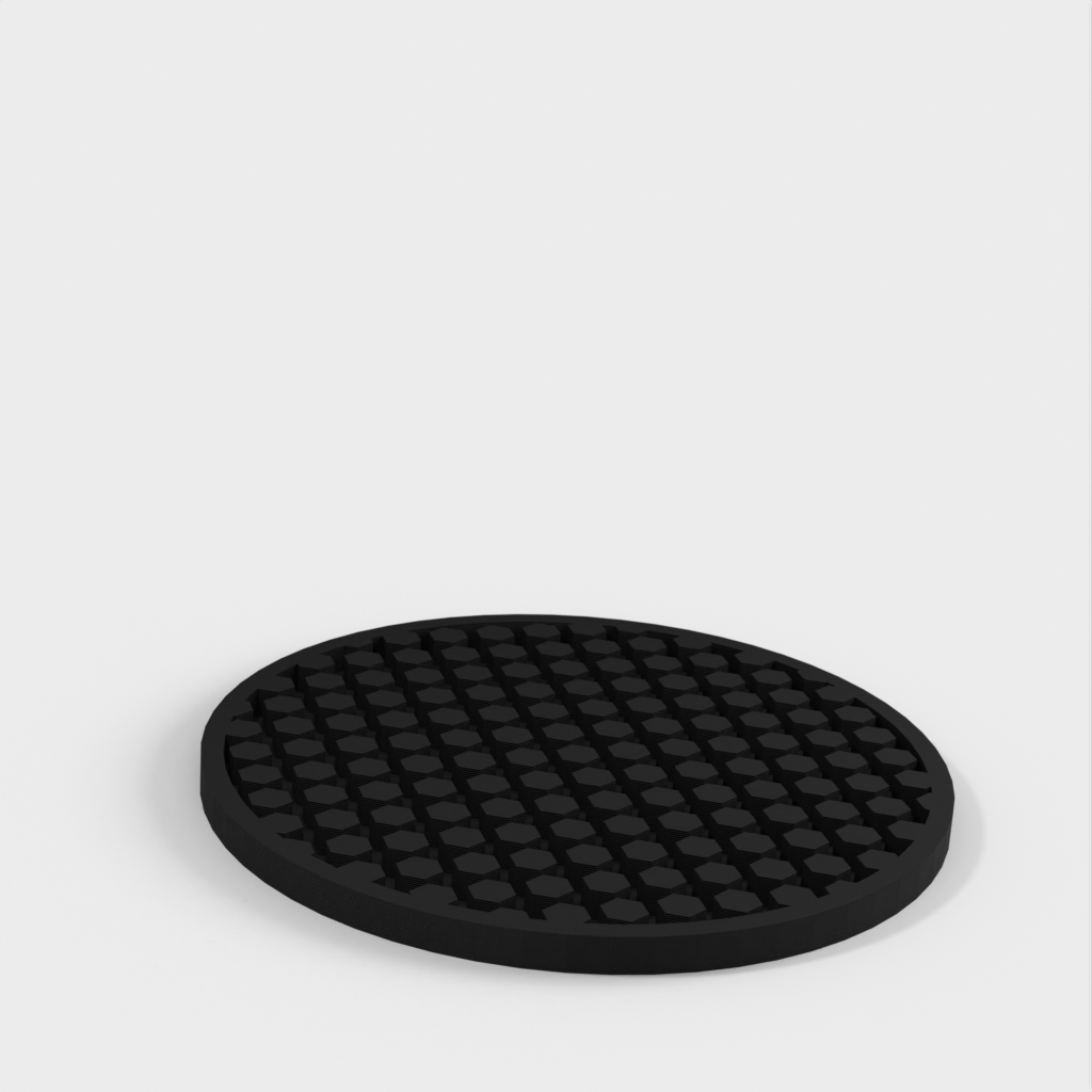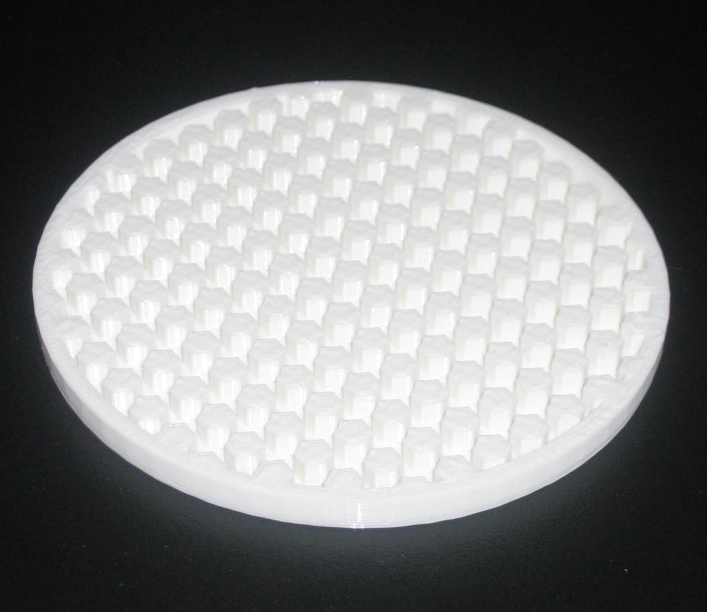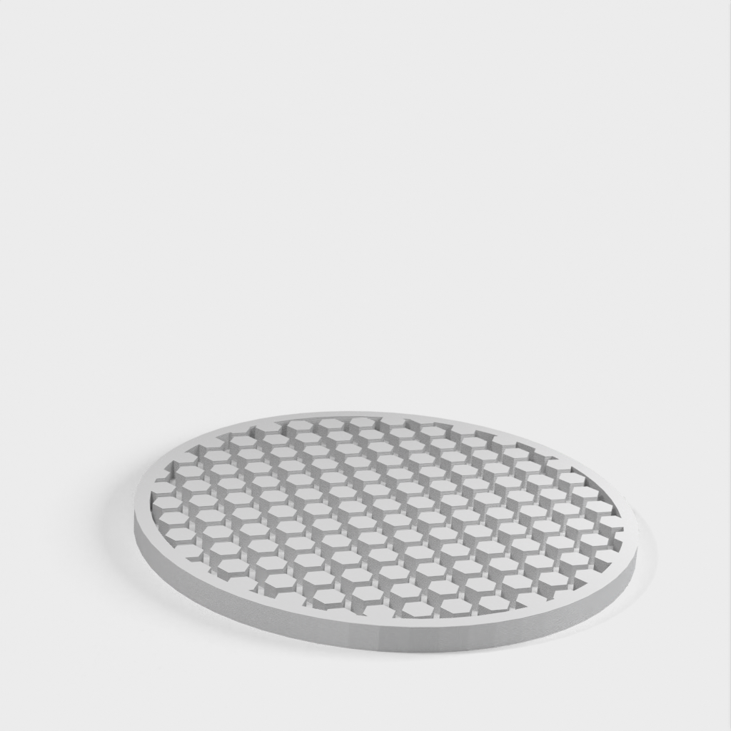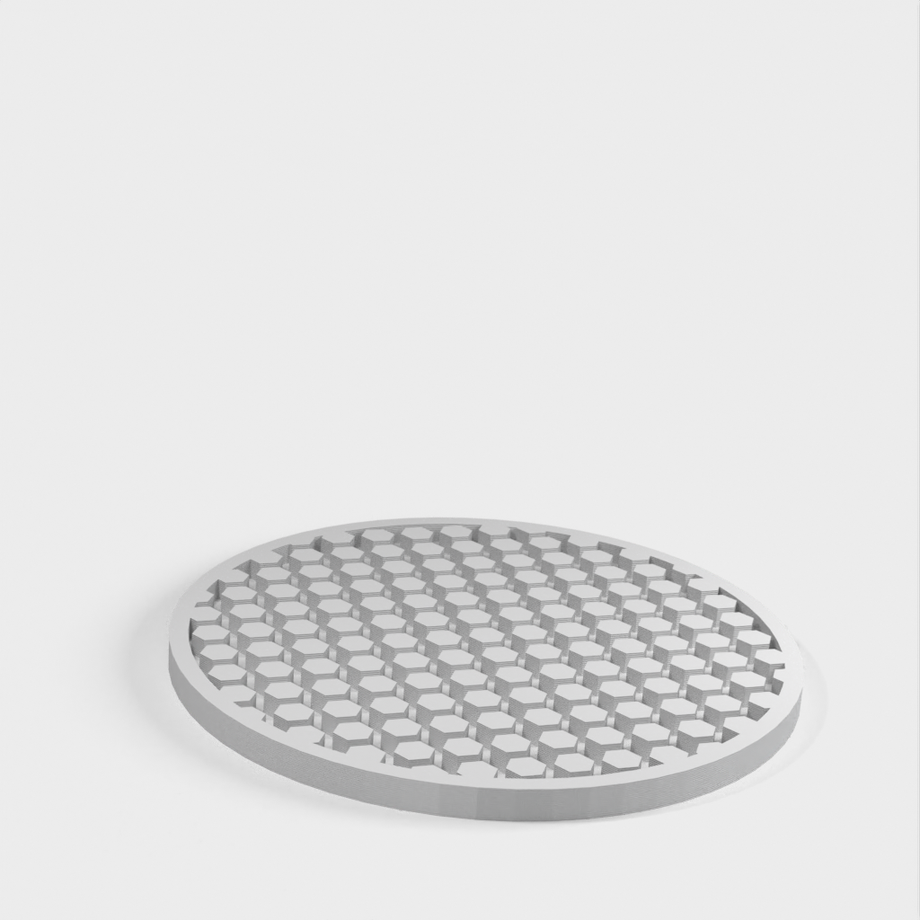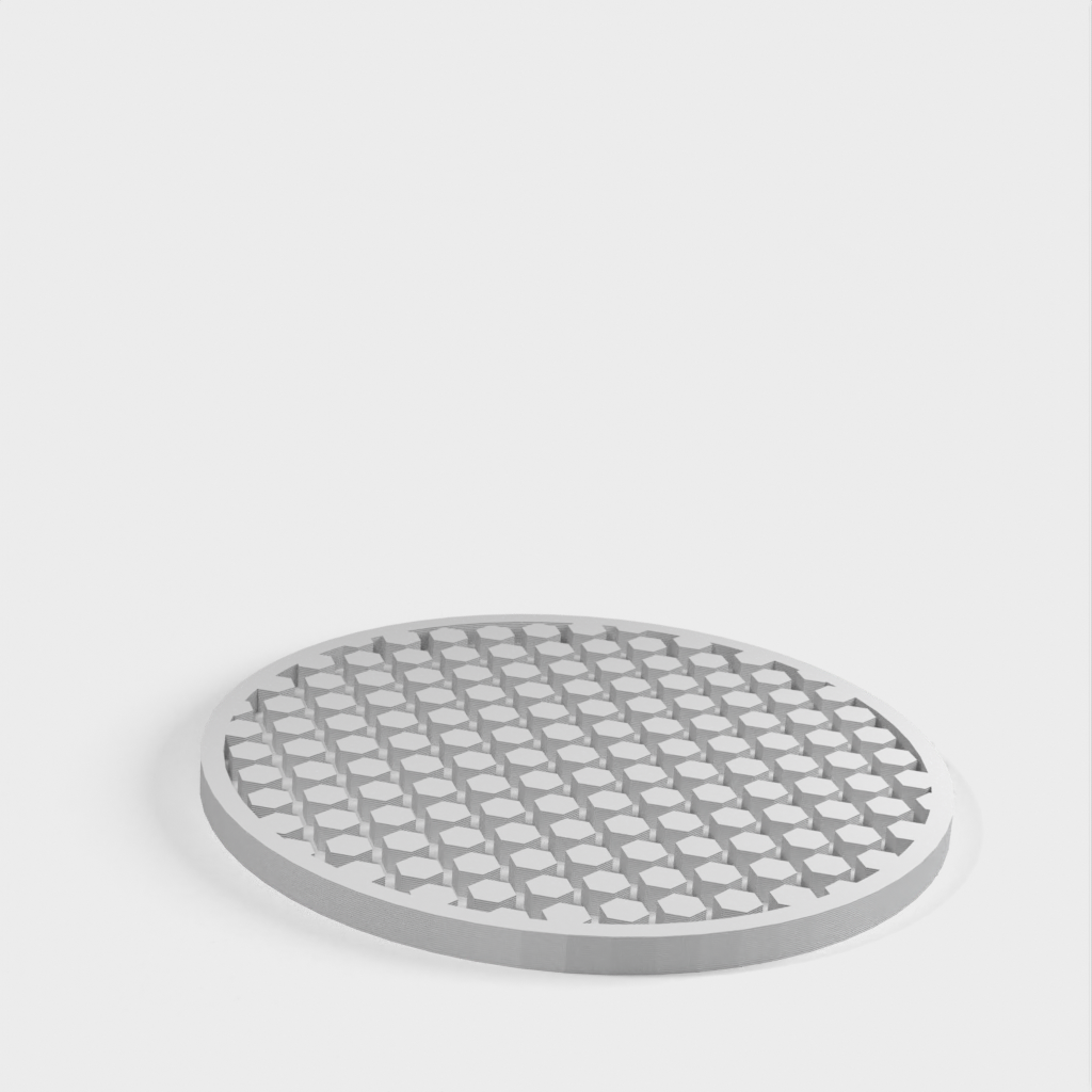 Dette er en simpel cirkulær coaster med et 'fyld' af sekskantede søjler. Den er ideel til at placere din kop eller glas på, for at beskytte dine møbler fra varme og kold drikke.
