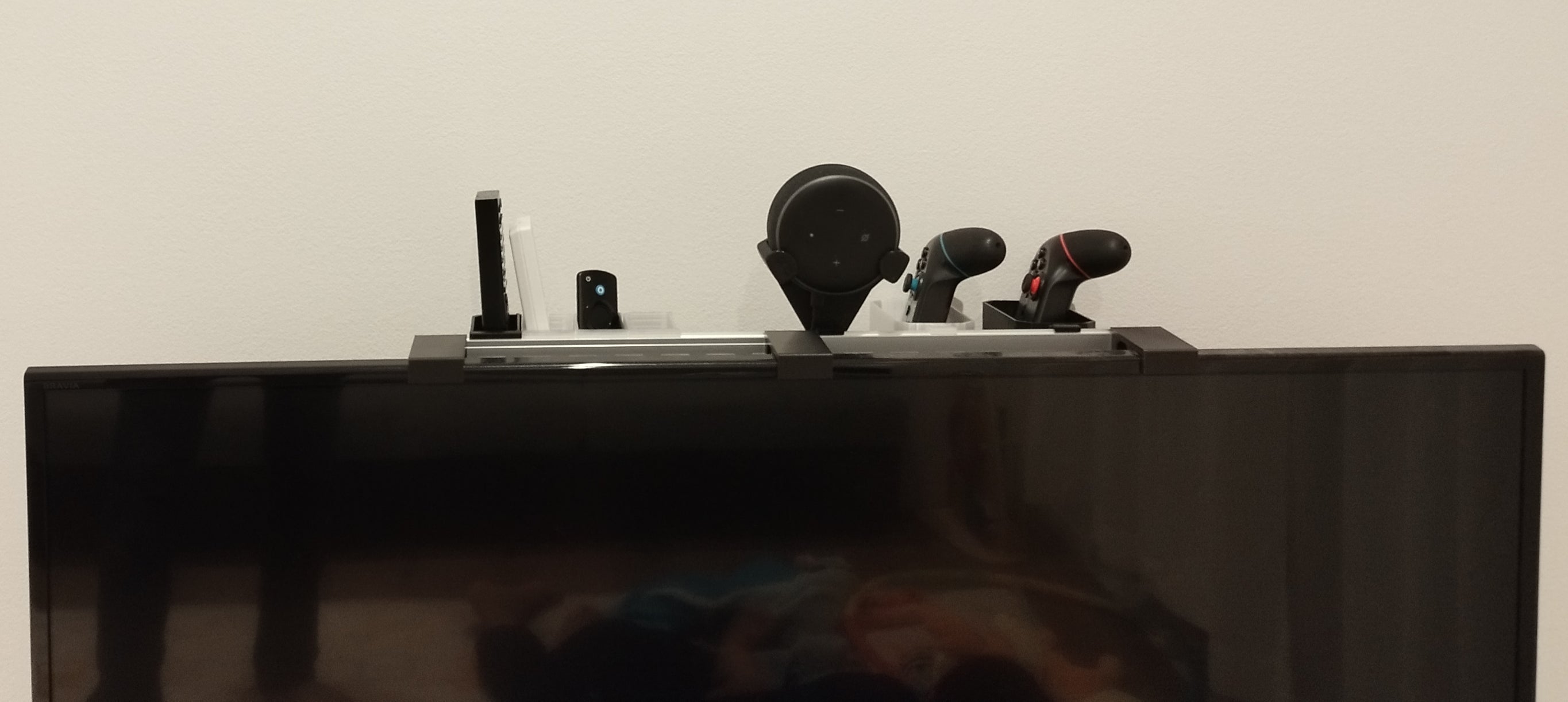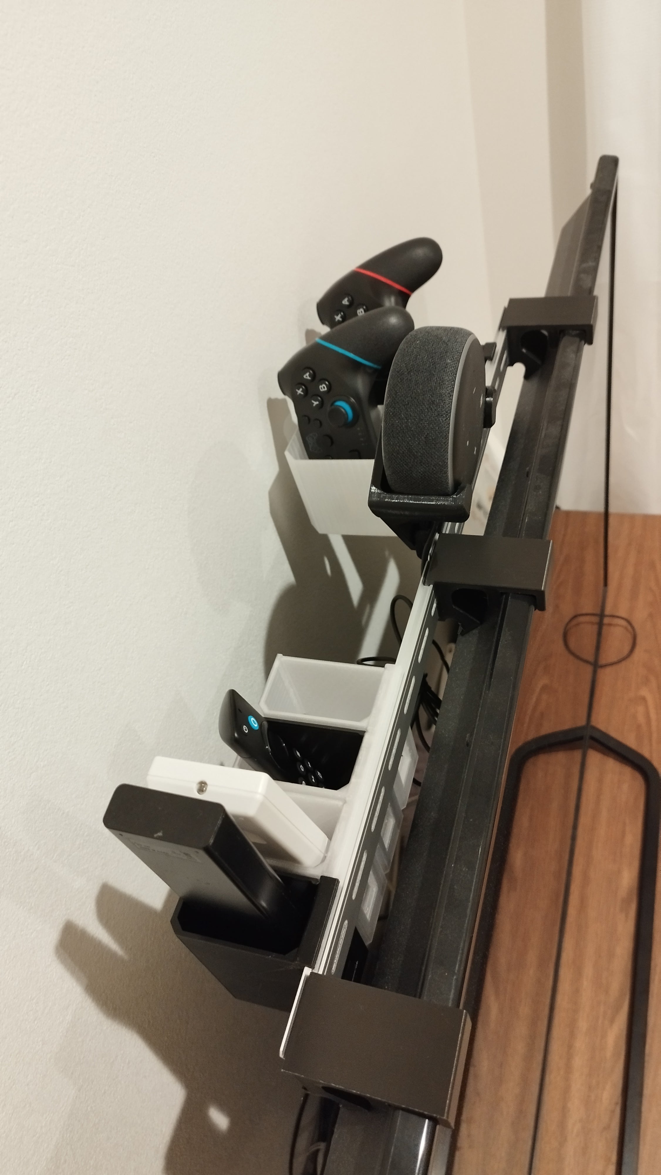Holderen er baseret på et fleksibelt DIN-skinne system, hvilket giver dig mulighed for at tilpasse opbevaringen præcist efter dine behov. Du kan nemt montere forskellige holdertyper på skinnen for at rumme alt fra din TV-fjernbetjening, AC-fjernbetjening og Fire TV-remote til en Amazon Echo Dot (3. gen) eller endda en Switch Pro Controller. Det modulære design gør det muligt at udvide skinnen med flere sektioner, hvis du har brug for yderligere opbevaringsplads. Vær opmærksom på, at TV'et skal kunne understøtte den ekstra vægt.
