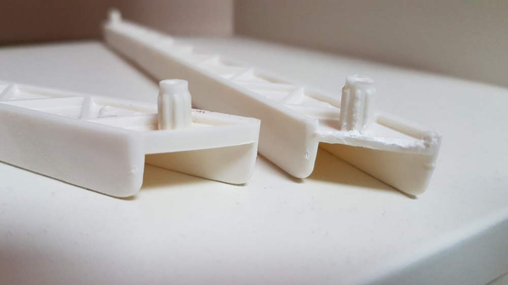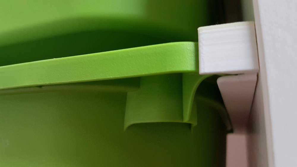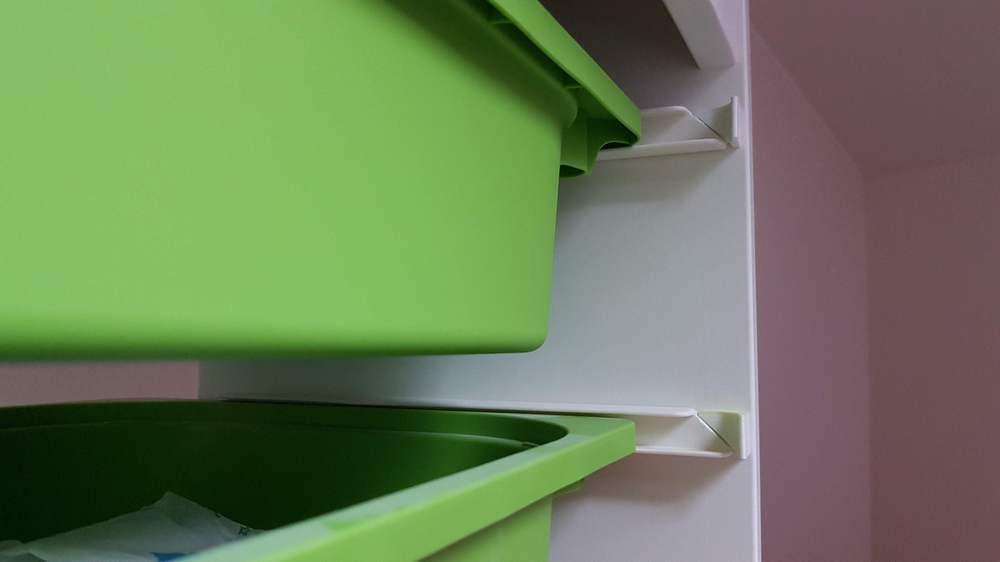The IKEA TROFAST end-stop is designed to stop the containers in your TROFAST furniture from sliding out the back, thus preventing wall damage from the containers pushing against it. Using this end-stop does not require screws, so it will not damage the wooden furniture.