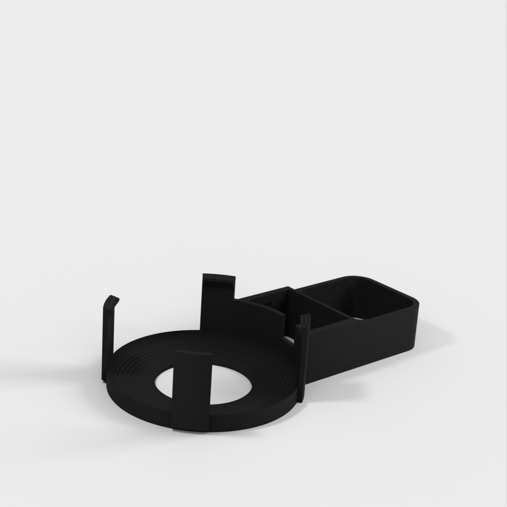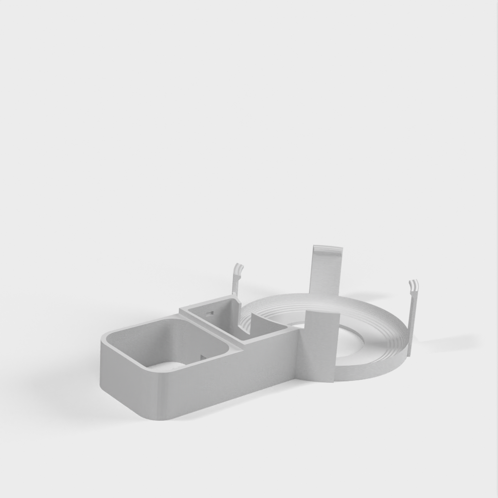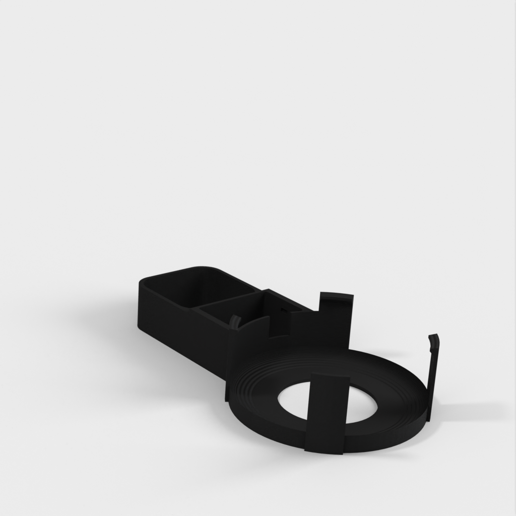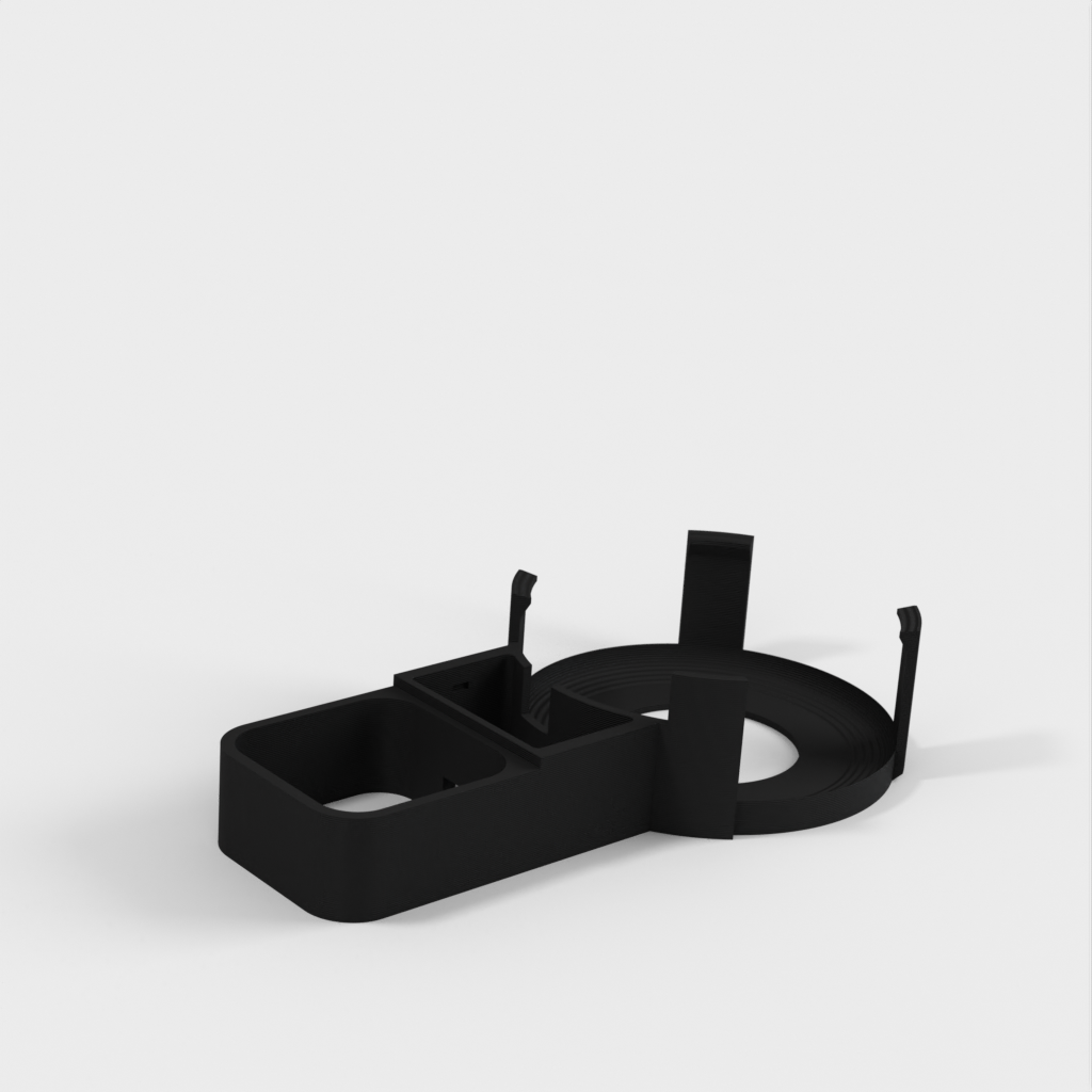 Beskrivelse af Amazon Echo Dot (3. generation) vægstikmontering. Denne montering er designet til at fastgøre din Echo Dot direkte til vægstikket, hvilket hjælper med at skjule ledningen og spare plads. Monteringen er designet til ikke at blokere højttalerne på din Echo Dot, hvilket sikrer optimal lydoplevelse. Ud over Echo Dot holderen, omfatter sættet en bunddel, der glider på undersiden af strømforsyningen og giver plads til vikling af ledningen rundt om et centralt 'kerne', en topdel der skubber ned over toppen af strømforsyningen og klikker fast på bunddelen, samt et cover til at dække området hvor kablet går ind i Echo Dot.