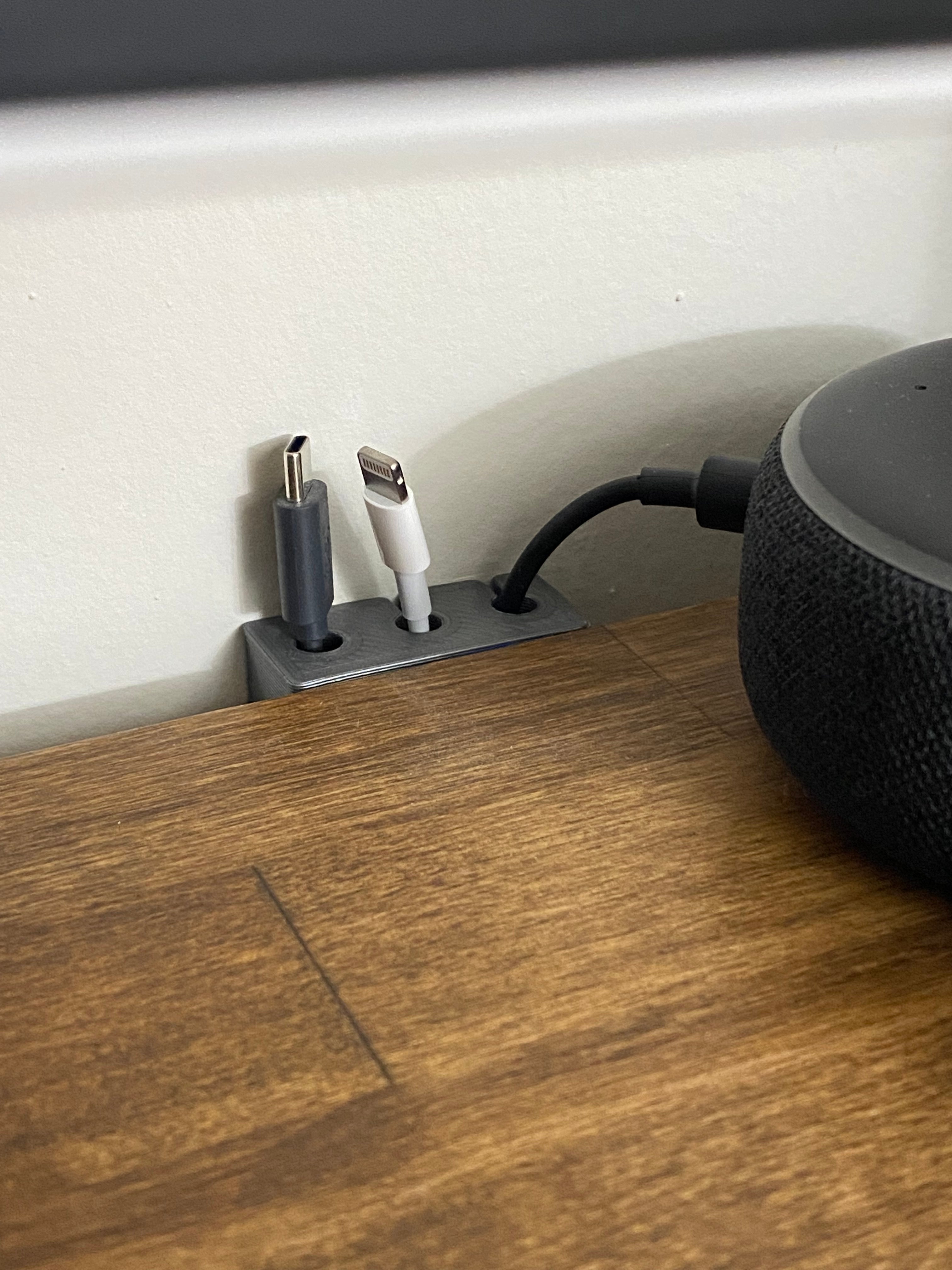 Dette er en kabelholder produceret i TPU for fleksibilitet. Den holder sig fast ved hjælp af tape og friktion mellem skrivebordet og væggen, hvilket garanterer mat og sikker opbevaring af dine kabler.
