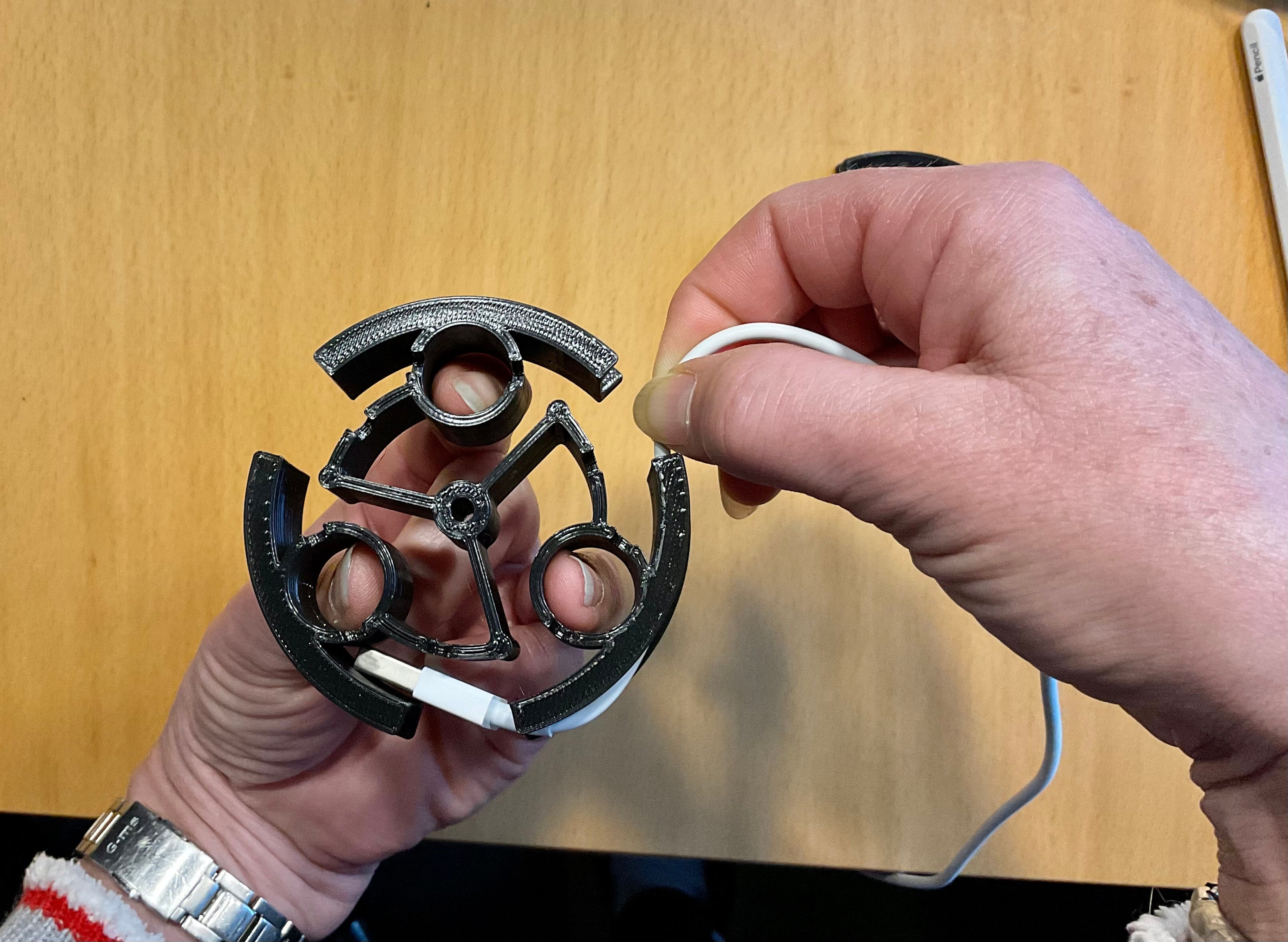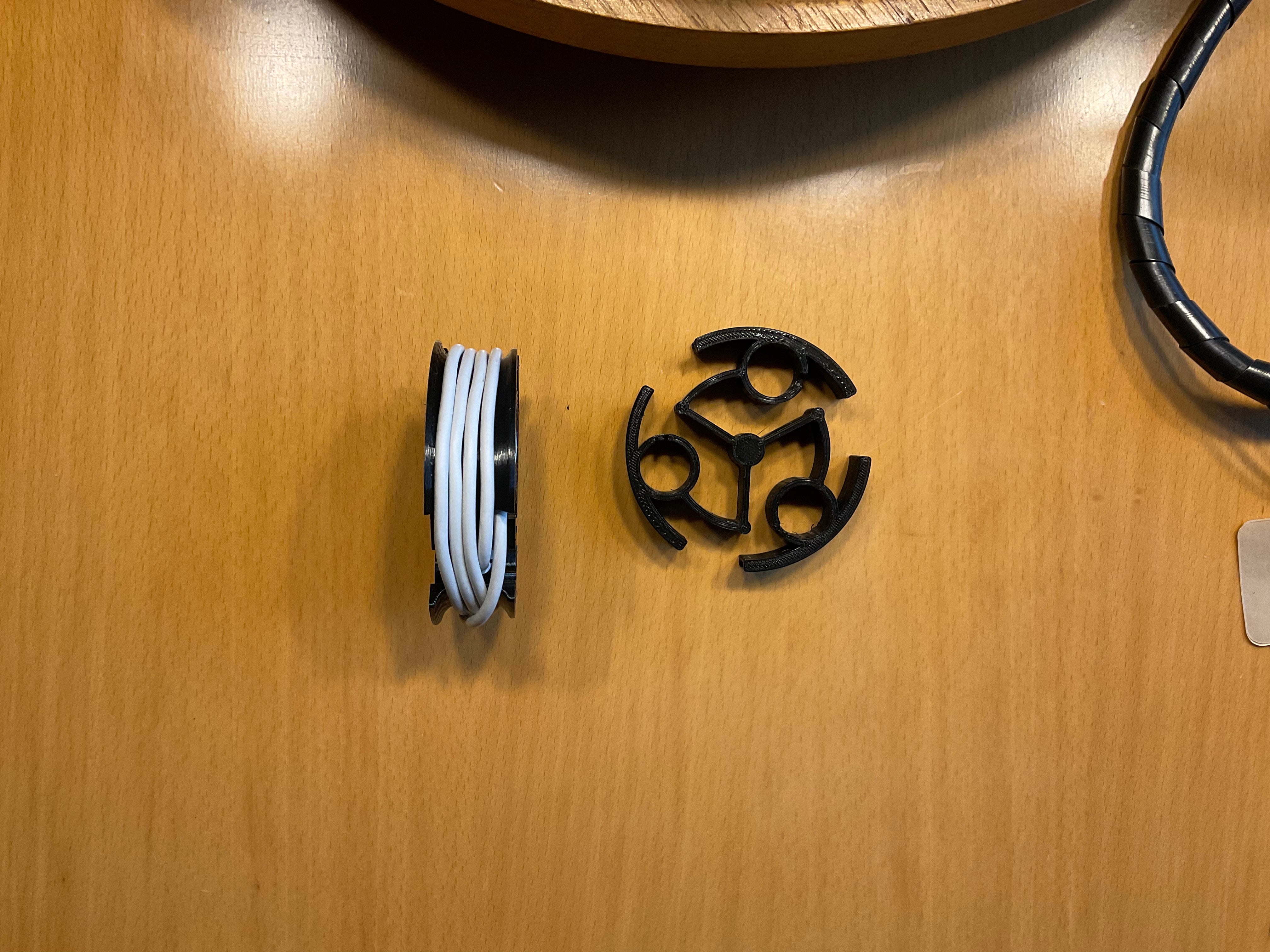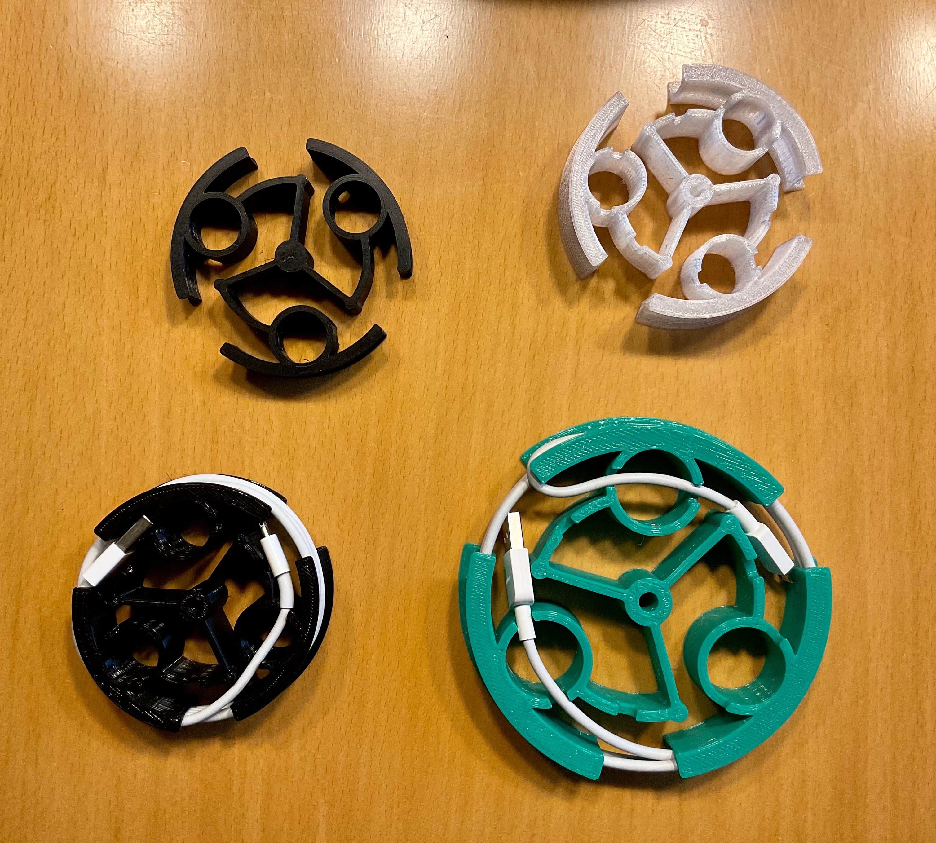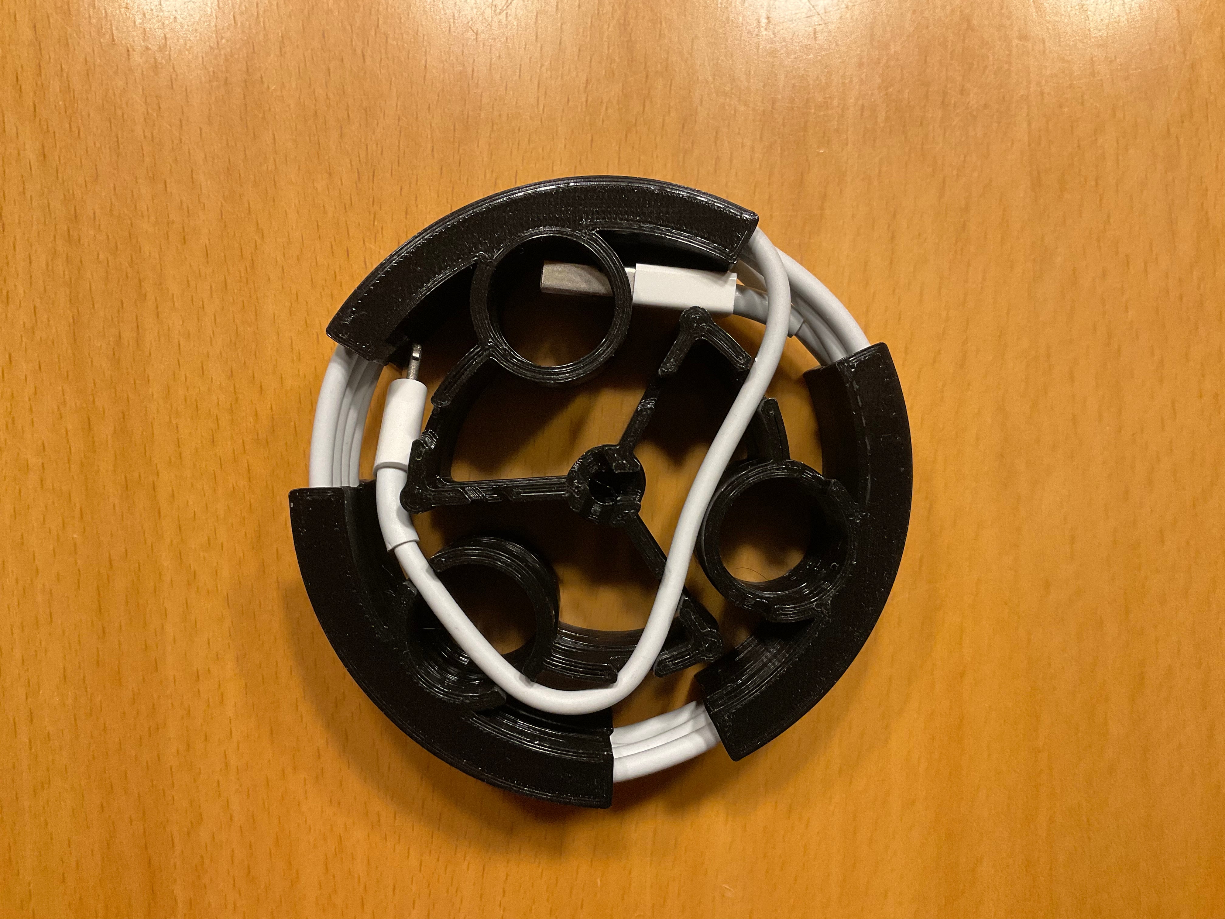 Dette er en fleksibel kabelorganisator beregnet for telefon- eller tablet-kabler. Den er designet til nemt at kunne printes som en enkelt enhed uden behov for understøttelse og kan nemt skaleres i forhold til kabelens længde og tykkelse.