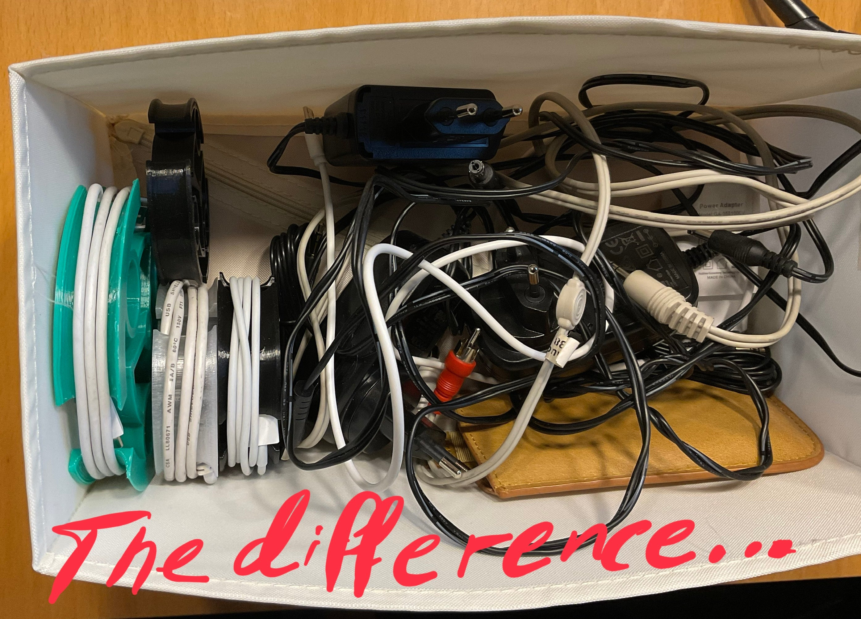 - Hjælper med at skabe orden i skuffen, da kablerne kan stables som filmruller for at reducere tryk.