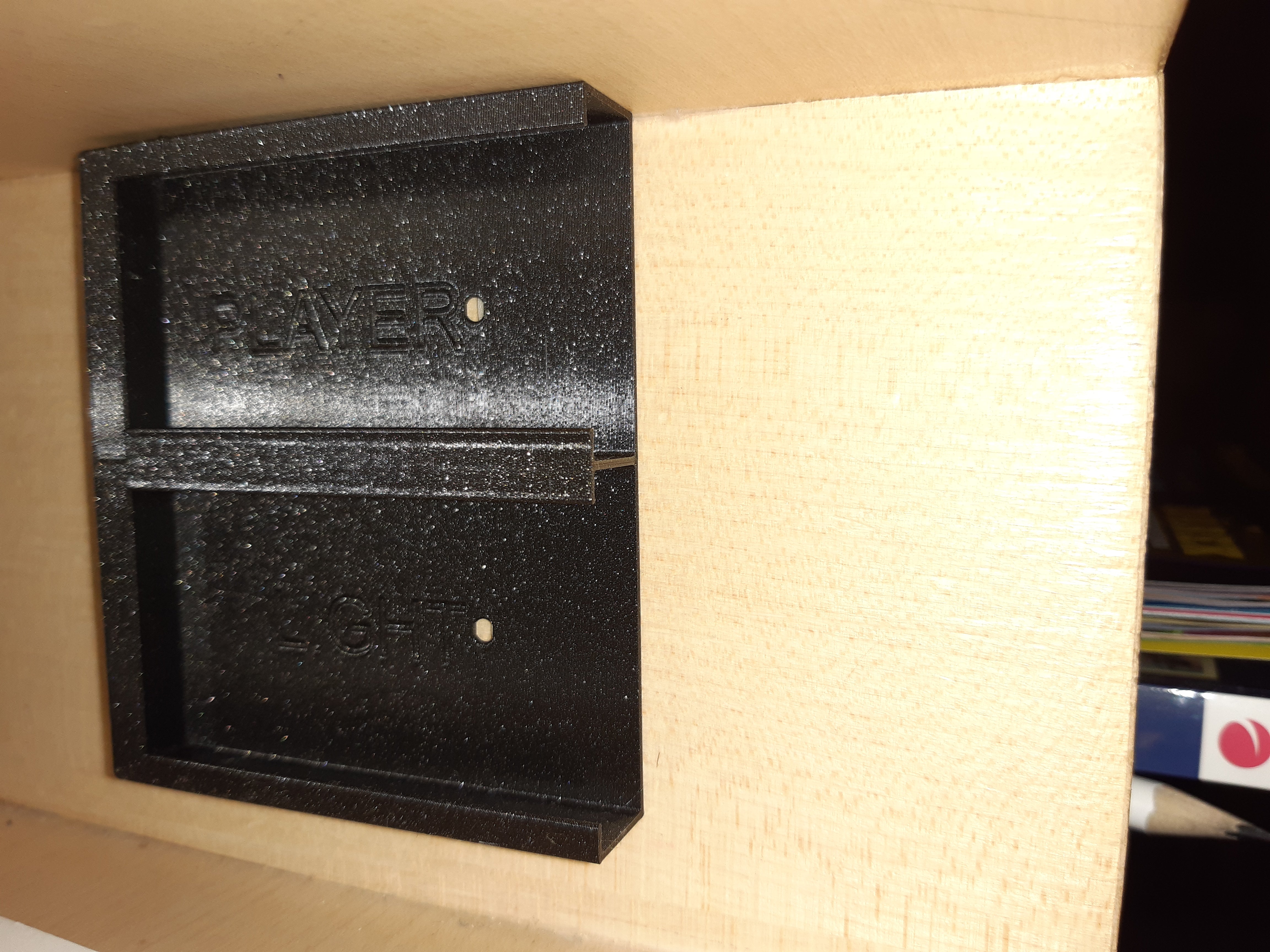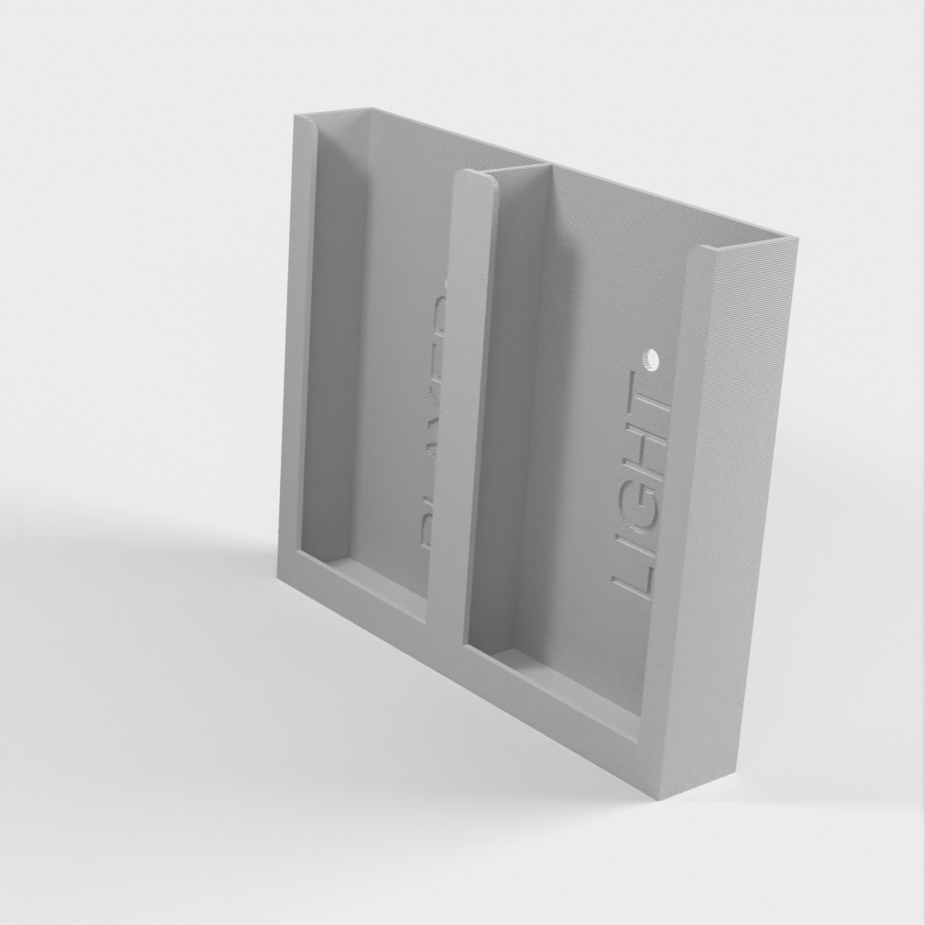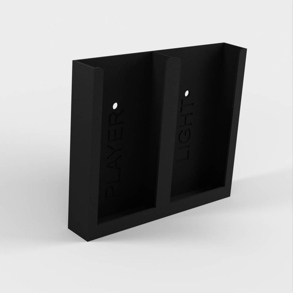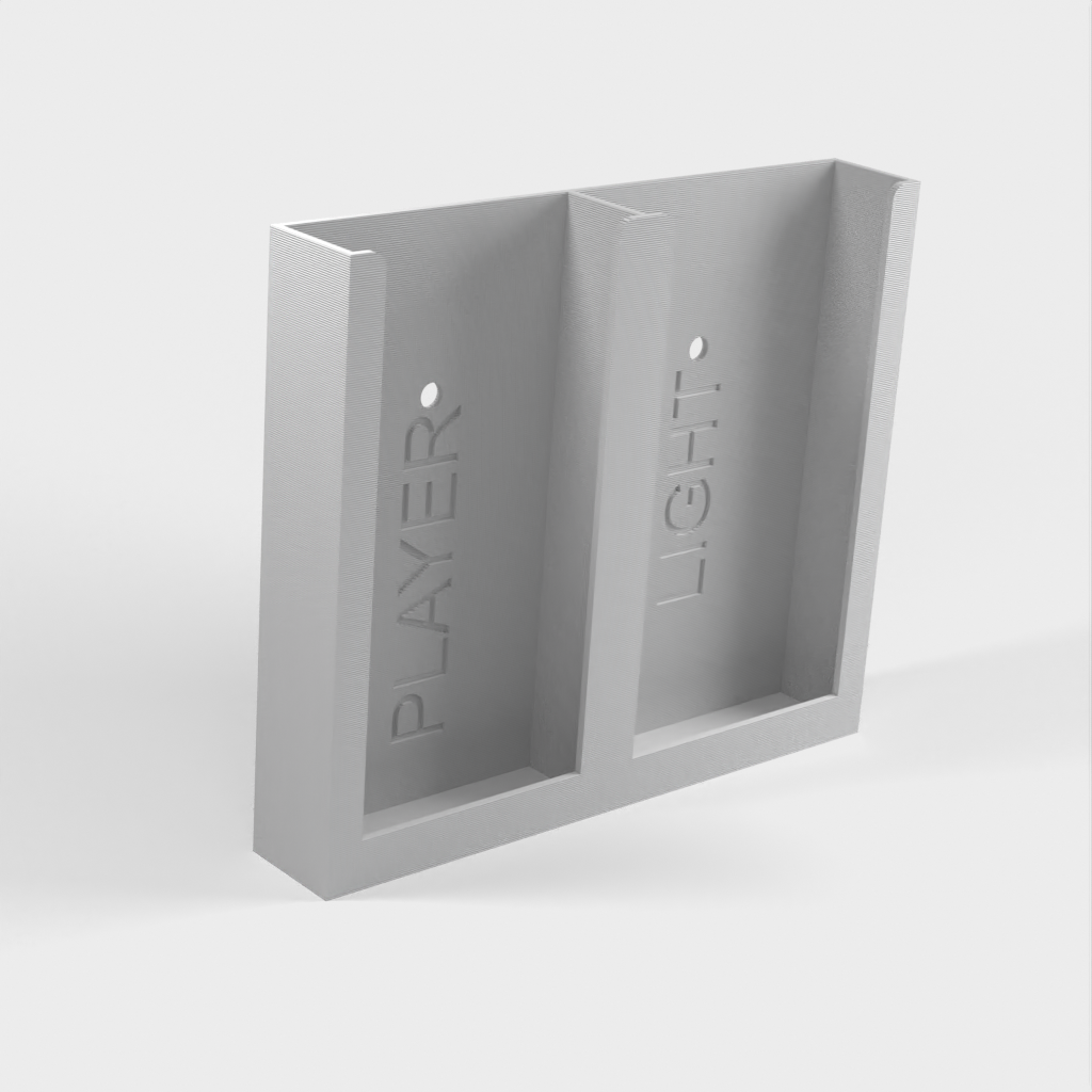 Dette er en simpel holder, der kan rumme 2 fjernbetjeninger. Den kan installeres enten vertikalt eller horisontalt. Du kan fastgøre det enten med to skruer eller med dobbeltsidet tape, alt efter hvad der passer bedst ind i dit hjem.
