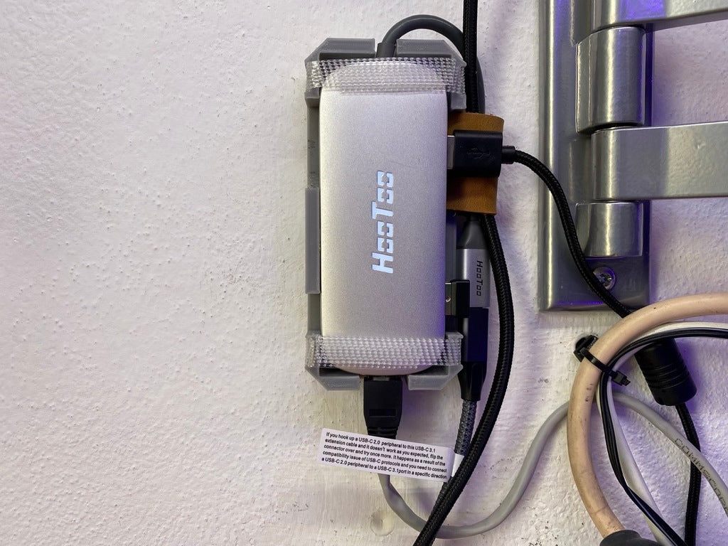 Med denne <strong>kabelholder</strong> kan du nemt styre dine tilslutninger og bevare et organiseret setup. Den er ideel til brug med et USB-C forlængerkabel, hvilket giver fleksibilitet i placeringen af din hub. Selvom holderen er fastmonteret, er den udformet, så din enhed let kan tages ud og transporteres, hvis du eksempelvis skal bruge den på kontoret eller et andet sted, hvilket giver en praktisk og flytbar løsning for din USB-C-hub.