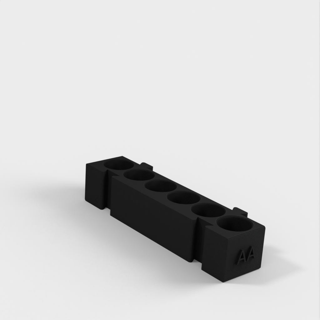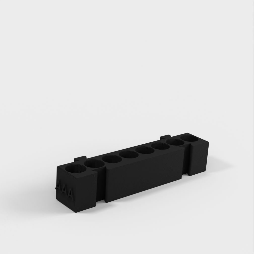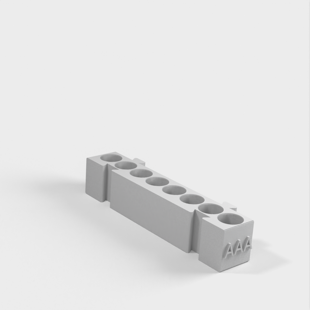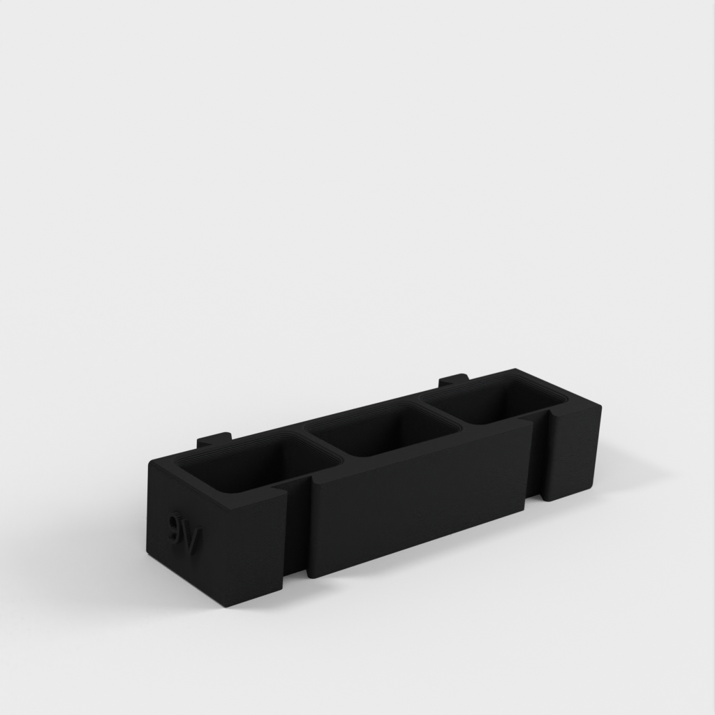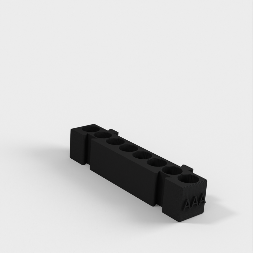 Dette er en modulær batteriholder, der tilbyder forskellige holdere for hver type batteri. Alle holdere har samme længde og kan klippes sammen i enhver kombination, du ønsker. Det er en ideel løsning til at organisere skrivebordet og holde styr på dine batterier. Tilføjelse af en AA-batteriholder og en møntholder til samlingen øger dets funktionalitet yderligere.