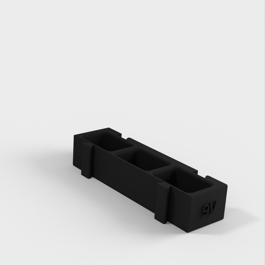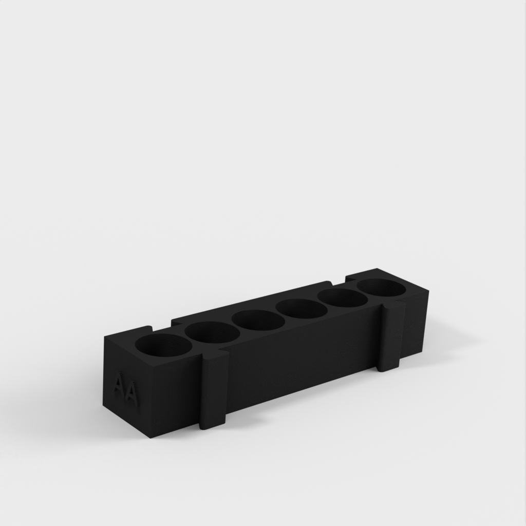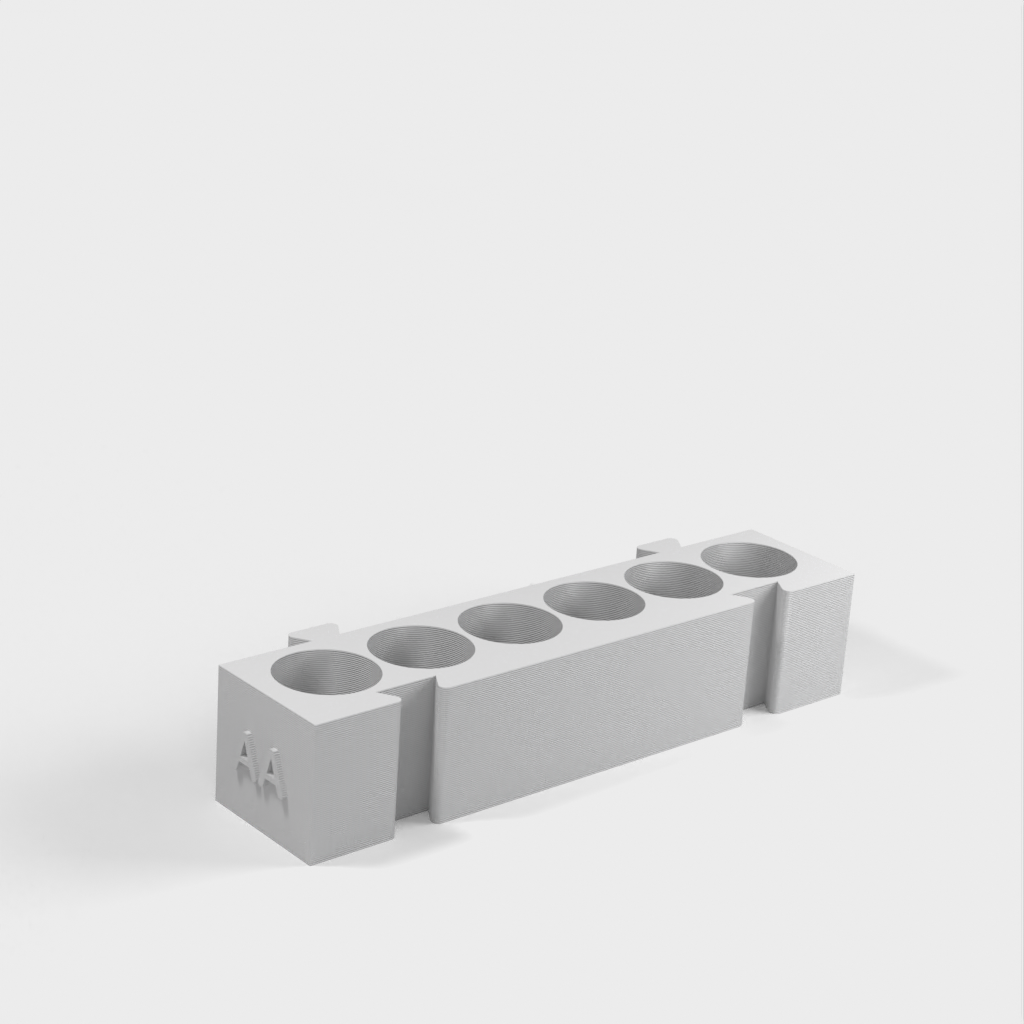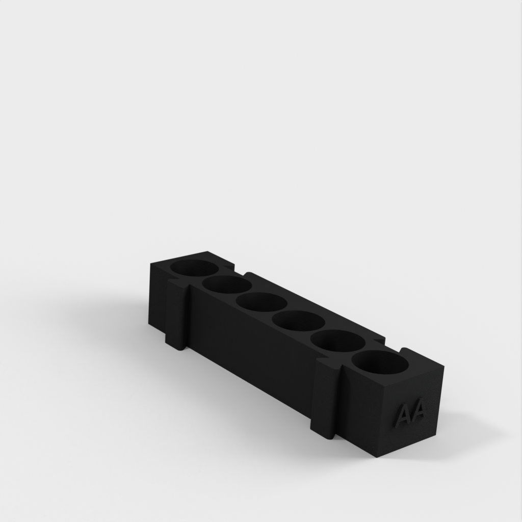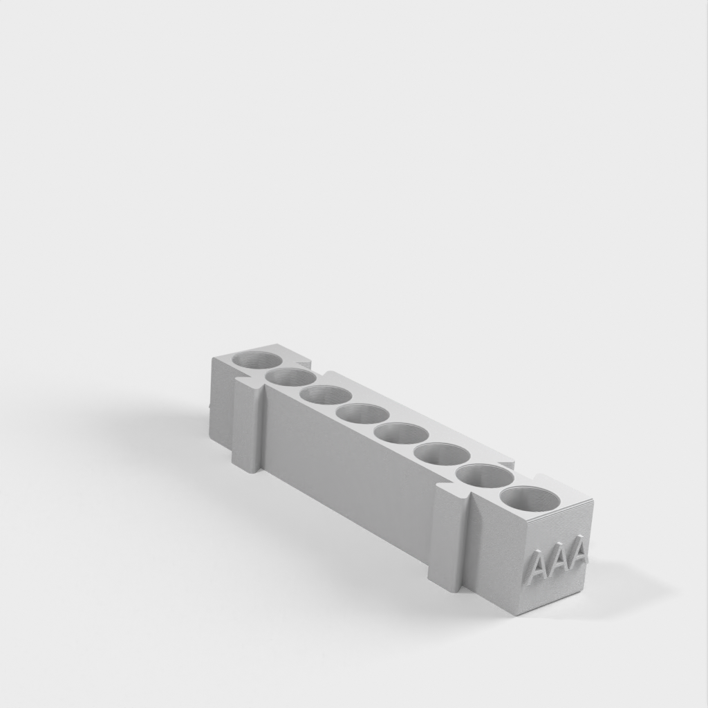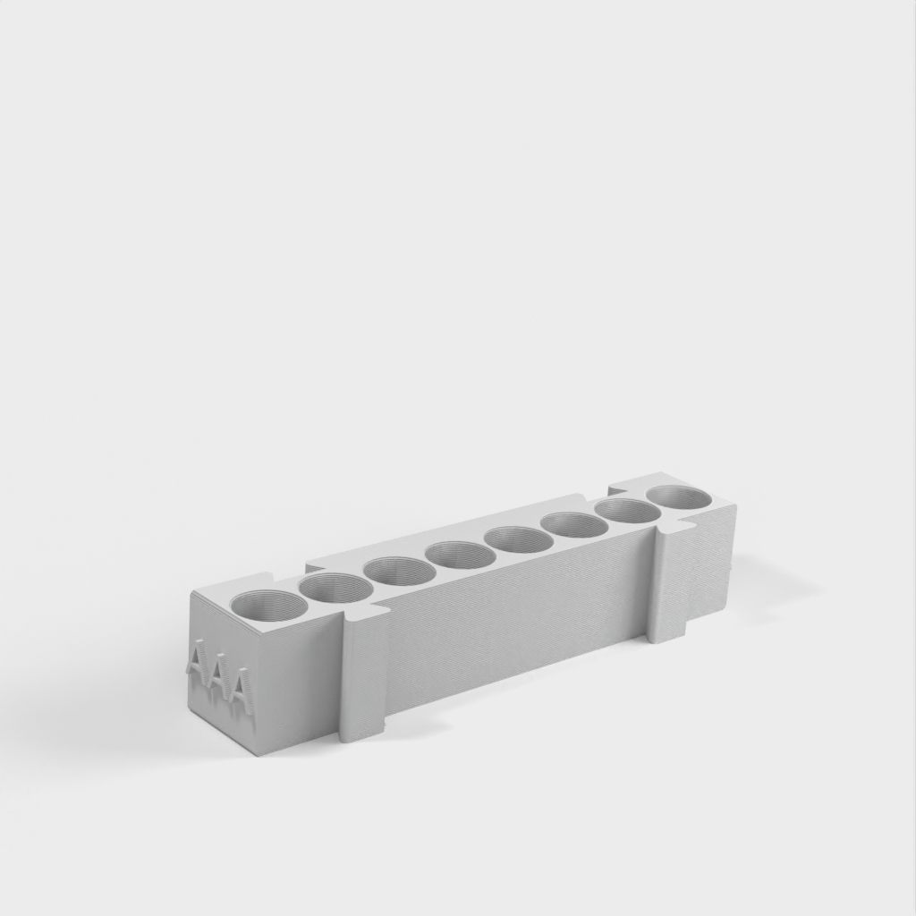 Dette er en modulær batteriholder, der tilbyder forskellige holdere for hver type batteri. Alle holdere har samme længde og kan klippes sammen i enhver kombination, du ønsker. Det er en ideel løsning til at organisere skrivebordet og holde styr på dine batterier. Tilføjelse af en AA-batteriholder og en møntholder til samlingen øger dets funktionalitet yderligere.
