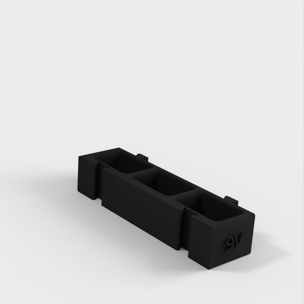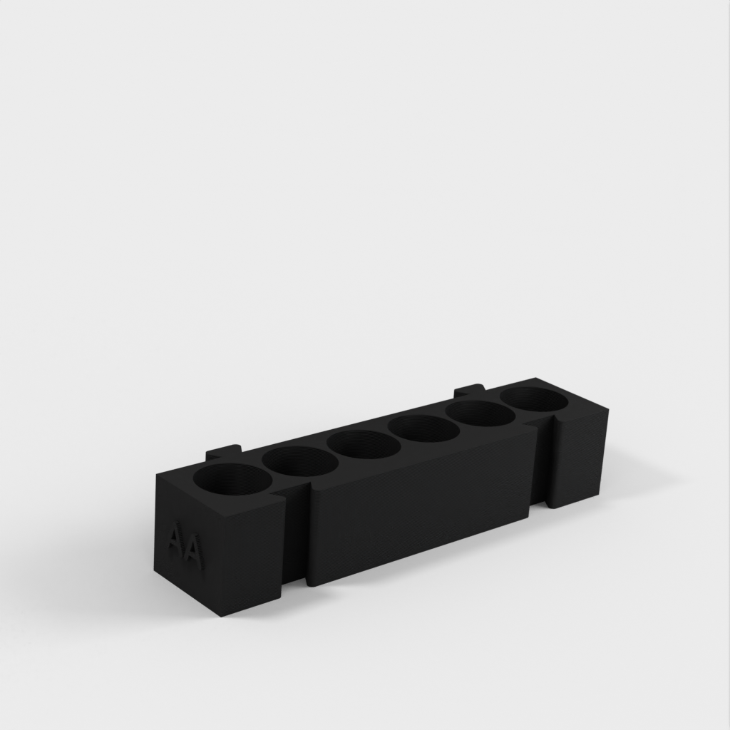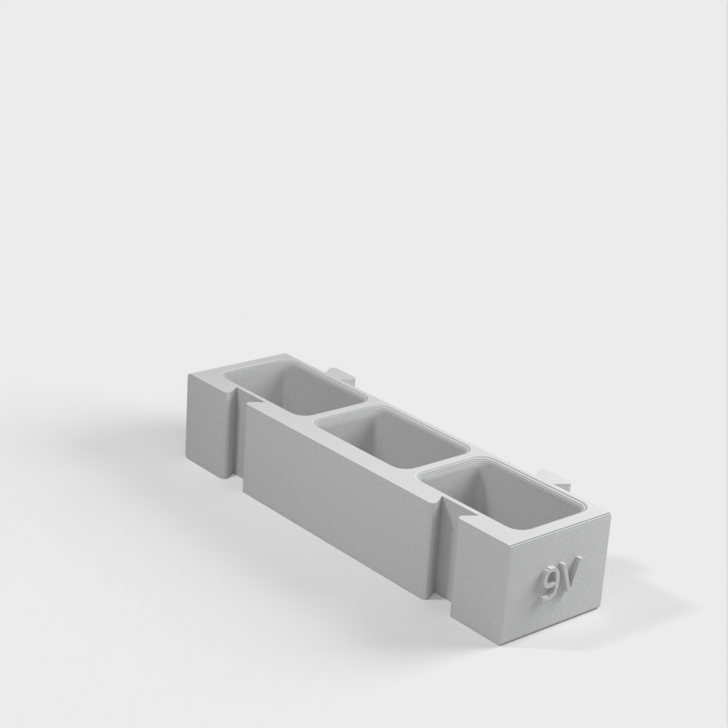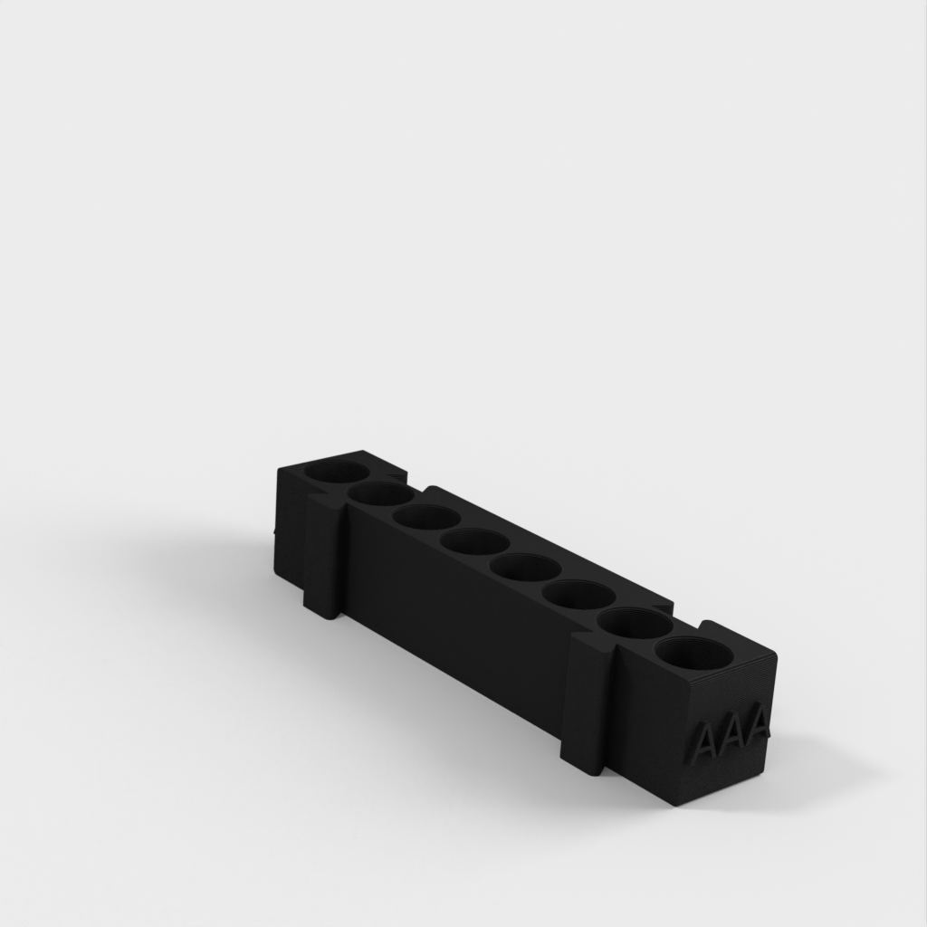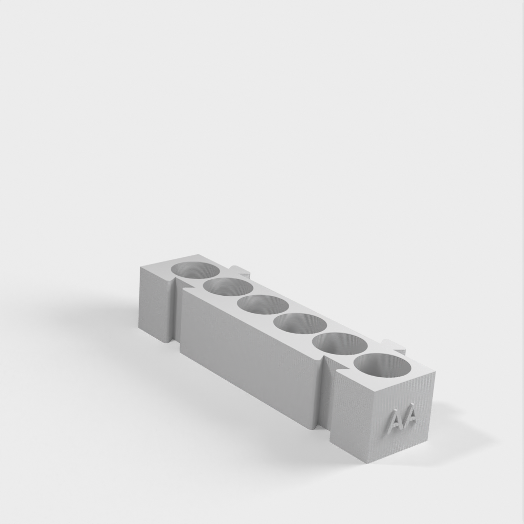 Dette er en modulær batteriholder, der tilbyder forskellige holdere for hver type batteri. Alle holdere har samme længde og kan klippes sammen i enhver kombination, du ønsker. Det er en ideel løsning til at organisere skrivebordet og holde styr på dine batterier. Tilføjelse af en AA-batteriholder og en møntholder til samlingen øger dets funktionalitet yderligere.