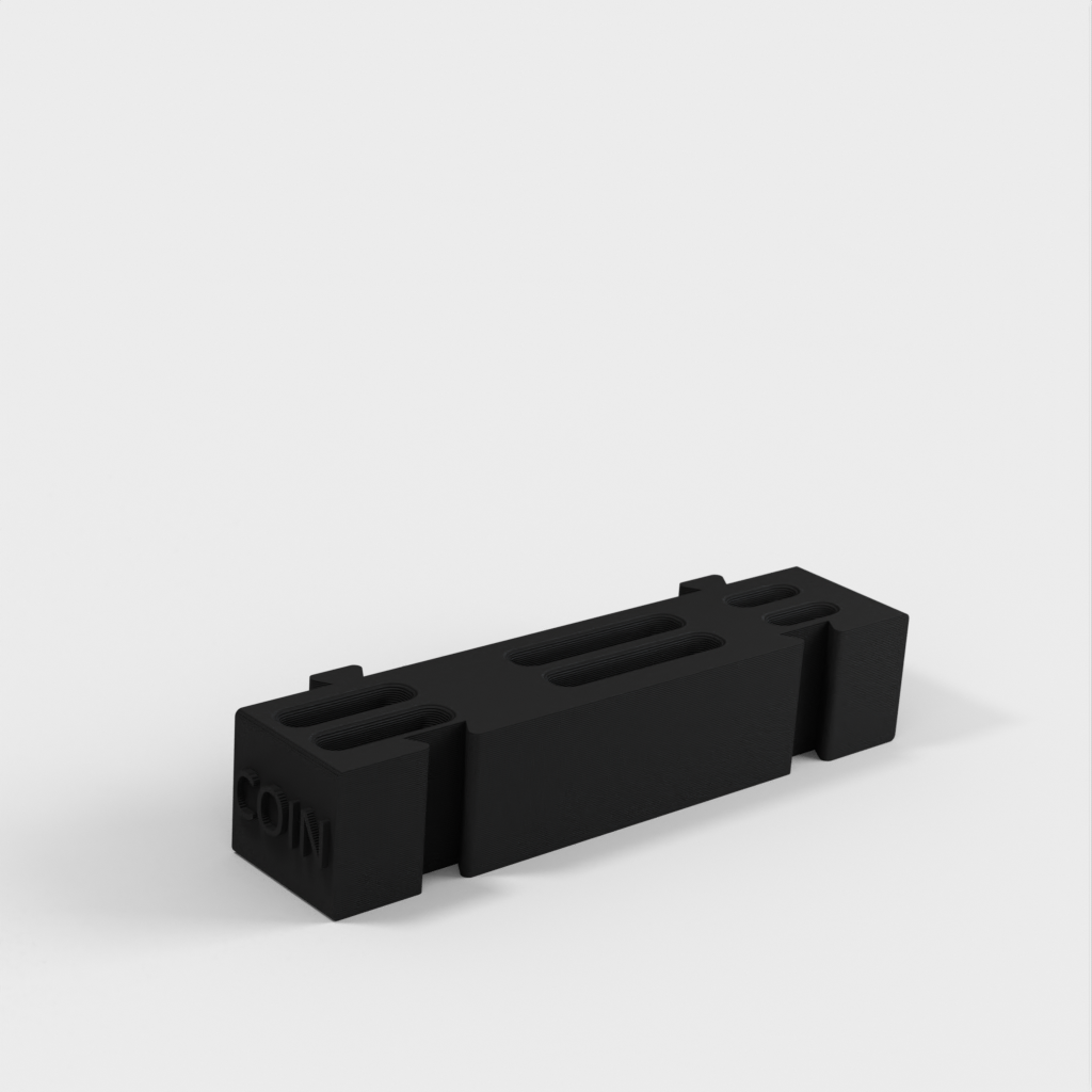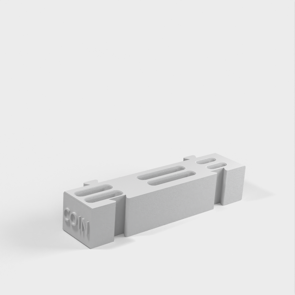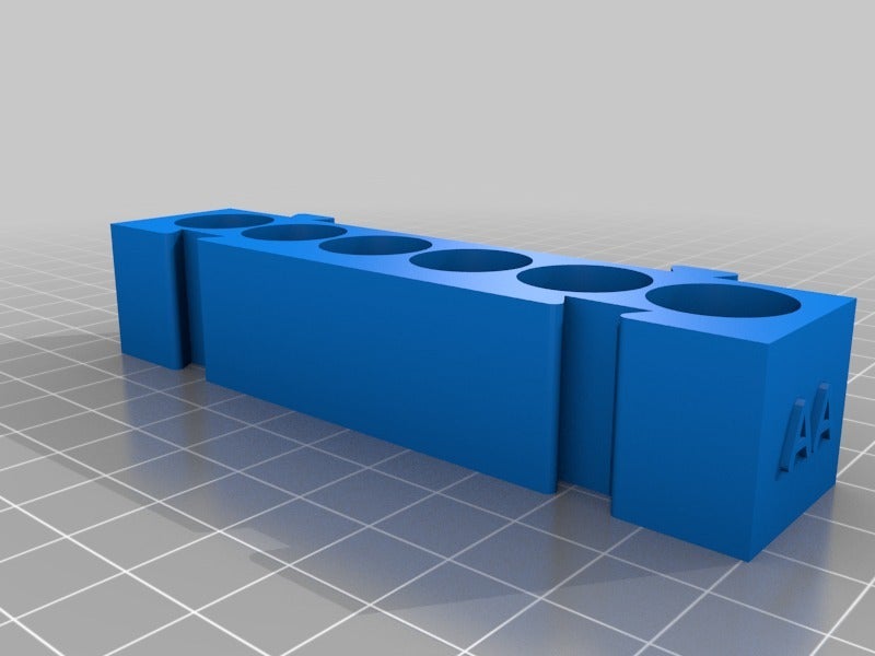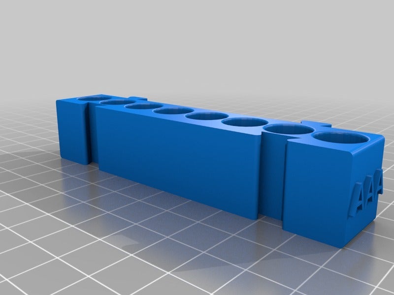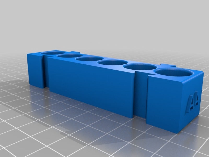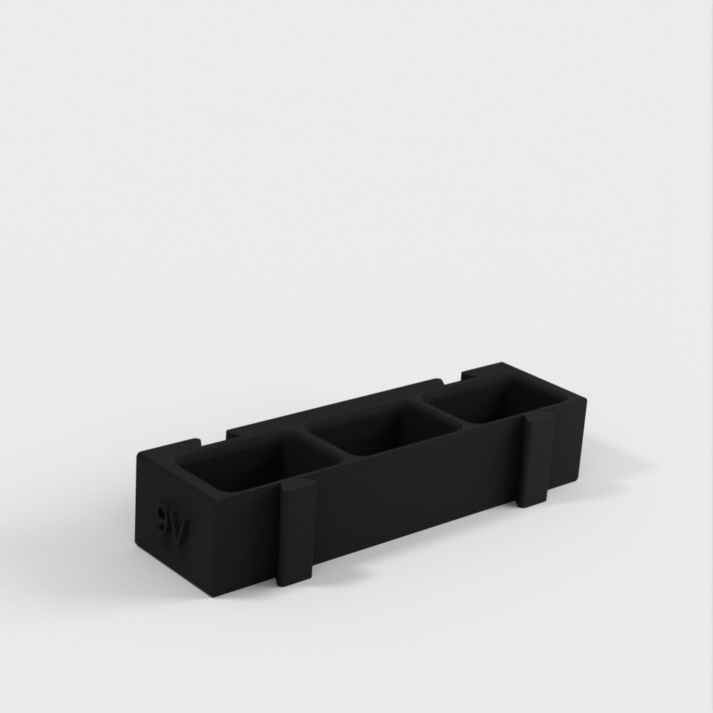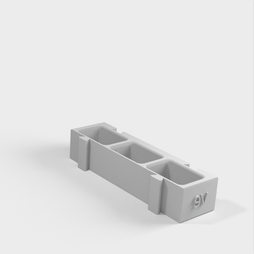 Dette er en modulær batteriholder, der tilbyder forskellige holdere for hver type batteri. Alle holdere har samme længde og kan klippes sammen i enhver kombination, du ønsker. Det er en ideel løsning til at organisere skrivebordet og holde styr på dine batterier. Tilføjelse af en AA-batteriholder og en møntholder til samlingen øger dets funktionalitet yderligere.