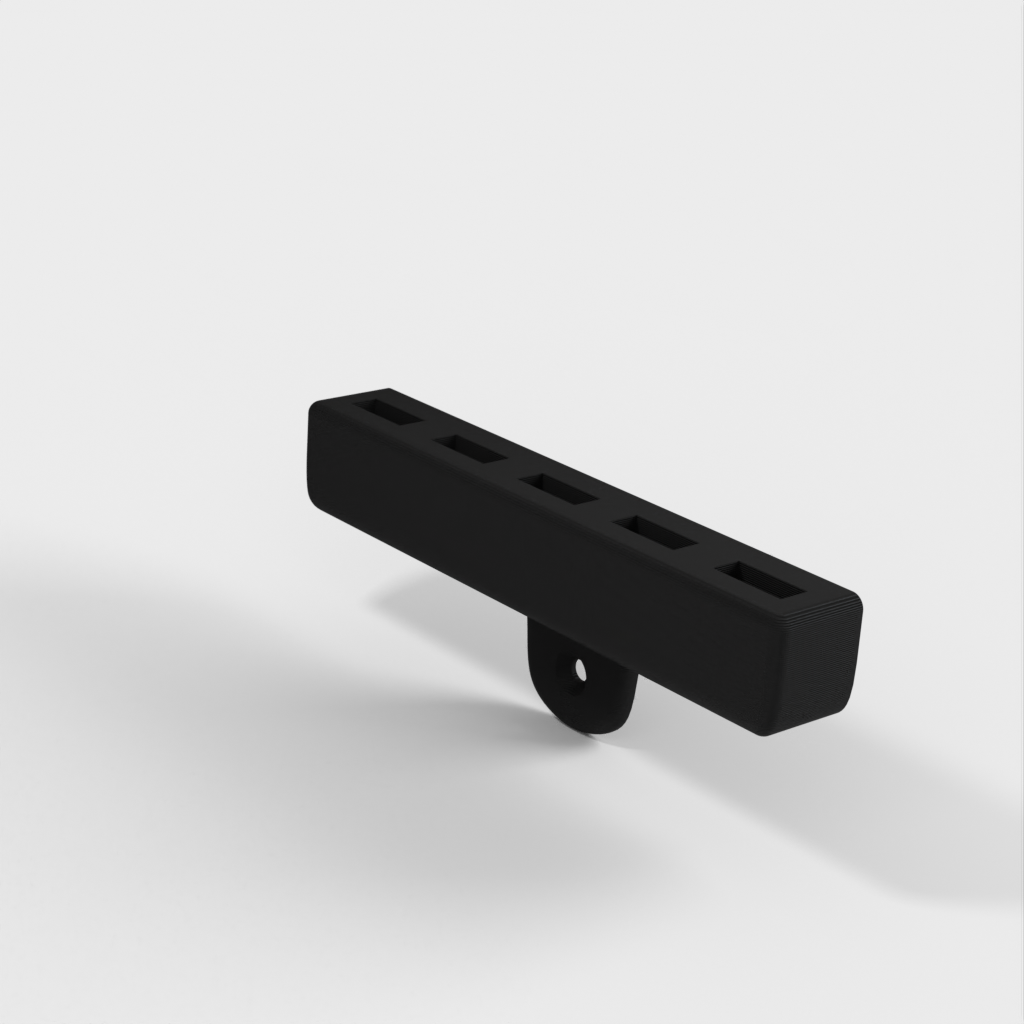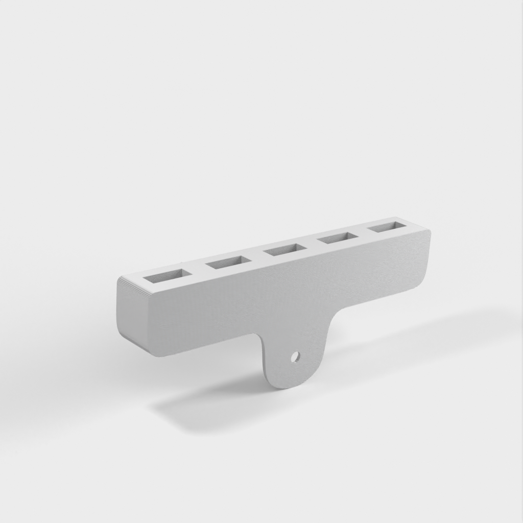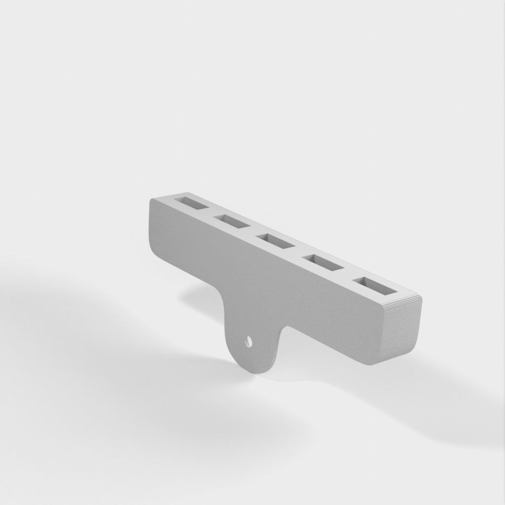 Dette er en USB-holder med plads til 5 kabler designet til at hænge på væggen ved siden af dit skrivebord, så dine kabler holdes ude af vejen, men let tilgængelige. Produktet er konstrueret til at hænge nedad og fastgøres til væggen ved hjælp af skruer. Det er nødvendigt at være en smule forsigtig, når du skruer den til væggen for ikke at splitte den øverste del.
