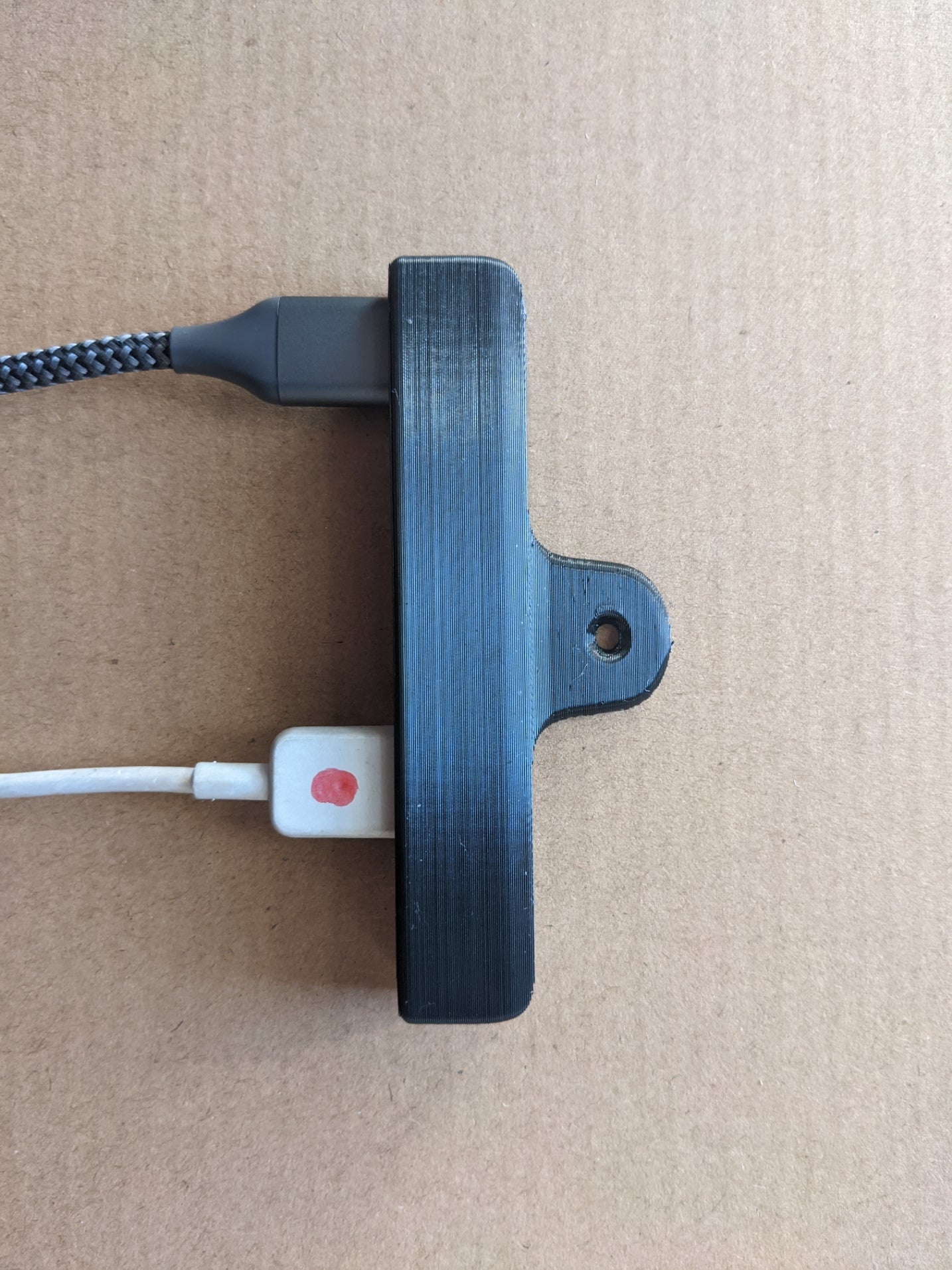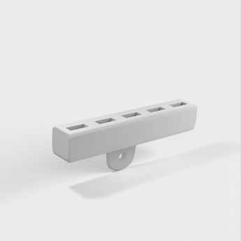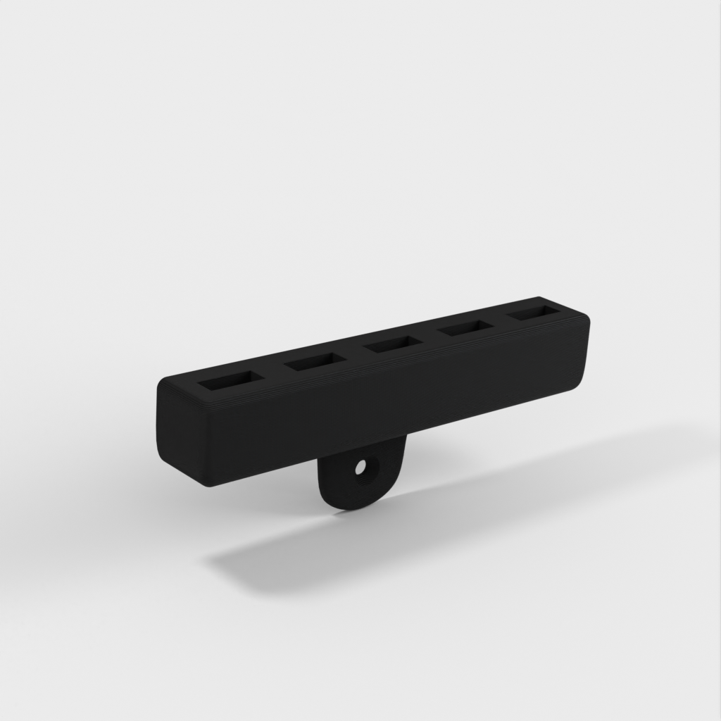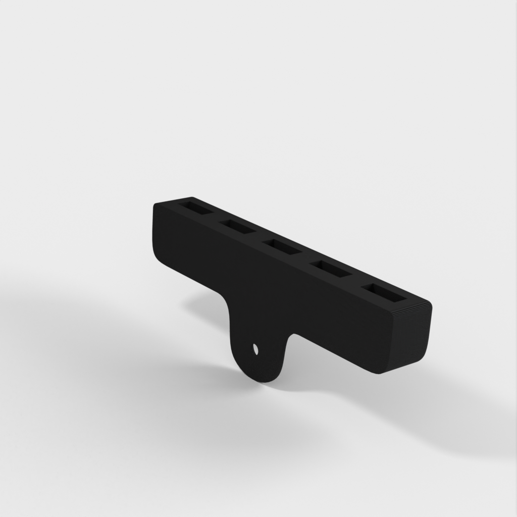 Dette er en USB-holder med plads til 5 kabler designet til at hænge på væggen ved siden af dit skrivebord, så dine kabler holdes ude af vejen, men let tilgængelige. Produktet er konstrueret til at hænge nedad og fastgøres til væggen ved hjælp af skruer. Det er nødvendigt at være en smule forsigtig, når du skruer den til væggen for ikke at splitte den øverste del.