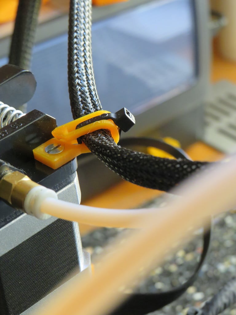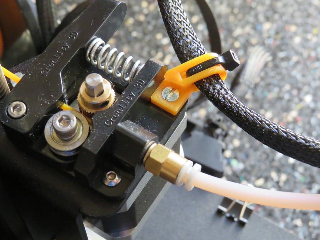 Til installation kræves en skrue, der er lidt længere end den originale, for at sikre en solid fastgørelse. Selvom det ikke er absolut nødvendigt, kan en valgfri kabelbinder anvendes for ekstra sikkerhed og for at holde kablerne pænt på plads, hvilket bidrager til en organiseret opsætning af din 3D-printer. Dette enkle, men effektive tilbehør hjælper med at holde dit arbejdsområde ryddeligt og dine kabler beskyttede.