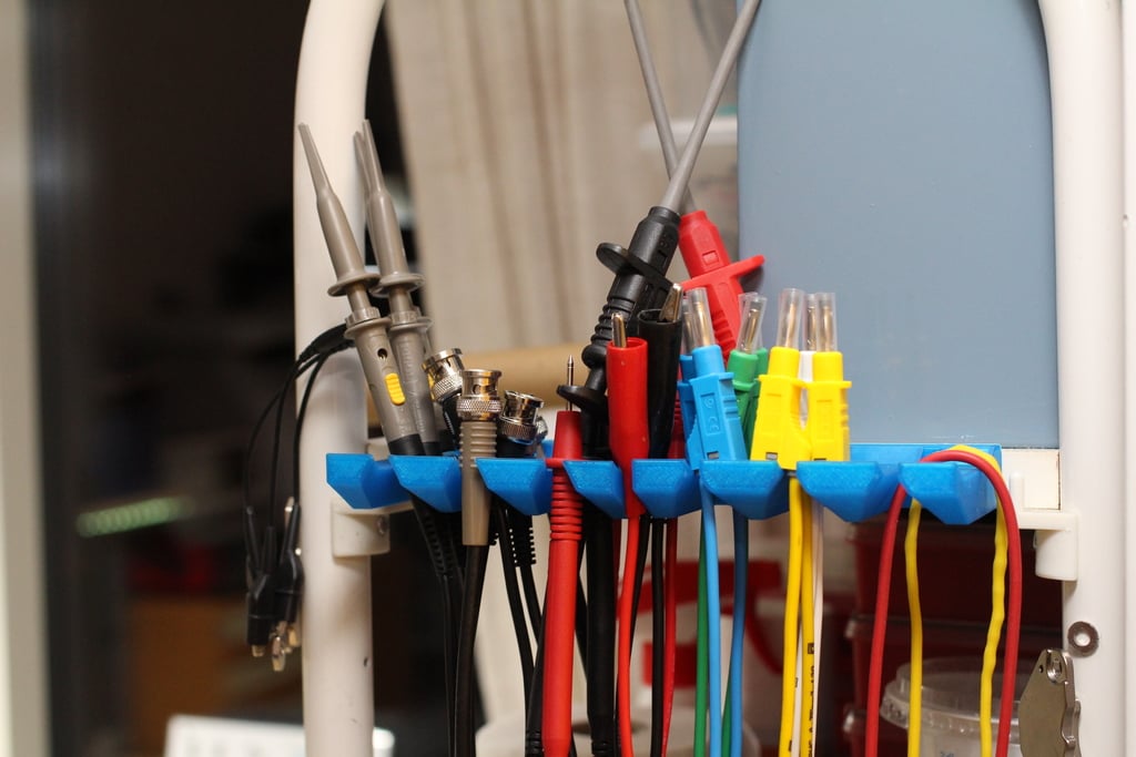 Dette kabelophæng er designet til at hjælpe med at holde diverse kabler og ledninger organiseret i laboratoriemiljøer. Det er særligt velegnet til måleledninger og prober, herunder dem med bananstik, hvilket sikrer, at de forbliver pænt samlet og let tilgængelige. Hver slot måler 5 mm i bredden, hvilket passer til mange standardkabler.
