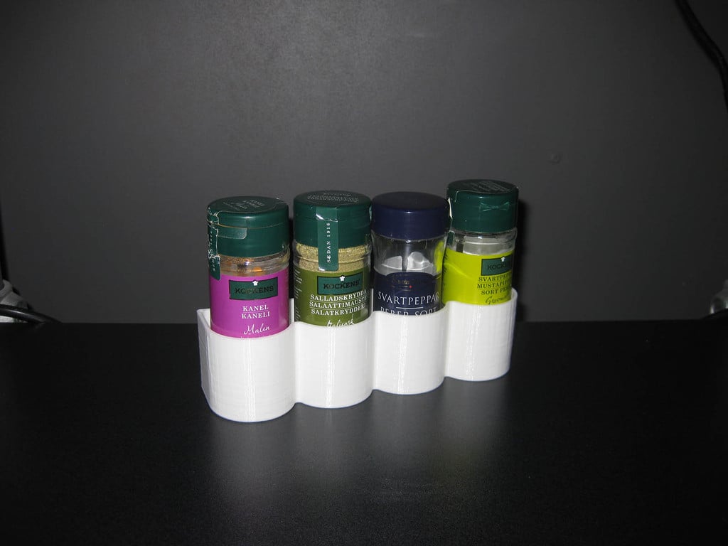 En simpel holder til fire krydderiglas. 42mm høj og 183mm bred med en maksimal diameter på 43mm dåser. Med denne holder kan du nemt opbevare dine krydderier og skabe et ryddeligt køkkenmiljø.