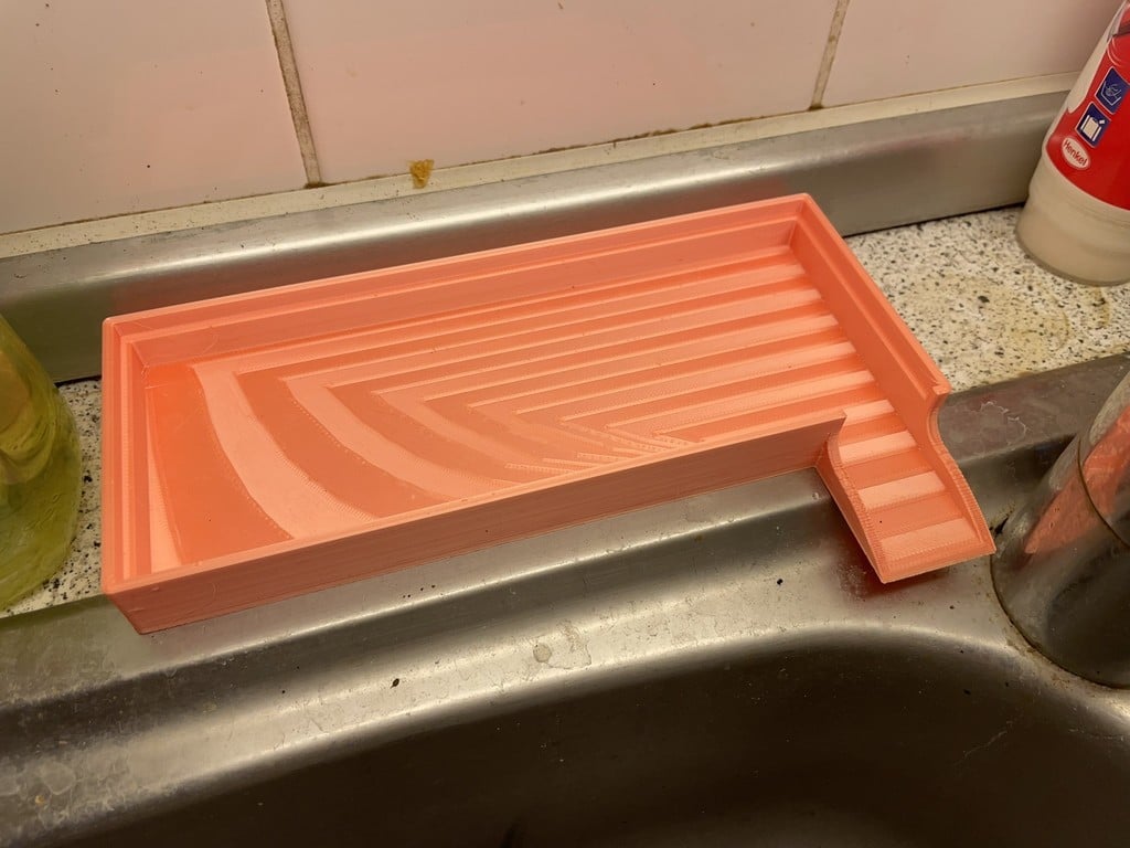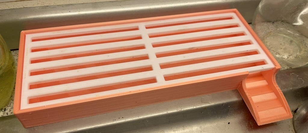 Organizerens dimensioner er velovervejede for at passe ind i de fleste standardkøkkenvaske. Basen måler 8 cm x 20 cm x 2 cm og inkluderer et afløb på 3,5 cm i længden og 3 cm i bredden. Selve racket måler 7,4 cm x 19,4 cm, og flaskeholderen har en højde på 13,8 cm, hvilket giver god plads til selv højere flasker.