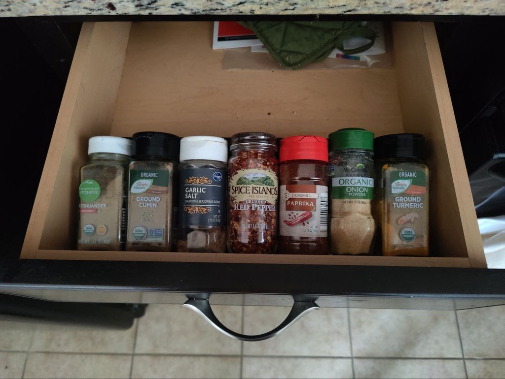 - Organiserer krydderikrukker effektivt i skuffen.