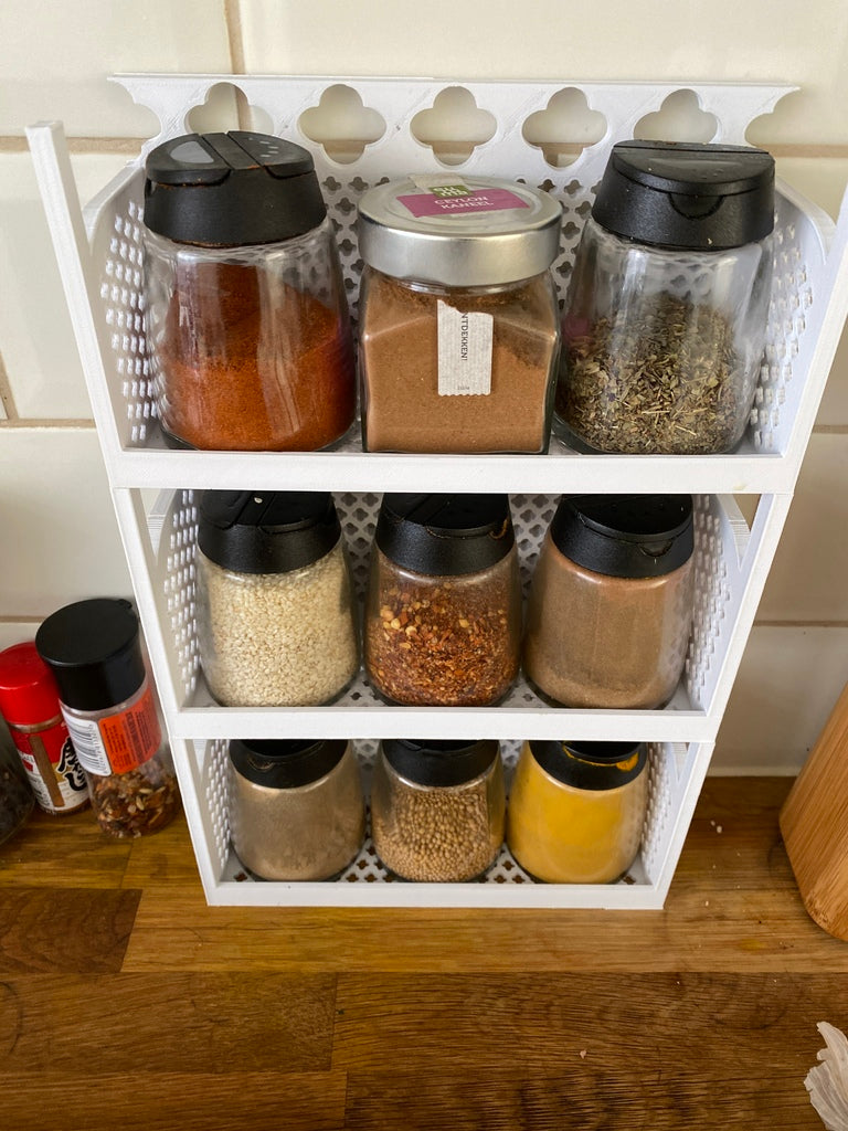 Denne krydderihylde er specielt designet til at passe perfekt til IKEA 365+ IHÄRDIG krydderiglas, hvilket giver en optimal krydderiopbevaring i dit køkken. Hylden kan rumme tre krydderiglas i en række, med tilstrækkelig plads over hvert glas for nem adgang og udtagning. For at maksimere opbevaringskapaciteten kan flere hylder stables ovenpå hinanden, hvilket giver en fleksibel og pladsbesparende løsning. Dette gør det nemt at holde dine krydderier organiseret og lige ved hånden, hvilket bidrager til en mere strømlinet madlavningsoplevelse.