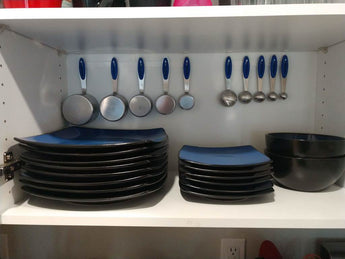Denne praktiske organisator er designet til at optimere din køkkenorganisation ved at give en dedikeret opbevaring til dine målekopper og skeer inde i skabet. Den monteres ubesværet ved at skydes ind på bagkanten af en eksisterende hylde, hvilket gør installationen hurtig og uden behov for værktøj. Holderen passer til standard skabshylder med en tykkelse på op til 19 mm (0,75 tommer). Hver plads på holderen er tydeligt markeret med størrelsen på den pågældende målekoppen eller skeen, hvilket sikrer, at du hurtigt finder den rette størrelse til din madlavning eller bagning. Denne pladsbesparende løsning hjælper med at holde dine essentielle køkkenredskaber inden for rækkevidde og skabet ryddeligt.