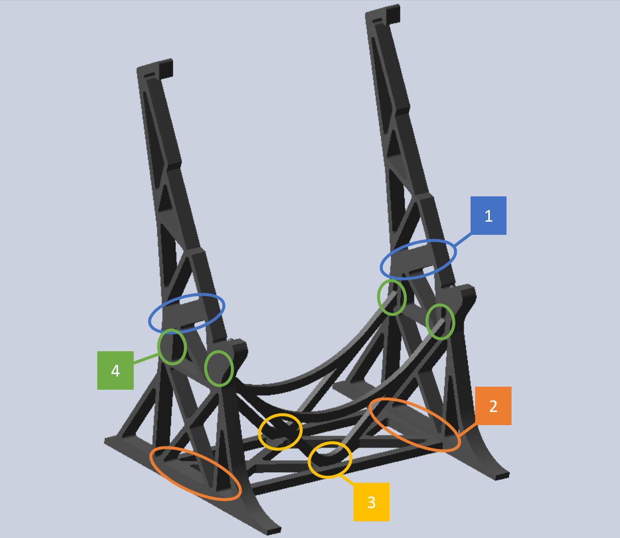 Ifølge billedet nedenfor skal du fastgøre krogformene (blå cirkler) til Falcon og klikke standeren fast i bunden ved hjælp af de små stop på standerens trin (orange cirkel).