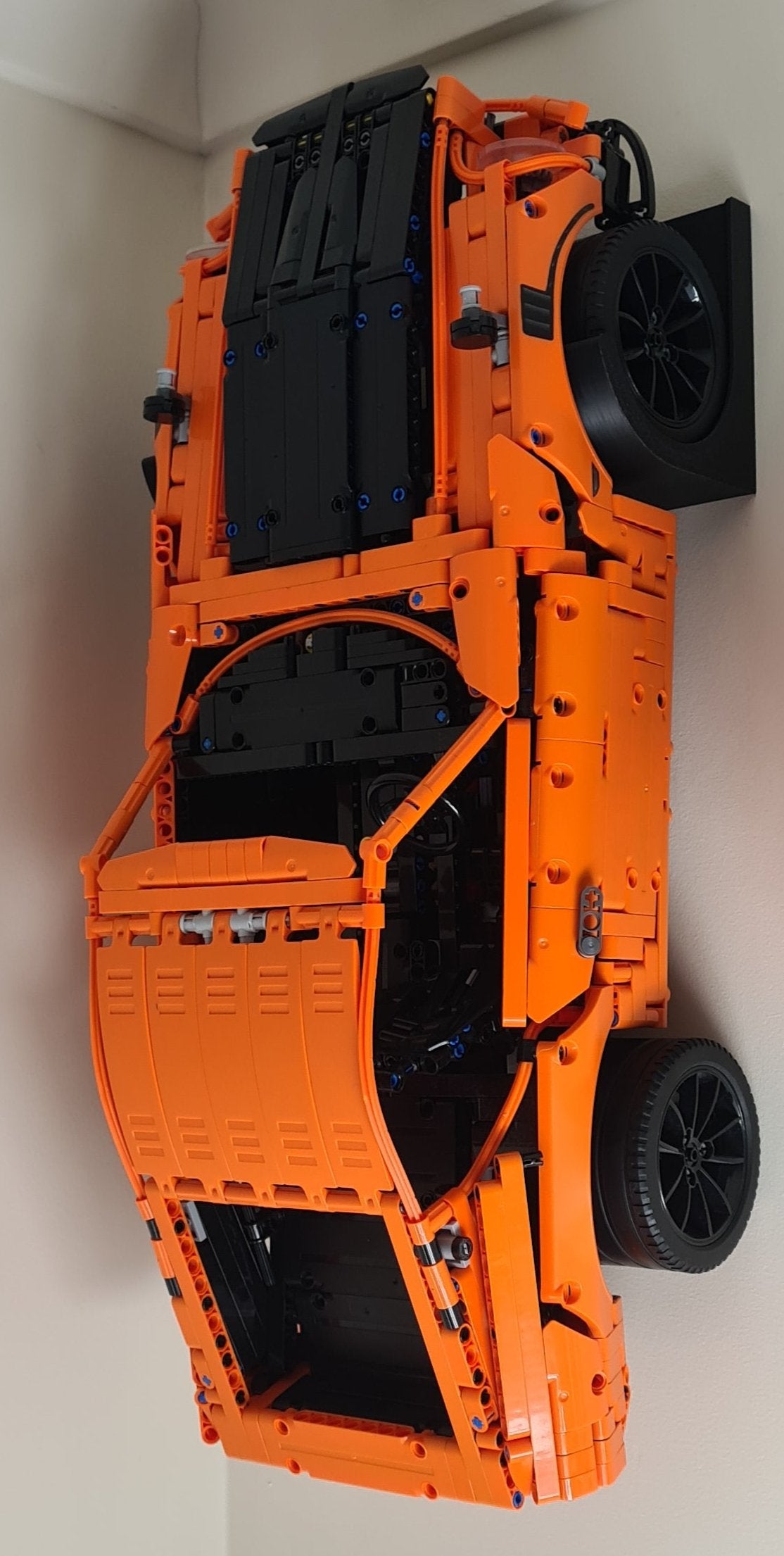 Et par skrue-på vægmonteringer til 1:8 skala lego-biler. Disse monteringer gør det muligt nemt at opbevare og fremvise dine lego-biler på væggen, hvilket ikke kun holder orden, men også fremhæver dine Lego-kreationer.
