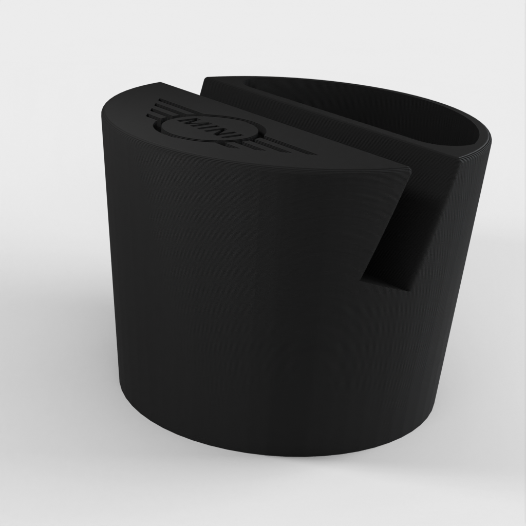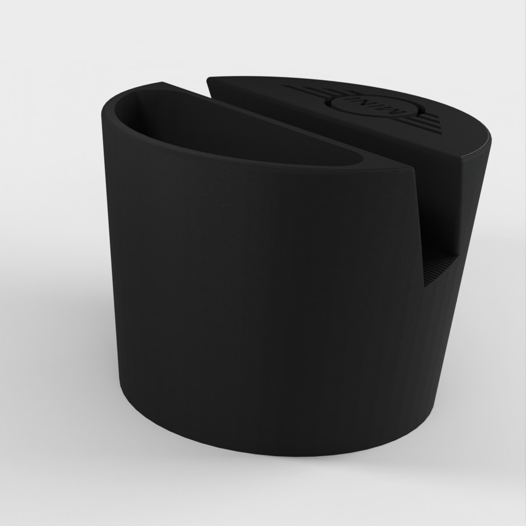 Telefonholder til en Mini Cooper bil, der er designet til at passe i kopholderen. Telefonholderen kan rumme telefoner op til 11mm i tykkelse og 75mm i bredden. Med Mini-logo og en hulning til små objekter som fjernbetjeninger. Hjælper med at holde din bil organiseret og sikrer, at din telefon altid er inden for rækkevidde.